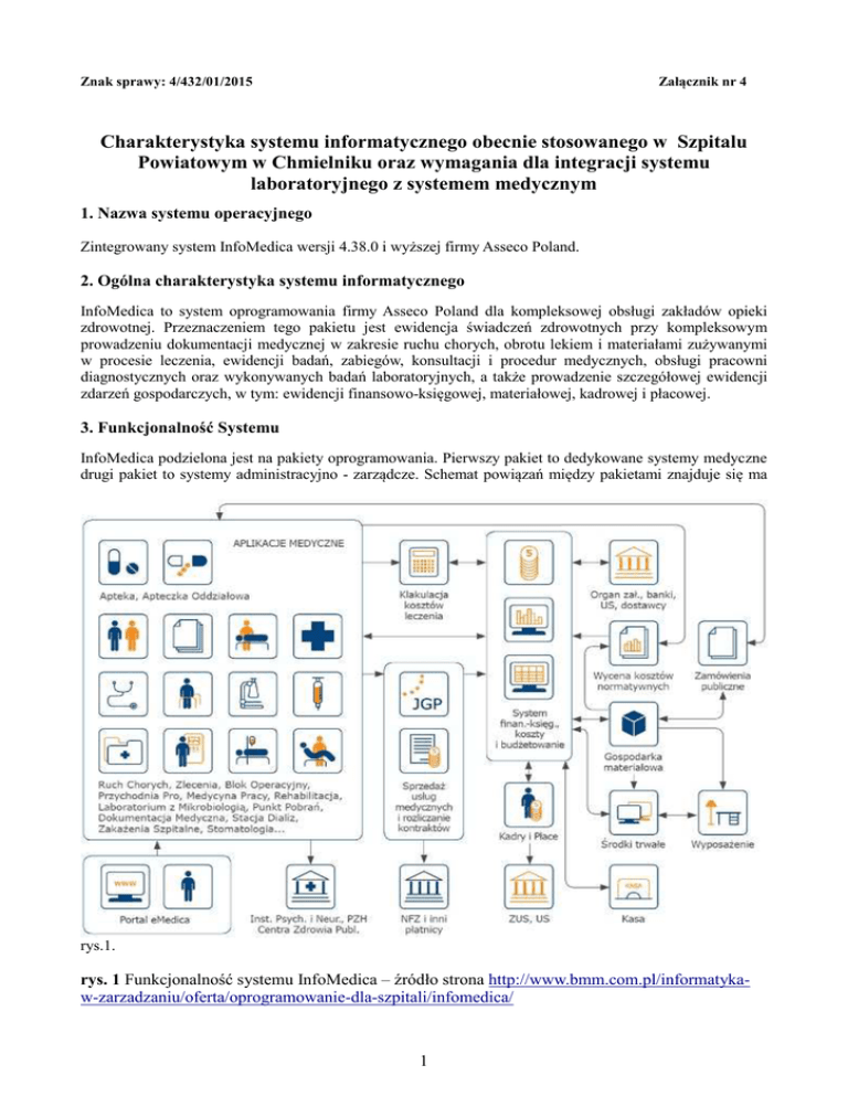 Znak sprawy: 4/432/01/2015 Załącznik nr 4 Charakterystyka systemu informatycznego obecnie stosowanego w Szpitalu Powiatowym w Chmielniku oraz wymagania dla integracji systemu laboratoryjnego z systemem medycznym 1. Nazwa systemu operacyjnego Zintegrowany system InfoMedica wersji 4.38.0 i wyższej firmy Asseco Poland. 2. Ogólna charakterystyka systemu informatycznego InfoMedica to system oprogramowania firmy Asseco Poland dla kompleksowej obsługi zakładów opieki zdrowotnej. Przeznaczeniem tego pakietu jest ewidencja świadczeń zdrowotnych przy kompleksowym prowadzeniu dokumentacji medycznej w zakresie ruchu chorych, obrotu lekiem i materiałami zużywanymi w procesie leczenia, ewidencji badań, zabiegów, konsultacji i procedur medycznych, obsługi pracowni diagnostycznych oraz wykonywanych badań laboratoryjnych, a także prowadzenie szczegółowej ewidencji zdarzeń gospodarczych, w tym: ewidencji finansowo-księgowej, materiałowej, kadrowej i płacowej. 3. Funkcjonalność Systemu InfoMedica podzielona jest na pakiety oprogramowania. Pierwszy pakiet to dedykowane systemy medyczne drugi pakiet to systemy administracyjno - zarządcze. Schemat powiązań między pakietami znajduje się ma rys.1. rys. 1 Funkcjonalność systemu InfoMedica – źródło strona http://www.bmm.com.pl/informatykaw-zarzadzaniu/oferta/oprogramowanie-dla-szpitali/infomedica/ 1 Znak sprawy: 4/432/01/2015 Załącznik nr 4 4. Wdrożone składniki systemu w Szpitalu Powiatowym w Chmielniku Systemy medyczne: Ruch Chorych: Izba Przyjęć, Oddział, Statystyka Zlecenia Blok Operacyjny Zakażenia szpitalne Pracownia Diagnostyczna Punkt Pobrań Laboratorium z mikrobiologią Apteka Apteczka Oddziałowa Przychodnia Pro (Rejestracja, Gabinet, Statystyka) Rehabilitacja Dokumentacja Medyczna Systemy administracyjno - zarządcze: Finanse-Księgowość Rejestr Sprzedaży Rejestr Zakupu (Podawczy) Kasa Windykacja Sprzedaż Usług Medycznych (rozliczanie umów komercyjnych) Wycena Kosztów Normatywnych Świadczeń Koszty (wycena kosztów rzeczywistych) Kalkulacja Kosztów Leczenia Budżetowanie Gospodarka Materiałowa Zamówienia wewnętrzne Obsługa zamówień i przetargów Środki trwałe Wyposażenie Elektroniczna inwentaryzacja Kadry Płace Ewidencja Czasu Pracy (Grafik) 5. Środowisko pracy, interfejs użytkownika InfoMedica jest systemem pracującym w środowisku Windows. Poszczególne składniki oprogramowania napisane są w interface okienkowym który obecnie jest standardem oprogramowania. Pakiet oprogramowania jest w języku polskim i umożliwia korzystanie z rozbudowanego sytemu podpowiedzi. Dzięki temu mamy możliwość wyboru z list automatycznie wypełnianych pół, szablonów, słowników (katalog leków, procedur medycznych, danych osobowych czy terytorialnych itp.) 2 Znak sprawy: 4/432/01/2015 Załącznik nr 4 6. Administrowanie pakietem System jest tak napisany że umożliwia kopię zapasową danych w trakcie jego pracy za pomocą (tzw back-upu). Administrator posiada możliwość pełnej konfiguracji parametrów systemowych tworzących pakiet oprogramowania InfoMedica. Istnieje również możliwość optymalizacji bazy danych oraz realizacji postanowień polityki bezpieczeństwa informacji. Ponadto możliwa jest pełna kontrola na użytkownikami pracującymi w systemie InfoMedica czyli (definicja haseł, czasu obowiązywania haseł, czasu logowania). 7. Współpraca z oprogramowaniem aplikacyjnym innych producentów Jak pisze producent "Pakiet InfoMedica spełnia normy dotyczące zakresu funkcjonalnego i użytkowego regulujące kształt systemów informatycznych dla sektora opieki zdrowotnej". System ma możliwość współpracy z oprogramowaniem specjalistycznym (aplikacje dla jednostek opieki zdrowotnej) w standardzie (np. HIM,HISA). Jak podaje producent możliwa jest również współpraca z oprogramowaniem specjalistyczny niezgodnym ze standardami po uzgodnieniu procedur wymiany danych. InfoMedica posiada rozbudowany moduł przekazujący dane statystyczne drogą elektroniczną do jednostek nadrzędnych np. PZH Istnieje możliwość przekazywanie drogą elektroniczną informacji o płatnościach i pobieranie informacji o zrealizowanych przelewach za pośrednictwem systemu home banking. Pakiet InfoMedica posiada mechanizmy wymiany danych z systemem świadczeń płatników w odpowiednich oddziałach NFZ. Następną cechą tego sytemu jest możliwość wymiany danych kadrowych i płacowych (dokumentów zgłoszeniowych i rozliczeniowych) z systemem ZUS Płatnik. 8. Współpraca z oprogramowaniem biurowym Moduły pakietu InfoMedica mają możliwość przekazywania analiz, sprawozdań, do modułów pakietu MS Office, Open Office. Pliki przekazywane są w formatach MS Excel, MS World dla pakietu MSOffice oraz formatach dla OpenOffice writer, OpenOffice calk. Za pomocą mechanizmów OLE, InfoMedica uruchamia odpowiedni moduł pakietu MS office i prezentuje dane w formie tabeli czy pisma. Ponadto wszystkie moduły InfoMedica są przystosowane do przekazywania tabel,zestawień, wykazów poprzez schowek do dowolnej aplikacji pracującej w Środowisku MS Windows. 9. Współpraca z urządzeniami do automatycznego wprowadzania danych InfoMedica umożliwia wprowadzanie danych za pomocą czytników paskowych – przykładowo kodów materiałów do badań laboratoryjnych, kodów leków. W wypadku pakietu laboratoryjnego możliwe jest automatyczne pobieranie i gromadzenie badań z urządzeń laboratoryjnych i diagnostycznych. 10. Bezpieczeństwo i poufność danych w pakiecie Jak pisze dostawca oprogramowania "Technologia zastosowana do produkcji pakietu zapewnia dużą odporność struktur danych (baz danych) na uszkodzenia oraz szybkie odtworzenie ich zawartości i właściwego stanu, jak również łatwość wykonania ich kopii bieżących. Wszystkie moduły pakietu są wyposażone w zabezpieczenia przed nieautoryzowanym dostępem. 3 Znak sprawy: 4/432/01/2015 Załącznik nr 4 Pakiet jest zabezpieczony na poziomie 