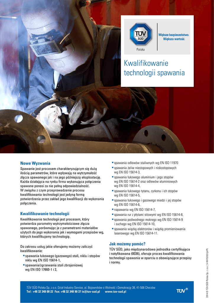 Kwalifikowanie technologii spawania Spawanie jest procesem charakteryzującym się dużą ilością parametrów, które wpływają na wytrzymałość złącza spawanego jak i na jego późniejszą eksploatację. Każda działająca na rynku firma wykonująca połączenia spawane ponosi za nie pełną odpowiedzialność. W związku z czym przeprowadzenie procesu kwalifikowania technologii jest jedyną formą potwierdzenia przez zakład jego kwalifikacji do wykonania połączenia. Kwalifikowanie technologii Kwalifikowanie technologii jest procesem, który potwierdza parametry wytrzymałościowe złącza spawanego, porównując je z parametrami materiałów użytych do jego wykonania jak i wymogami przepisów wg, których kwalifikujemy technologię. Do zakresu usług jakie oferujemy możemy zaliczyć kwalifikowanie: spawania łukowego (gazowego) stali, niklu i stopów niklu wg EN ISO 15614-1, spawania/zgrzewania stali zbrojeniowej wg EN ISO 17660-1 i 2, spawania odlewów staliwnych wg EN ISO 11970 spawania żeliw niestopowych i niskostopowych wg EN ISO 15614-3, spawania łukowego aluminium i jego stopów wg EN ISO 15614-2 oraz odlewów aluminiowych wg EN ISO 15614-4, spawania łukowego tytanu, cyrkonu i ich stopów wg EN ISO 15614-5, spawania łukowego i gazowego miedzi i jej stopów wg EN ISO 15614-6, napawania wg EN ISO 15614-7, spawania rur z płytami sitowymi wg EN ISO 15614-8, spawania podwodnego mokrego wg EN ISO 15614-9 i suchego wg EN ISO 15614-10, spawania wiązką elektronów i wiązką promieniowania laserowego wg EN ISO 15614-11. Jak możemy pomóc? TÜV SÜD, jako międzynarodowa jednostka certyfikująca i notyfikowana (0036), oferuje proces kwalifikowania technologii spawania w oparciu o obowiązujące przepisy i normy. TÜV SÜD Polska Sp. z o.o. Dział Industry Service, al. Bojowników o Wolność i Demokrację 38, 41-506 Chorzów Tel : +48 32 348 00 22 Fax: +48 32 348 90 37 [email protected] www.tuv-sud.pl 2014 © TÜV SÜD Polska Sp. z .o.o. | V-IM/IS/8.0/pl/PL Nowe Wyzwania