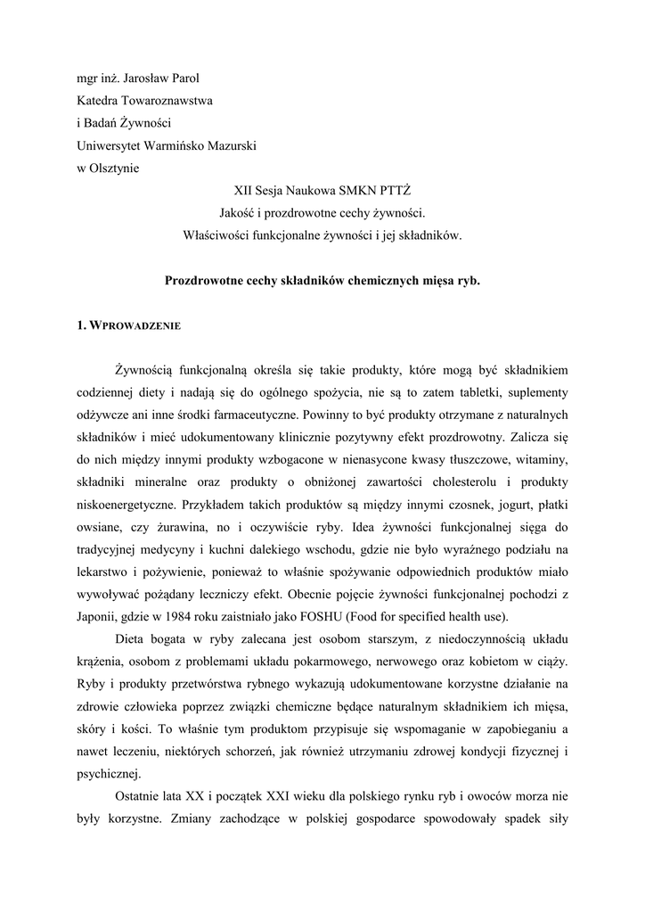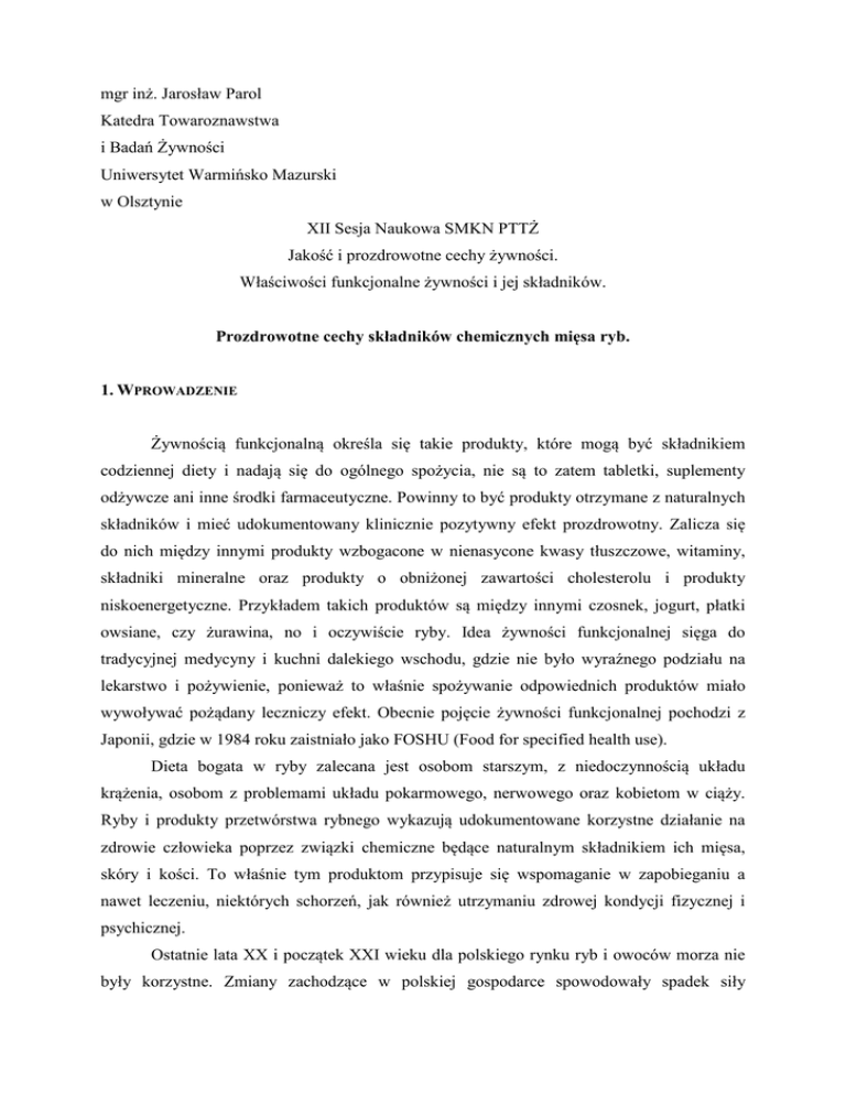 mgr inż. Jarosław Parol Katedra Towaroznawstwa i Badań Żywności Uniwersytet Warmińsko Mazurski w Olsztynie XII Sesja Naukowa SMKN PTTŻ Jakość i prozdrowotne cechy żywności. Właściwości funkcjonalne żywności i jej składników. Prozdrowotne cechy składników chemicznych mięsa ryb. 1. WPROWADZENIE Żywnością funkcjonalną określa się takie produkty, które mogą być składnikiem codziennej diety i nadają się do ogólnego spożycia, nie są to zatem tabletki, suplementy odżywcze ani inne środki farmaceutyczne. Powinny to być produkty otrzymane z naturalnych składników i mieć udokumentowany klinicznie pozytywny efekt prozdrowotny. Zalicza się do nich między innymi produkty wzbogacone w nienasycone kwasy tłuszczowe, witaminy, składniki mineralne oraz produkty o obniżonej zawartości cholesterolu i produkty niskoenergetyczne. Przykładem takich produktów są między innymi czosnek, jogurt, płatki owsiane, czy żurawina, no i oczywiście ryby. Idea żywności funkcjonalnej sięga do tradycyjnej medycyny i kuchni dalekiego wschodu, gdzie nie było wyraźnego podziału na lekarstwo i pożywienie, ponieważ to właśnie spożywanie odpowiednich produktów miało wywoływać pożądany leczniczy efekt. Obecnie pojęcie żywności funkcjonalnej pochodzi z Japonii, gdzie w 1984 roku zaistniało jako FOSHU (Food for specified health use). Dieta bogata w ryby zalecana jest osobom starszym, z niedoczynnością układu krążenia, osobom z problemami układu pokarmowego, nerwowego oraz kobietom w ciąży. Ryby i produkty przetwórstwa rybnego wykazują udokumentowane korzystne działanie na zdrowie człowieka poprzez związki chemiczne będące naturalnym składnikiem ich mięsa, skóry i kości. To właśnie tym produktom przypisuje się wspomaganie w zapobieganiu a nawet leczeniu, niektórych schorzeń, jak również utrzymaniu zdrowej kondycji fizycznej i psychicznej. Ostatnie lata XX i początek XXI wieku dla polskiego rynku ryb i owoców morza nie były korzystne. Zmiany zachodzące w polskiej gospodarce spowodowały spadek siły nabywczej społeczeństwa. Brak zdrowych tradycji żywieniowych Polaków, za wyjątkiem Świąt Bożego Narodzenia i Świąt Wielkiej Nocy, przy cenach przetworów rybnych porównywalnych z cenami mięsa zwierząt rzeźnych, powodowały spadek i tak już niskiego spożycia. Jednakże obserwowane tendencje od roku 2002 optymistycznie wskazują na poprawę sytuacji, zaczynamy dostrzegać potrzebę zdrowego jedzenia, a wzrost świadomości konsumentów skutkuje coraz większym spożyciem ryb i przetworów rybnych w Polsce (wykres 1). Wykres 1 Spożycie ryb w Polsce w latach 1990-2003 w kg/osobę Spożycie w kg/os 19 18,0 16,5 16,3 16,4 17 14,6 15 14,0 13,5 13,5 13,0 12,5 13 1110,0 10,1 10,0 10,5 9 2003 2002 2001 2000 1999 1998 1997 1996 1995 1994 1993 1992 1991 1990 Lata Spożycie ryb w Polsce w kg/osobę w latach 1990-2003 Źródło: Opracowanie własne na podstawie: W. Sekuła, K. Figurska „Spożycie żywności w latach 90 w Polsce” Przemysł Spożywczy nr 6/2001 s. 3, J. Okrzesik „Przetwórstwo Rybne” Boss Gospodarka nr 4/2001, nr 27/2002, nr 41/2003, dane z MIR, dane z GUS Wykorzystując obecnie przyjęte klasyfikacje produktów spożywczych ryby i produkty przetwórstwa rybnego można zakwalifikować do nietrwałych konsumpcyjnych produktów częstego zakupu, zaspokajających potrzebę zdrowego jedzenia, przeznaczonych dla finalnego konsumenta do użytkowania osobistego, bądź zużytkowania w gospodarstwie domowym. Podstawowy podział ryb oparty jest na rodzaju środowiska wodnego, w jakim żyją i są to: ryby słodkowodne i słonowodne, choć oczywiście występują w naturze ryby dwuśrodowiskowe (np. rekin). Również ze względu na zawartość tłuszczu w mięsie ryby dzielimy na chude, średniotłuste, tłuste i pełnotłuste. Natomiast podział produktów rybnych jest już zdecydowanie bardziej skomplikowany i obejmuje: ryby świeże, chłodzone i mrożone, ryby suszone, solone, wędzone (całe, patroszone, tusze, odgłowione, w kawałkach), paluszki rybne, wątróbki rybne, ikra, kawior, mączka rybna oraz bardzo szeroka gama produktów przetworzonych i zakonserwowanych. 2. SKŁAD CHEMICZNY MIĘSA RYB Skład mięsa ryb jest podobny do mięsa zwierząt rzeźnych i drobiu. Jednak ryby zawierają więcej wody i mniej białek tkanki łącznej, a przez to wartość energetyczna produktów rybnych, z wyjątkiem ryb bardzo tłustych, jest niższa niż innych produktów pochodzenia zwierzęcego. Nieduża zawartość kolagenu i śladowe ilości elastyny sprawiają, że mięso ryb jest łatwo strawne (dla białka ryb strawność wynosi 97%) i szybciej uzyskuje gotowość kulinarną. Porcja 100g ryby może, więc w dużym stopniu pokryć dzienne zapotrzebowanie człowieka na składniki odżywcze, ale istotne jest, czy spożywa się rybę chudą (np. dorsz) czy tłustą (np. śledź). Produkty rybne mają niską wartość energetyczną, gdyż zależy ona praktycznie od zawartości lipidów i jest względnie stała w grupie ryb chudych i bezkręgowców, a najbardziej waha się w grupie tłustych ryb morskich. Przykładem może być wartość energetyczna 100 g fileta z dorsza, która wynosi 75 kcal, a śledzia waha się od 80 do 280 kcal, ponieważ wykazuje on duże zmiany sezonowe zawartości lipidów w mięsie (od 3 do 20%). Porcja 100g ryby dostarcza od 1 do około 300kcal. Podstawowy skład chemiczny mięsa ryb: • 63-78% wody (u ryb morskich nawet do 93%), • 15-19% białka, • 1-20% tłuszczu (lipidy), • 0,1% sacharydów (głównie glikogen). Wahania zawartości lipidów zależą od gatunku i czynników biologicznych. Pod względem zawartości tłuszczu w mięsie, ryby dzielimy na cztery grupy (tabela 1). Tabela 1 Podział ryb ze względu na zawartość tłuszczu w mięsie Kategoria Zawartość lipidów, % Typowe gatunki Chude 0,2-2 dorsz, łupacz, czarniak, witlinek, morszczuk, mintaj, błękitek Średniotłuste 2-7 p