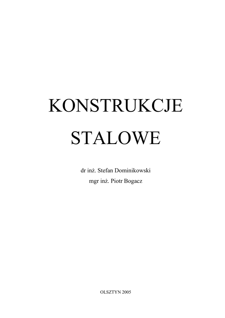 KONSTRUKCJE STALOWE dr in . Stefan Dominikowski mgr in . Piotr Bogacz OLSZTYN 2005 SPIS TRE*CI 1 Podstawowe wiadomo,ci o stali.......................................................................................str. 3 1.1 Troch0 historii................................................................................................................str. 3 1.2 Zastosowanie stali.........................................................................................................str. 4 1.3. Produkowany asortyment stali......................................................................................str. 4 1.4. Stopy elaza na tle wykresu elazo-w0giel...................................................................str. 4 1.5 Mikrostruktura stali........................................................................................................str. 9 1.6 Obróbka cieplna stali......................................................................................................str. 13 1.7 W<asno,ci mechaniczne stali..........................................................................................str. 16 1.8 Klasyfikacja przekrojów wed<ug PN-90/B-03200..........................................................str. 16 1.9 Wykres @(B).....................................................................................................................str. 18 1.10 Zadania..........................................................................................................................str. 20 2 Po<Dczenia spawane............................................................................................................str. 25 2.1 Elektrody stosowane w konstrukcjach stalowych...........................................................str. 25 2.2 Rodzaje spoin..................................................................................................................str. 25 2.3. Po<Dczenia na spoiny czo<owe........................................................................................str. 26 2.4 Po<Dczenia na spoiny pachwinowe.................................................................................str. 28 2.5 Wymagania normowe po<DczeE spawanych...................................................................str. 29 2.6 Zadania............................................................................................................................str. 30 3 Po<Dczenia punktowe..........................................................................................................str. 51 3.1 Podzia< po<DczeE..............................................................................................................str. 53 3.2 Kategorie po<DczeE..........................................................................................................str. 54 3.3 Wymagania dotyczDce po<DczeE punktowych wg.PN-90/B-03200................................str. 57 3.4. Projektowanie po<DczeE.................................................................................................str. 58 3.5 Po<Dczenia zak<adkowe zginane......................................................................................str. 60 3.6 Po<Dczenia zak<adkowe cierne.........................................................................................str. 63 3.7 Po<Dczenia doczo<owe.....................................................................................................str. 67 3.8 Zadania............................................................................................................................str. 73 4 Wyboczenie........................................................................................................................str. 90 4.1 Wiadomo,ci wst0pne.......................................................................................................str. 90 4.2 Ca<kowanie równania odkszta<conej, okre,lenie wsp. d<. wyboczeniowej.....................str. 90 4.3 Równowaga statyczna pr0tów ,ciskanych......................................................................str. 94 4.4. Zadanie..........................................................................................................................str. 97 5 Zginanie.............................................................................................................................str.121 5.1 Przekroje jednokierunkowo zginane............................................................................str.121 5.2 Przekroje dwukierunkowo zginane................................................................................str.127 5.3 No,no,G belek zginanych z uwzgl0dnieniem dodatkowego ,ciskania..........................str.130 5.4 *rodnik belki pod obciD eniem skupionym...................................................................str.132 5.5 Przekroje klasy IV pracujDce w stanie nadkrytycznym.................................................str.134 6 Procedura projektowania hali (ROBOT MILLENNIUM)...............................................str.138 ZAIJCZNIK 1...................................................................................................................str.171 ZAIJCZNIK 2...................................................................................................................str.172 ZAIJCZNIK 3...................................................................................................................str.174 ZAIACZNIK 4...................................................................................................................str.176 ZAIJCZNIK 5...................................................................................................................str.185 2 Rozdzia 1 Podstawowe wiadomo ci o stali. 1.1 Troch historii Kelazo jest jednym z najpopularniejszych metali znajdujDcych si0 w skorupie ziemskiej. Mo na go znaleLG niemal wsz0dzie, w po<Dczeniu z innymi pierwiastkami, w postaci rudy. W Europie wytwarzanie elaza
