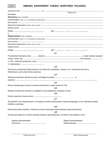 UMOWA DAROWIZNY CZĘŚCI WARTOŚCI POJAZDU WKI/G zawarta w dniu ........................................................... w ...................................................................................................................................................................... Miejscowość pomiędzy: Darczyńcą (imię i nazwisko) ................................................................................................................................................................................................................. zamieszkałym (ulica i nr, nr mieszkania, miejscowość) kod, poczta ............................................................................................................................................................................................................................................... dokument toŜsamości (nazwa, seria i numer) wydany przez .............................................................................................................................................................................. ......................................................................................................................................................................................................................................... PESEL a Obdarowanym (imię i nazwisko) NIP –– –– –– ...................................................................................................................................................................................................... zamieszkałym (ulica i nr, nr mieszkania, miejscowość) kod, poczta ................................................................................................................................................................ ................................................................................................................................................................ ............................................................................. dokument toŜsamości (nazwa, seria i numer) wydany przez .............................................................................................................................................................................. ......................................................................................................................................................................................................................................... NIP PESEL –– –– –– §1 Przedmiotem darowizny jest .................. (słownie: .......................................................................................................) część wartości pojazdu: rodzaj, marka, typ ............................................................................................................................................................... nr VIN / nadwozia (podwozia, ramy) rok produkcji .................................. .................................................................................................................................... nr rejestracyjny .................................................................. §2 Darczyńca przekazuje Obdarowanemu na własność, bezpłatnie, opisany w § 1 przedmiot darowizny, Obdarowany zaś tę darowiznę przyjmuje. §3 Wartość przedmiotu darowizny strony określają na kwotę ........................................................ zł (słownie: .................................................................................................................................................................................................................................). §4 Strony oświadczają, Ŝe jest to pierwsza darowizna w ciągu ostatnich 5 lat. §5 Wydanie przedmiotu darowizny nastąpiło w dniu podpisania niniejszej umowy. §6 Koszty zawarcia umowy ponosi .............................................................................. §7 W sprawach nie uregulowanych w niniejszej umowie zastosowanie mają obowiązujące w tym zakresie przepisy Kodeksu cywilnego. §8 Ewentualne spory wynikłe z realizacji umowy rozstrzygać będą właściwe sądy powszechne. §9 Umowę sporządzono w dwóch jednobrzmiących egzemplarzach, po jednym dla kaŜdej ze stron. Stopień pokrewieństwa Stopień pokrewieństwa Darczyńcy – ................................................................... Obdarowanego – Podpis Darczyńcy ................................................... Podpis Obdarowanego