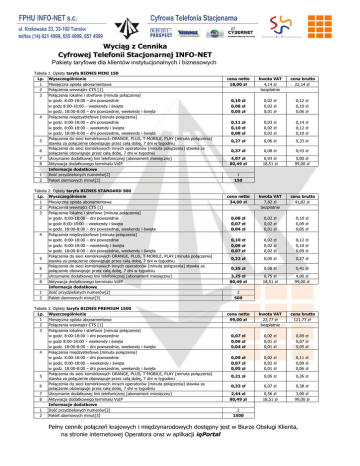 Wyciąg z Cennika Cyfrowej Telefonii Stacjonarnej INFO-NET Pakiety taryfowe dla klientów instytucjonalnych i biznesowych Tabela Lp. 1 2 3 4 5 6 7 8 1 2 Tabela Lp. 1 2 3 4 5 6 7 8 1 2 Tabela Lp. 1 2 3 4 5 6 7 8 1 2 1. Opłaty taryfa BIZNES MINI 150 Wyszczególnienie Miesięczna opłata abonamentowa Połączenia wewnątrz CTS [1] Połączenia lokalne i strefowe [minuta połączenia] w godz. 8:00-18:00 – dni powszednie w godz 8:00-18:00 – weekendy i święta w godz. 18:00-8:00 – dni powszednie, weekendy i święta Połączenia międzystrefowe [minuta połączenia] w godz. 8:00-18:00 – dni powszednie w godz. 8:00-18:00 – weekendy i święta w godz. 18:00-8:00 – dni powszednie, weekendy i święta Połączenia do sieci komórkowych ORANGE, PLUS, T-MOBILE, PLAY [minuta połączenia] stawka za połączenie obowiązuje przez całą dobę, 7 dni w tygodniu Połączenia do sieci komórkowych innych operatorów [minuta połączenia] stawka za połączenie obowiązuje przez całą dobę, 7 dni w tygodniu Utrzymanie dodatkowej linii telefonicznej [abonament miesięczny] Aktywacja dodatkowego terminalu VoIP Informacje dodatkowe Ilość przydzielonych numerów[2] Pakiet darmowych minut[3] 2. Opłaty taryfa BIZNES STANDARD 500 Wyszczególnienie Miesięczna opłata abonamentowa Połączenia wewnątrz CTS [1] Połączenia lokalne i strefowe [minuta połączenia] w godz. 8:00-18:00 – dni powszednie w godz 8:00-18:00 – weekendy i święta w godz. 18:00-8:00 – dni powszednie, weekendy i święta Połączenia międzystrefowe [minuta połączenia] w godz. 8:00-18:00 – dni powszednie w godz. 8:00-18:00 – weekendy i święta w godz. 18:00-8:00 – dni powszednie, weekendy i święta Połączenia do sieci komórkowych ORANGE, PLUS, T-MOBILE, PLAY [minuta połączenia] stawka za połączenie obowiązuje przez całą dobę, 7 dni w tygodniu Połączenia do sieci komórkowych innych operatorów [minuta połączenia] stawka za połączenie obowiązuje przez całą dobę, 7 dni w tygodniu Utrzymanie dodatkowej linii telefonicznej [abonament miesięczny] Aktywacja dodatkowego terminalu VoIP Informacje dodatkowe Ilość przydzielonych numerów[2] Pakiet darmowych minut[3] 3. Opłaty taryfa BIZNES PREMIUM 1500 Wyszczególnienie Miesięczna opłata abonamentowa Połączenia wewnątrz CTS [1] Połączenia lokalne i strefowe [minuta połączenia] w godz. 8:00-18:00 – dni powszednie w godz 8:00-18:00 – weekendy i święta w godz. 18:00-8:00 – dni powszednie, weekendy i święta Połączenia międzystrefowe [minuta połączenia] w godz. 8:00-18:00 – dni powszednie w godz. 8:00-18:00 – weekendy i święta w godz. 18:00-8:00 – dni powszednie, weekendy i święta Połączenia do sieci komórkowych ORANGE, PLUS, T-MOBILE, PLAY [minuta połączenia] stawka za połączenie obowiązuje przez całą dobę, 7 dni w tygodniu Połączenia do sieci komórkowych innych operatorów [minuta połączenia] stawka za połączenie obowiązuje przez całą dobę, 7 dni w tygodniu Utrzymanie dodatkowej linii telefonicznej [abonament miesięczny] Aktywacja dodatkowego terminalu VoIP Informacje dodatkowe Ilość przydzielonych numerów[2] Pakiet darmowych minut[3] cena netto 18,00 zł kwota VAT 4,14 zł bezpłatnie cena brutto 22,14 zł 0,10 zł 0,08 zł 0,05 zł 0,02 zł 0,02 zł 0,01 zł 0,12 zł 0,10 zł 0,06 zł 0,11 zł 0,10 zł 0,08 zł 0,03 zł 0,02 zł 0,02 zł 0,14 zł 0,12 zł 0,10 zł 0,27 zł 0,06 zł 0,33 zł 0,37 zł 0,08 zł 0,43 zł 4,07 zł 80,49 zł 0,93 zł 18,51 zł 5,00 zł 99,00 zł cena netto 34,00 zł kwota VAT 7,82 zł bezpłatnie cena brutto 41,82 zł 0,08 zł 0,07 zł 0,04 zł 0,02 zł 0,02 zł 0,01 zł 0,10 zł 0,09 zł 0,05 zł 0,10 zł 0,08 zł 0,07 zł 0,02 zł 0,02 zł 0,02 zł 0,12 zł 0,10 zł 0,09 zł 0,22 zł 0,05 zł 0,27 zł 0,35 zł 0,08 zł 0,41 zł 3,25 zł 80,49 zł 0,75 zł 18,51 zł 4,00 zł 99,00 zł cena netto 99,00 zł kwota VAT 22,77 zł bezpłatnie cena brutto 121,77 zł 0,07 zł 0,06 zł 0,04 zł 0,02 zł 0,01 zł 0,01 zł 0,09 zł 0,07 zł 0,05 zł 0,09 zł 0,07 zł 0,05 zł 0,02 zł 0,02 zł 0,01 zł 0,11 zł 0,09 zł 0,06 zł 0,21 zł 0,05 zł 0,26 zł 0,33 zł 0,07 zł 0,38 zł 2,44 zł 80,49 zł 0,56 zł 18,51 zł 3,00 zł 99,00 zł 1 150 2 500 2 1500 Pełny cennik połączeń krajowych i międzynarodowych dostępny jest w Biurze Obsługi Klienta, na stronie internetowej Operatora oraz w aplikacji iqPortal Tabela 3. Opłaty za połączenia specjalne [minuta połączenia, chyba że opis stanowi inaczej] Lp. Wyszczególnienie 1 2 3 4 5 6 7 8 9 10 11 12 13 14 15 16 17 18 19 20 21 22 23 24 25 26 27 28 29 30 31 32 33 34 35 36 37 38 39 40 41 42 43 44 45 46 47 48 49 50 51 52 Połączenia do numerów ASI (numery skrócone rozpoczynające się od cyfry 1, z wyjątkiem wyspecyfikowanych osobno w cenniku) Połączenia do numerów ASI 19229 Połączenia do numerów AUS Radio Taxi Połączenia do numerów ze wskaźnikiem 700-1, 701-1, 703-1, 708-1 Połączenia do numerów ze wskaźnikiem 700-2, 701-2, 703-2, 708-2 Połączenia do numerów ze wskaźnikiem 700-3, 701-3, 703-3, 708-3 Połączenia do numerów ze wskaźnikiem 700-4, 701-4, 703-4, 708-4 Połączenia do numerów ze wskaźnikiem 700-5, 701-5, 703-5, 708-5 Połączenia do numerów ze wskaźnikiem 700-6, 701-6, 703-6, 708-6 Połączenia do numerów ze wskaźnikiem 700-7, 701-7, 703-7, 708-7 Połączenia do numerów ze wskaźnikiem 700-8, 701-8, 703-8, 708-8 Połączenia do numerów ze wskaźnikiem 700-9, 701-9, 703-9, 708-9 [opłata za połączenie] Połączenia do numerów ze wskaźnikiem 707-1 [opłata za połączenie] Połączenia do numerów ze wskaźnikiem 707-2, 704-0 [opłata za połączenie] Połączenia do numerów ze wskaźnikiem 707-3, 704-1 [opłata za połączenie] Połączenia do numerów ze wskaźnikiem 707-4 [opłata za połączenie] Połączenia do numerów ze wskaźnikiem 704-2 [opłata za połączenie] Połączenia do numerów ze wskaźnikiem 707-5 [opłata za połączenie] Połączenia do numeró