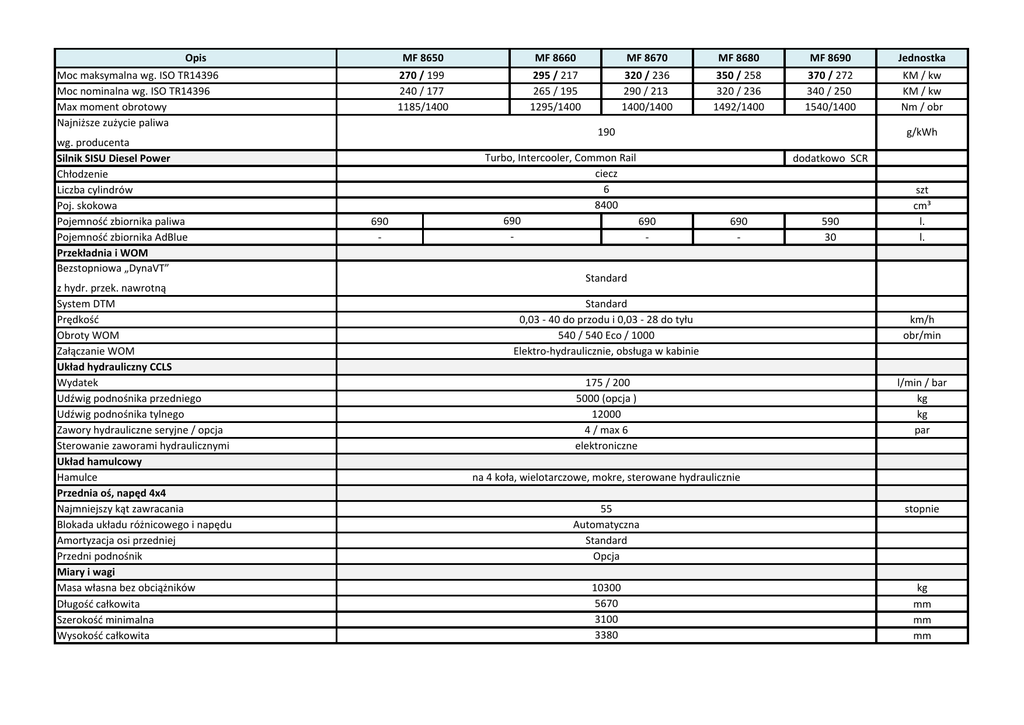 Opis Moc maksymalna wg. ISO TR14396 Moc nominalna wg. ISO TR14396 Max moment obrotowy Najniższe zużycie paliwa wg. producenta Silnik SISU Diesel Power Chłodzenie Liczba cylindrów Poj. skokowa Pojemność zbiornika paliwa Pojemność zbiornika AdBlue Przekładnia i WOM Bezstopniowa „DynaVT” z hydr. przek. nawrotną System DTM Prędkość Obroty WOM Załączanie WOM Układ hydrauliczny CCLS Wydatek Udźwig podnośnika przedniego Udźwig podnośnika tylnego Zawory hydrauliczne seryjne / opcja Sterowanie zaworami hydraulicznymi Układ hamulcowy Hamulce Przednia oś, napęd 4x4 Najmniejszy kąt zawracania Blokada układu różnicowego i napędu Amortyzacja osi przedniej Przedni podnośnik Miary i wagi Masa własna bez obciążników Długość całkowita Szerokość minimalna Wysokość całkowita MF 8650 MF 8660 MF 8670 MF 8680 MF 8690 Jednostka 270 / 199 240 / 177 1185/1400 295 / 217 265 / 195 1295/1400 320 / 236 290 / 213 1400/1400 350 / 258 320 / 236 1492/1400 370 / 272 340 / 250 1540/1400 KM / kw KM / kw Nm / obr 190 690 - Turbo, Intercooler, Common Rail ciecz 6 8400 690 690 - g/kWh dodatkowo SCR 690 - 590 30 szt cm³ l. l. Standard Standard 0,03 - 40 do przodu i 0,03 - 28 do tyłu 540 / 540 Eco / 1000 Elektro-hydraulicznie, obsługa w kabinie 175 / 200 5000 (opcja ) 12000 4 / max 6 elektroniczne km/h obr/min l/min / bar kg kg par na 4 koła, wielotarczowe, mokre, sterowane hydraulicznie 55 Automatyczna Standard Opcja stopnie 10300 5670 3100 3380 kg mm mm mm Amortyzowana pneumatycznie, klimatyzacja automatyczna, komputer Datatronic 4, kpl. oświetlenie robocze, siedzenie operatora amortyzowane pneumatycznie, siedzenie pasażera, Kabina wycieraczka tylnej szyby, regulowana kolumna kierownicy w dwóch płaszczyznach. Producent zastrzega sobie prawo do zmian. Dane techniczne, wymiary i ciężar mogą się zmienić i nie są wiążące. Ilustracje mogą odbiegać od rzeczywistości i mogą się na nich znajdować elementy znajdujące się na wyposażeniu dodatkowym. Odnośnie wyposażenia technicznego, prosimy o skontaktowanie się ze Sprzedawcą maszyn Massey Ferguson. Na zdjęciach, czasami, zostały zdjęte osłony i elementy zabezpieczające w celu lepszego przedstawienia działania. Wszystkie maszyny znajdujące się w ofercie są zgodne z aktualnie obowiązującymi normami dotyczącymi maszyn rolniczych. Strona internetowa nie stanowi oferty handlowej.