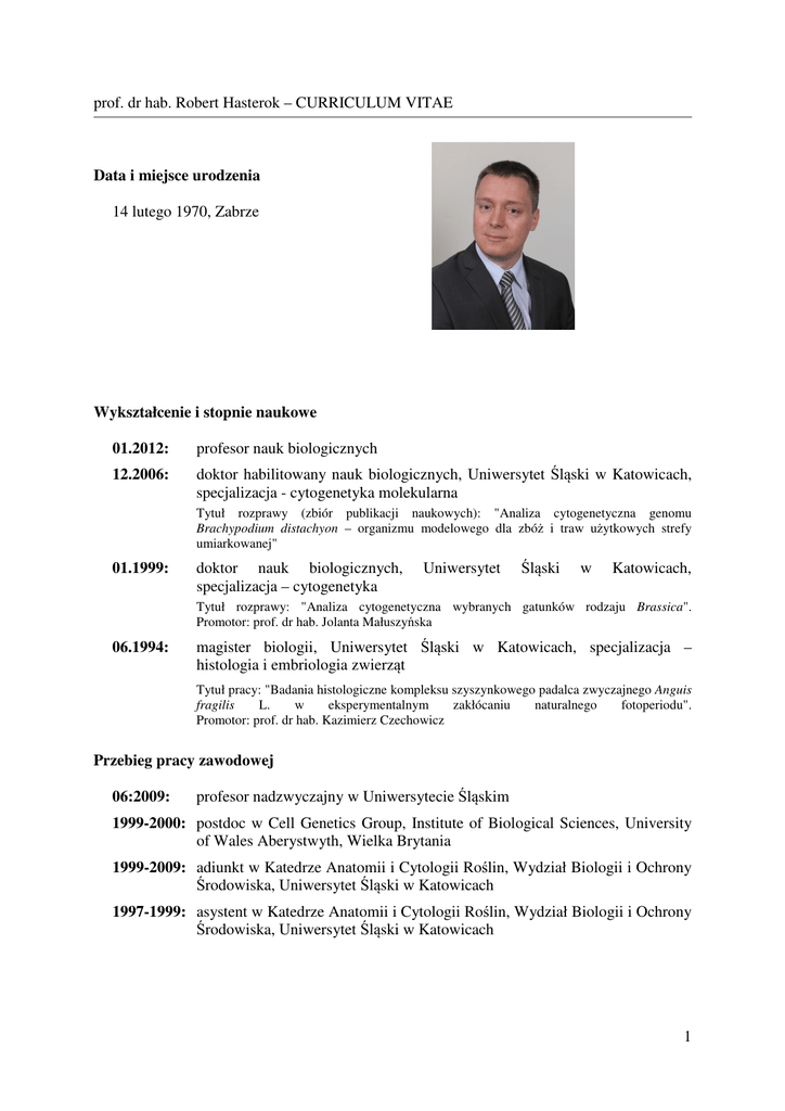 prof. dr hab. Robert Hasterok – CURRICULUM VITAE Data i miejsce urodzenia 14 lutego 1970, Zabrze Wykształcenie i stopnie naukowe 01.2012: profesor nauk biologicznych 12.2006: doktor habilitowany nauk biologicznych, Uniwersytet Śląski w Katowicach, specjalizacja - cytogenetyka molekularna Tytuł rozprawy (zbiór publikacji naukowych): "Analiza cytogenetyczna genomu Brachypodium distachyon – organizmu modelowego dla zbóż i traw użytkowych strefy umiarkowanej" 01.1999: doktor nauk biologicznych, specjalizacja – cytogenetyka Uniwersytet Śląski w Katowicach, Tytuł rozprawy: "Analiza cytogenetyczna wybranych gatunków rodzaju Brassica". Promotor: prof. dr hab. Jolanta Małuszyńska 06.1994: magister biologii, Uniwersytet Śląski w Katowicach, specjalizacja – histologia i embriologia zwierząt Tytuł pracy: "Badania histologiczne kompleksu szyszynkowego padalca zwyczajnego Anguis fragilis L. w eksperymentalnym zakłócaniu naturalnego fotoperiodu". Promotor: prof. dr hab. Kazimierz Czechowicz Przebieg pracy zawodowej 06:2009: profesor nadzwyczajny w Uniwersytecie Śląskim 1999-2000: postdoc w Cell Genetics Group, Institute of Biological Sciences, University of Wales Aberystwyth, Wielka Brytania 1999-2009: adiunkt w Katedrze Anatomii i Cytologii Roślin, Wydział Biologii i Ochrony Środowiska, Uniwersytet Śląski w Katowicach 1997-1999: asystent w Katedrze Anatomii i Cytologii Roślin, Wydział Biologii i Ochrony Środowiska, Uniwersytet Śląski w Katowicach 1 Funkcje administracyjne 2012-2016: członek Komitetu Cytobiologii, Wydział II Nauk Biologicznych i Rolniczych Polskiej Akademii Nauk, Warszawa 2012-nadal: kierownik Wydziałowej Pracowni Technik Mikroskopowych, Uniwersytet Śląski w Katowicach 2011-nadal: kierownik Katedry Anatomii i Cytologii Roślin, Uniwersytet Śląski w Katowicach 2010-2013: koordynator projektu "Atrakcyjna i Innowacyjna Biotechnologia ATRINBIOTECH", realizowanego na kierunku biotechnologia ze środków Europejskiego Funduszu Społecznego, Priorytet IV POKL "Szkolnictwo wyższe i nauka". Uniwersytet Śląski w Katowicach 2008-2011: pełniący obowiązki koordynatora merytorycznego na Wydziale Biologii i Ochrony Środowiska w projekcie "Zamawianie kształcenia na kierunkach technicznych, matematycznych i przyrodniczych - pilotaż", realizowanego na kierunku biotechnologia ze środków Europejskiego Funduszu Społecznego, Priorytet IV POKL "Szkolnictwo wyższe i nauka". Uniwersytet Śląski w Katowicach 2008-2012: członek wydziałowej w Katowicach komisji ds. kształcenia. Uniwersytet Śląski 2008-2012: koordynator ds. kształcenia na kierunku biotechnologia. Uniwersytet Śląski w Katowicach 2008-2012: członek wydziałowej komisji d/s europejskiego programu wymiany kadry akademickiej i studentów LLP-Erasmus. Uniwersytet Śląski w Katowicach 2008-2013: członek rady programowej anglojęzycznych studiów doktoranckich Advanced Methods in Biotechnology and Biodiversity, realizowanych ze środków Europejskiego Funduszu Społecznego, Priorytet IV POKL "Szkolnictwo wyższe i nauka" w ramach projektu Uniwersytet Partnerem Gospodarki Opartej na Wiedzy. Uniwersytet Śląski w Katowicach Zainteresowania naukowe - Cytogenetyka i cytogenetyka molekularna roślin - Organizacja roślinnego genomu jądrowego na poziomie chromosomowym, analizowana z wykorzystaniem organizmów modelowych z rodzaju Brachypodium, szczególnie zaś: - Porównawcze badania ewolucji genomów traw - Analiza rozmieszczenia i asocjacji terytoriów chromosomowych w roślinnym jądrze interfazowym - Kompleksowe badania przebiegu procesu mejotycznego u rośliny o małym genomie jądrowym - Analizy epigenetyczne w genomach wybranych gatunków Brachypodium ze szczególnym uwzględnieniem zjawiska dominacji jąderkowej - Badania stabilności genomu jądrowego B. distachyon poddanego działaniu fizycznych i chemicznych czynników mutagennych 2 Najważniejsze osiągnięcia naukowe oraz ‘naukowo-organizacyjne’ 2007-2010: uczestnictwo w międzynarodowym projekcie sekwencjonowania genomu jądrowego B. distachyon 2006-nadal: współzałożenie i działalność w International Brachypodium Initiative 2005: wykonanie pierwszych bibliotek dużych wstawek jądrowego DNA w klonach BAC oraz pierwszej mapy cytogenetycznej dla B. distachyon 2004: zaproponowanie koncepcji, że cytotypy B. diastachyon o liczbie chromosomów 20 oraz 30 w rzeczywistości stanowią odrębne gatunki. Gatunki te zostały oficjalnie zatwierdzone, jako nowe w roku 2012 2001: opracowanie pierwszych markerów specyficznych chromosomowo, opartych o sekwencje 5S rDNA oraz 25S rDNA, dla wybranych gatunków rodzaju Brassica. Zaproponowanie modelu rearanżacji loci niosących te sekwencje 2000-nadal: zainicjowanie i animacja badań cytomolekularnych na gatunkach rodzaju Brachypodium, w tym B. distachyon - organizmie referencyjnym dla zbóż i traw użytkowych strefy klimatu umiarkowanego Podsumowanie dorobku naukowego - współautor 36 artykułów naukowych opublikowanych w języku angielskim w czasopismach z listy JCR (dane wg Thomson Reuters Web of Knowledge & 2011 JCR Science Edition) i 1 w języku polskim o sumarycznym 5-Year IF = 140,011 i punktacji MNiSW = 953. Liczba cytowań w/w prac (dane w oparciu o bazę Scopus, stan na dzień 29.03.2012, samocytowania uwzględnione): 815. Indeks H = 15 - autor lub współautor 11 rozdziałów w podręcznikach i skryptach w języku angielskim i 1 w języku polskim - autor lub współautor 28 referatów na międzynarodowych i krajowych konferencjach naukowych oraz licznych wykładów na zaproszenie - autor lub współautor 53 posterów na międzynarodowych i krajowych konferencjach naukowych - kierownik w 4 i wykonawca w 3 projektach naukowo-badawczych finansowanych przez MNiSW/NCN - kierownik lub wykonawca w 5 projektach finansowanych ze środków zagranicznych (NATO, BBSRC, The Royal Society, Einar and Inga Nillsons Foundation) - uczestnik kilkunastu staży naukowych w ośrodkach w W
