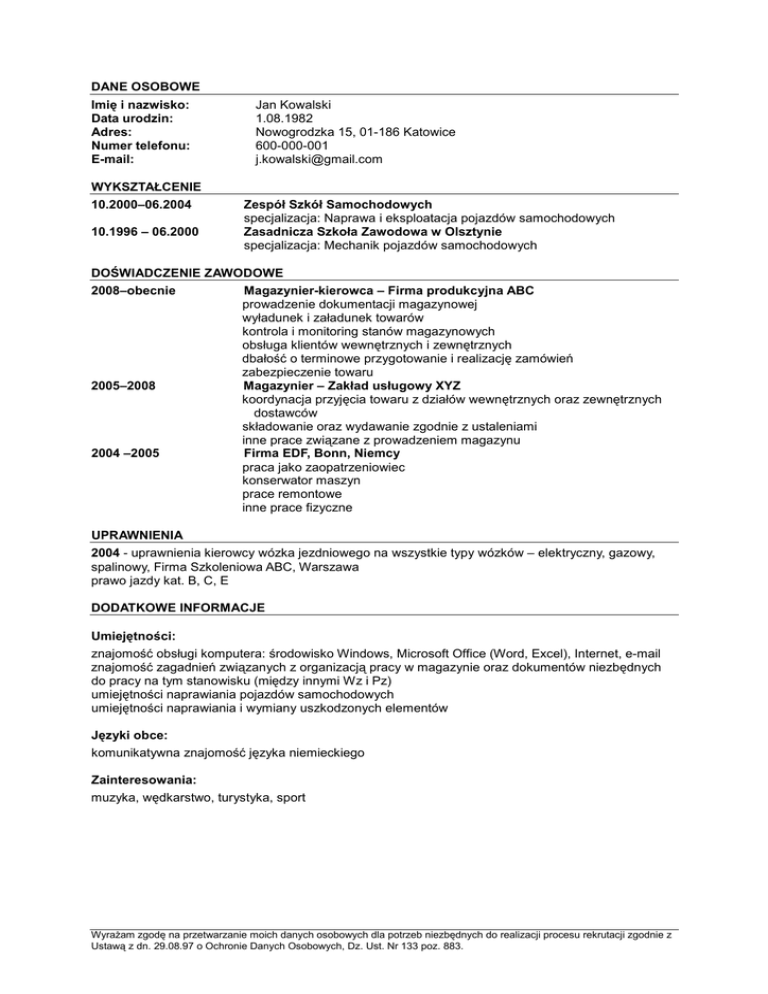 DANE OSOBOWE Imię i nazwisko: Data urodzin: Adres: Numer telefonu: E-mail: Jan Kowalski 1.08.1982 Nowogrodzka 15, 01-186 Katowice 600-000-001 [email protected] WYKSZTAŁCENIE 10.2000–06.2004 10.1996 – 06.2000 Zespół Szkół Samochodowych specjalizacja: Naprawa i eksploatacja pojazdów samochodowych Zasadnicza Szkoła Zawodowa w Olsztynie specjalizacja: Mechanik pojazdów samochodowych DOŚWIADCZENIE ZAWODOWE 2008–obecnie 2005–2008 2004 –2005 Magazynier-kierowca – Firma produkcyjna ABC prowadzenie dokumentacji magazynowej wyładunek i załadunek towarów kontrola i monitoring stanów magazynowych obsługa klientów wewnętrznych i zewnętrznych dbałość o terminowe przygotowanie i realizację zamówień zabezpieczenie towaru Magazynier – Zakład usługowy XYZ koordynacja przyjęcia towaru z działów wewnętrznych oraz zewnętrznych dostawców składowanie oraz wydawanie zgodnie z ustaleniami inne prace związane z prowadzeniem magazynu Firma EDF, Bonn, Niemcy praca jako zaopatrzeniowiec konserwator maszyn prace remontowe inne prace fizyczne UPRAWNIENIA 2004 - uprawnienia kierowcy wózka jezdniowego na wszystkie typy wózków – elektryczny, gazowy, spalinowy, Firma Szkoleniowa ABC, Warszawa prawo jazdy kat. B, C, E DODATKOWE INFORMACJE Umiejętności: znajomość obsługi komputera: środowisko Windows, Microsoft Office (Word, Excel), Internet, e-mail znajomość zagadnień związanych z organizacją pracy w magazynie oraz dokumentów niezbędnych do pracy na tym stanowisku (między innymi Wz i Pz) umiejętności naprawiania pojazdów samochodowych umiejętności naprawiania i wymiany uszkodzonych elementów Języki obce: komunikatywna znajomość języka niemieckiego Zainteresowania: muzyka, wędkarstwo, turystyka, sport WyraŜam zgodę na przetwarzanie moich danych osobowych dla potrzeb niezbędnych do realizacji procesu rekrutacji zgodnie z Ustawą z dn. 29.08.97 o Ochronie Danych Osobowych, Dz. Ust. Nr 133 poz. 883.