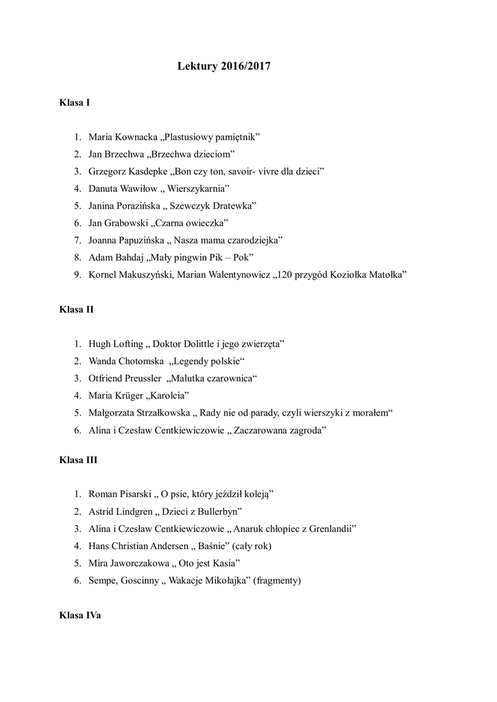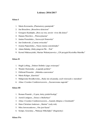 Lektury 2016/2017 Klasa I 1. Maria Kownacka „Plastusiowy pamiętnik” 2. Jan Brzechwa „Brzechwa dzieciom” 3. Grzegorz Kasdepke „Bon czy ton, savoir- vivre dla dzieci” 4. Danuta Wawiłow „ Wierszykarnia” 5. Janina Porazińska „ Szewczyk Dratewka” 6. Jan Grabowski „Czarna owieczka” 7. Joanna Papuzińska „ Nasza mama czarodziejka” 8. Adam Bahdaj „Mały pingwin Pik – Pok” 9. Kornel Makuszyński, Marian Walentynowicz „120 przygód Koziołka Matołka” Klasa II 1. Hugh Lofting „ Doktor Dolittle i jego zwierzęta” 2. Wanda Chotomska „Legendy polskie“ 3. Otfriend Preussler „Malutka czarownica“ 4. Maria Krüger „Karolcia” 5. Małgorzata Strzałkowska „ Rady nie od parady, czyli wierszyki z morałem“ 6. Alina i Czesław Centkiewiczowie „ Zaczarowana zagroda” Klasa III 1. Roman Pisarski „ O psie, który jeździł koleją” 2. Astrid Lindgren „ Dzieci z Bullerbyn” 3. Alina i Czesław Centkiewiczowie „ Anaruk chłopiec z Grenlandii” 4. Hans Christian Andersen „ Baśnie” (cały rok) 5. Mira Jaworczakowa „ Oto jest Kasia” 6. Sempe, Goscinny „ Wakacje Mikołajka” (fragmenty) Klasa IVa 1. Ferenc Molnar „Chłopcy z Placu Broni” (wrzesień) 2. Clive Staples Lewis „Lew, Czarownica i stara szafa” (listopad) 3. Roald Dahl „Charlie i fabryka czekolady” (styczeń) 4. Astrid Lindgren „Bracia Lwie Serce” (marzec) 5. Juliusz Verne „W 80 dni dookoła świata” (maj) Klasa IVb 1. Anna Onichimowska „Daleki rejs” (wrzesień) 2. Clive Staples Lewis „Lew, Czarownica i stara szafa” (listopad) 3. Roald Dahl „Charlie i fabryka czekolady” (styczeń) 4. Carlo Collodi „Pinokio” (marzec) 5. Joanna Olech „Dynastia Miziołków’ (maj) Klasa V 1. Astrid Lindgren „Bracia Lwie Serce” 2. Joanna Olech „Dynastia Miziołków” 3. Frances Hodgson Burnett „Tajemniczy ogród” 4. Ferenc Molnar „Chłopcy z Placu Broni” 5. Lucy Maud Montgomery „Ania z Zielonego Wzgórza” Klasa VI 1. John Ronald Reuel Tolkien „Hobbit, czyli tam i z powrotem” (październik) 2. Mark Twain „Przygody Tomka Sawyera” (grudzień) 3. Dorota Terakowska „Władca Lewawu” (luty) 4. Kornel Makuszyński „Szatan z siódmej klasy” (kwiecień) 5. Juliusz Verne „W 80 dni dookoła świata” (maj) Klasa I gimnazjum 1. Aleksander Kamiński „ Kamienie na szaniec” (wrzesień) 2. Artur Conan Doyle “Pies” Baskervillów” (listopad) 3. Małgorzata Musierowicz “Opium w rosole” (grudzień) 4. William Shakespeare „Romeo i Julia” (luty) 5. Antoine de Saint Exupery „Mały Książę” (marzec) Klasa II gimnazjum 1. Aleksander Kamiński „ Kamienie na szaniec” (wrzesień) 2. Bolesław Prus „Kamizelka” (październik) 3. Małgorzata Musierowicz „Opium w rosole” (grudzień) 4. Agata Christie „ ABC” (luty) 5. Aleksander Fiedler „Dywizjon 303” ( kwiecień) Klasa III gimnazjum 1. Adam Mickiewicz „Dziady część II” 2. Aleksander Kamiński „ Kamienie na szaniec” 3. Yann Martel „Życie Pi” 4. George Orwell „Folwark zwierzęcy” 5. Juliusz Słowacki „Balladyna”