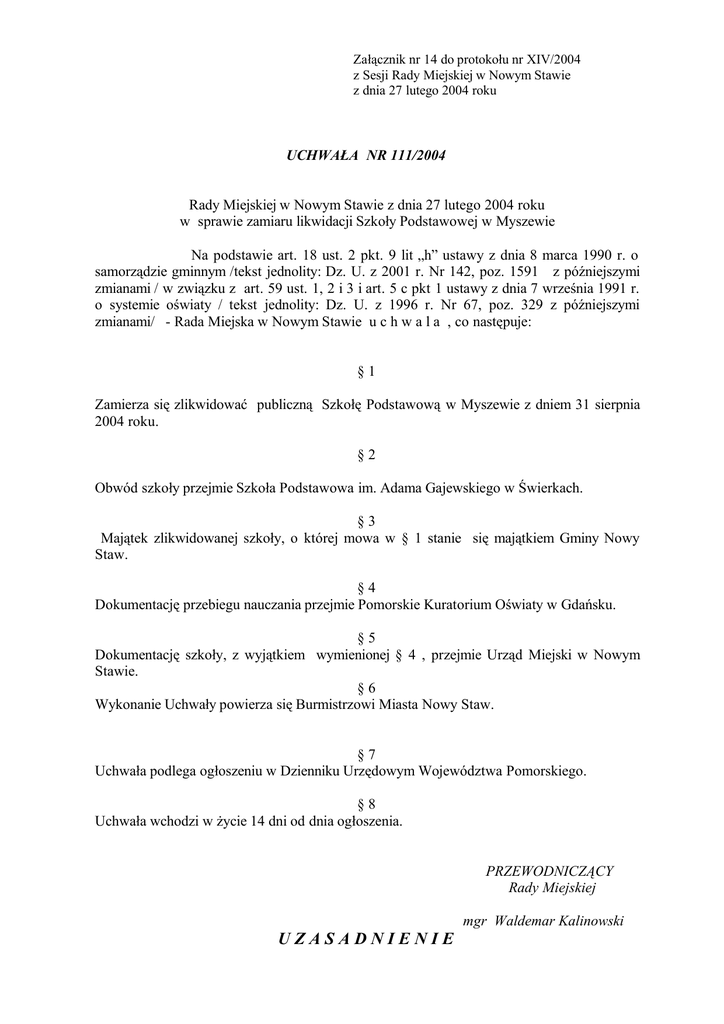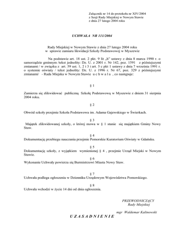 Załącznik nr 14 do protokołu nr XIV/2004 z Sesji Rady Miejskiej w Nowym Stawie z dnia 27 lutego 2004 roku UCHWAŁA NR 111/2004 Rady Miejskiej w Nowym Stawie z dnia 27 lutego 2004 roku w sprawie zamiaru likwidacji Szkoły Podstawowej w Myszewie Na podstawie art. 18 ust. 2 pkt. 9 lit „h” ustawy z dnia 8 marca 1990 r. o samorządzie gminnym /tekst jednolity: Dz. U. z 2001 r. Nr 142, poz. 1591 z późniejszymi zmianami / w związku z art. 59 ust. 1, 2 i 3 i art. 5 c pkt 1 ustawy z dnia 7 września 1991 r. o systemie oświaty / tekst jednolity: Dz. U. z 1996 r. Nr 67, poz. 329 z późniejszymi zmianami/ - Rada Miejska w Nowym Stawie u c h w a l a , co następuje: §1 Zamierza się zlikwidować publiczną Szkołę Podstawową w Myszewie z dniem 31 sierpnia 2004 roku. §2 Obwód szkoły przejmie Szkoła Podstawowa im. Adama Gajewskiego w Świerkach. §3 Majątek zlikwidowanej szkoły, o której mowa w § 1 stanie się majątkiem Gminy Nowy Staw. §4 Dokumentację przebiegu nauczania przejmie Pomorskie Kuratorium Oświaty w Gdańsku. §5 Dokumentację szkoły, z wyjątkiem wymienionej § 4 , przejmie Urząd Miejski w Nowym Stawie. §6 Wykonanie Uchwały powierza się Burmistrzowi Miasta Nowy Staw. §7 Uchwała podlega ogłoszeniu w Dzienniku Urzędowym Województwa Pomorskiego. §8 Uchwała wchodzi w życie 14 dni od dnia ogłoszenia. PRZEWODNICZĄCY Rady Miejskiej mgr Waldemar Kalinowski UZASADNIENIE do Uchwały Nr111/2004 Rady Miejskiej w Nowym Stawie z dnia 27 lutego 2004 r. w sprawie zamiaru likwidacji Szkoły Podstawowej w Myszewie Szkoła Podstawowa w Myszewie liczy obecnie 50 uczniów w klasach I-VI. Mała liczba dzieci oraz tendencje wskazujące na malejącą liczbę dzieci w latach następnych ( w roku szkolnym 2004/2005 planowana liczba dzieci w tej Szkole to 43 uczniów) sprawiają, iż istnieje konieczność likwidacji tej placówki. Jej koszty utrzymania są niezmiernie wysokie. W projekcie budżetu na 2004 rok zapisano kwotę 420 tys. zł. Rzeczywiste koszty utrzymania 1 ucznia w 2003 roku wyniosły 7.547,62 zł , natomiast koszty wg naliczonej subwencji w omawianej placówce winny wynosić 4.418,92 zł. Jak wynika z powyższego przekroczenie planowanych kosztów na 1 ucznia stanowi kwotę 3.128,70 zł. 1. Prognozy demograficzne w perspektywie 6 – letniej: Rok urodzenia 1997 1998 1999 2000 2001 2002 Obwód szkoły Podstawowej w Świerkach 15 20 18 21 19 11 Obwód Szkoły Podstawowej w Myszewie 6 11 5 6 9 7 Liczba dzieci w przypadku połączenia obwodów szkół 21 31 23 27 28 18 2. Po likwidacji Szkoły Podstawowej w Myszewie obwód tej szkoły przejmie Szkoła Podstawowa w Świerkach, która w chwili obecnej liczy 72 uczniów klasach I-VI oraz 1 oddział zerowy (19 dzieci). Liczebność oddziałów w roku szkolnym 2004/2005 wyglądać będzie następująco: Klasa 1 20 3. Klasa 2 18 Klasa 3 25 Klasa 4 16 Klasa 5 19 Klasa 6 21 W przypadku likwidacji Szkoły w Myszewie nie będzie konieczności wprowadzania w Szkole w Świerkach zmianowości. W szkole tej może uczyć się ok. 200 dzieci. Znajduje się tam mała sala gimnastyczna, dobrze wyposażona pracownia komputerowa oraz biblioteka. Przy budynku szkoły znajduje się boisko sportowe oraz miejsce do rekreacji w czasie przerw. Szkoła w Świerkach wyposażona jest również w zaplecze kuchenne. Zorganizowane jest żywienie dla wszystkich dzieci uczęszczających do tej placówki. Obecnie w tej szkole zatrudnionych jest 14 nauczycieli. W tym 9 nauczycieli posiada wykształcenie wyższe magisterskie i 2 wykształcenie wyższe zawodowe . Stopnie awansu zawodowego: - 2 dyplomowanych, - 7 mianowanych, - 2 kontraktowych, -3 stażystów. 4. Obecnie dowozy dzieci do szkół obsługiwane są przez Miejski Zakład Komunikacji w Malborku, z którym zawarta jest stosowna umowa . Mamy również do tego celu samochód Lublin III. Obecnie czynimy starania o gimbusa, który ułatwiłby komunikację. W każdym autobusie są opiekunowie dzieci, którzy zatrudnieni są na podstawie umowy zlecenia. W przypadku likwidacji Szkoły w Myszewie zostanie zorganizowany dowóz tych dzieci do Szkoły Podstawowej w Świerkach, oddalonej o 6 km od miejscowości Myszewo. Jeżeli rodzice zadeklarują chęć posłania dzieci do Szkoły Podstawowej w Nowym Stawie, ze strony gminy będą miały również zapewnione bezpłatne dowozy i opiekę. Czas oczekiwania na przewóz nie będzie dłuższy niż 1 godzina lekcyjna. A czas pobytu dzieci poza domem nie będzie dłuższy niż – dla dzieci z klas I-III – 5 godzin, a dla uczniów klas IV – VI – 7 godzin. W trakcie oczekiwania na przewozy dzieci będą przebywały w świetlicy szkolnej, bądź będą mogły skorzystać z pracowni internetowej. 5. W Szkole Podstawowej w Myszewie obecnie zatrudnionych jest 11 nauczycieli. Pięciu z nich zatrudnionych jest na podstawie mianowania, pozostali na podstawie umowy na czas określony – do 31.08.2004 roku. Czterech spośród nich znajdzie zatrudnienie w Szkole Podstawowej Nr 2 w Nowym Stawie, w której to od 1.01.2004 r. czterech nauczycieli przeszło na emeryturę , oraz 4 nauczycieli w Szkole Podstawowej w Świerkach. W jednym przypadku planowany jest urlop macierzyński – od miesiąca czerwca br. Nauczyciel, który obecnie przebywa na urlopie zdrowotnym, planuje przejście na emeryturę. 6. Po likwidacji Szkoły planuje się , aby budynek został wykorzystany przez mieszkańców okolicznych wsi. Przy Nowostawskim Ośrodku Kultury zostanie zatrudniona osoba, która będzie organizowała zajęcia dla dzieci, jak również imprezy dla mieszkańców. 7. Proponuje się ujęcie w budżecie gminy przez okres 3 lat ( począwszy od roku 2005 do roku 2007) środki na realizację zadań rzeczowych dla sołectw w obwodzie Szkoły Podstawowej w Myszewie. Wnosi się o podjęcie uchwały. Burmistrz Miasta Nowy Staw Jerzy Szałach