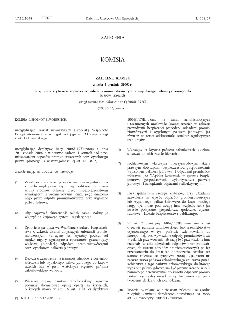 17.12.2008 PL Dziennik Urzędowy Unii Europejskiej L 338/69 ZALECENIA KOMISJA ZALECENIE KOMISJI z dnia 4 grudnia 2008 r. w sprawie kryteriów wywozu odpadów promieniotwórczych i wypalonego paliwa jądrowego do krajów trzecich (notyfikowana jako dokument nr C(2008) 7570) (2008/956/Euratom) 2006/117/Euratom, na temat administracyjnych i technicznych możliwości krajów trzecich w zakresie prowadzenia bezpiecznej gospodarki odpadami promie niotwórczymi i wypalonym paliwem jądrowym, jak również na temat adekwatności struktur regulacyjnych tych krajów. KOMISJA WSPÓLNOT EUROPEJSKICH, uwzględniając Traktat ustanawiający Europejską Wspólnotę Energii Atomowej, w szczególności jego art. 33 akapit drugi i art. 124 tiret drugie, uwzględniając dyrektywę Rady 2006/117/Euratom z dnia 20 listopada 2006 r. w sprawie nadzoru i kontroli nad prze mieszczaniem odpadów promieniotwórczych oraz wypalonego paliwa jądrowego (1), w szczególności jej art. 16 ust. 2, (6) Wdrażając te kryteria państwa członkowskie powinny stosować do nich zasadę hierarchii. (7) Podstawowym właściwym międzynarodowym aktem prawnym dotyczącym bezpieczeństwa gospodarowania wypalonym paliwem jądrowym i odpadami promieniot wórczymi jest Wspólna konwencja w sprawie bezpie czeństwa gospodarowania wykorzystanym paliwem jądrowym i zarządzania odpadami radioaktywnymi. (8) Poza spełnieniem szeregu kryteriów, przy udzielaniu zezwolenia na wywóz odpadów promieniotwórczych lub wypalonego paliwa jądrowego do kraju trzeciego mogą być brane pod uwagę inne względy, takie jak kwestie polityczne, gospodarcze, społeczne, etyczne, naukowe i kwestie bezpieczeństwa publicznego. (9) W art. 2 dyrektywy 2006/117/Euratom mowa jest o prawie państwa członkowskiego lub przedsiębiorstwa usytuowanego w tym państwie członkowskim, do którego mają być wywiezione odpady promieniotwórcze w celu ich przetworzenia lub mają być przewiezione inne materiały w celu odzyskania odpadów promieniotwór czych, do zwrotu odpadów promieniotwórczych po ich przetworzeniu do kraju ich pochodzenia. Artykuł ten stanowi również, że dyrektywa 2006/117/Euratom nie narusza prawa państwa członkowskiego ani prawa przed siębiorstwa z tego państwa członkowskiego, do którego wypalone paliwo jądrowe ma być przemieszczone w celu ponownego przetwarzania, do zwrotu odpadów promie niotwórczych odzyskanych w wyniku ponownego prze tworzenia do kraju ich pochodzenia. (10) Kryteria określone w niniejszym zaleceniu są zgodne z opinią komitetu doradczego powołanego na mocy art. 21 dyrektywy 2006/117/Euratom, a także mając na uwadze, co następuje: (1) Zasady ochrony przed promieniowaniem uzgodnione na szczeblu międzynarodowym dają podstawę do ustana wiania środków ochrony przed niebezpieczeństwem wynikającym z promieniowania jonizującego emitowa nego przez odpady promieniotwórcze oraz wypalone paliwo jądrowe. (2) Aby zapewnić skuteczność takich zasad, należy je włączyć do krajowego systemu regulacyjnego. (3) Zgodnie z panującą we Wspólnocie kulturą bezpieczeń stwa w zakresie działań dotyczących substancji promie niotwórczych, wymagany jest wyraźny podział ról między organy regulacyjne a operatorów, gwarantujący właściwą gospodarkę odpadami promieniotwórczymi oraz wypalonym paliwem jądrowym. (4) Decyzja o zezwoleniu na transport odpadów promieniot wórczych lub wypalonego paliwa jądrowego do krajów trzecich leży w gestii właściwych organów państwa członkowskiego wywozu. (5) Właściwe organy państwa członkowskiego wywozu powinny sformułować opinię opartą na kryteriach, o których mowa w art. 16 ust. 1 lit. c) dyrektywy (1) Dz.U. L 337 z 5.12.2006, s. 21. L 338/70 PL Dziennik Urzędowy Unii Europejskiej NINIEJSZYM ZALECA: 1) Główne wymogi dotyczące wywozu odpadów promieniot wórczych lub wypalonego paliwa jądrowego do krajów trze cich, o których mowa w art. 16 ust. 1 lit. c) dyrektywy 2006/117/Euratom, powinny być następujące: a) ustanowienie i egzekwowanie przepisów krajowych w zakresie ochrony pracowników i ogółu społeczeństwa przed promieniowaniem; przepisy te powinny być spójne z odpowiednimi międzynarodowymi normami w zakresie ochrony przed promieniowaniem, 17.12.2008 j) odpowiednie środki ochronne i naprawcze, w tym infor mowanie zainteresowanych grup społecznych oraz opra cowanie i testowanie planów postępowania w sytuacjach kryzysowych, które zostaną zastosowane w sytuacji zagrożenia radiologicznego w celu opanowania wycieku i złagodzenia jego skutków. 2) Aby ocenić, czy spełnione są powyższe wymogi dotyczące wywozu odpadów promieniotwórczych i wypalonego paliwa jądrowego do krajów trzecich, państwa członkowskie powinny uwzględnić zakres, w jakim kraje trzecie spełniają następujące kryteria: a) kryteria główne: b) określenie spójnych ram prawnych dla potrzeb regulacji działań wiążących się z zagrożeniami, jakie stwarzają substancje promieniotwórcze, w tym odpady promieniot wórcze i wypalone paliwo jądrowe, c) powołanie skutecznie działających, niezależnych organów regulacyjnych uprawnionych do wydawania zezwoleń, ich weryfikacji, oceny zapotrzebowania, odpowiedzial nych za kontrolę i egzekwowanie przepisów oraz dyspo nujących odpowiednimi zasobami, d) wyraźny podział odpowiedzialności pomiędzy organy uczestniczące w różnych etapach gospodarowania wypa lonym paliwem jądrowym i odpadami promieniotwór czymi, w szczególności pomiędzy operatorów i organy regulacyjne, e) system sprawozdawczości dla takich organów lub wyda wania przez nie zezwoleń, przeznaczony dla organizacji odpowiedzialnych za gospodarowanie odpadami promie niotwórczymi lub wypalonym paliwem, f) zapewnienie, że odpowiedzialność za bezpieczne gospo darowanie wypalonym paliwem jądrowym lub odpadami promieniotwórczymi spoczywa głównie na posiadaczu odpowiedniego zezwolenia oraz że każdy posiadacz takiego zezw