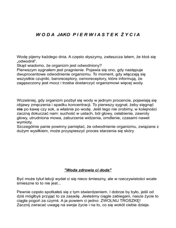 W O D A JAKO P I E R W I A S T E K Ż Y C I A Wodę pijemy każdego dnia. A często słyszymy, zwłaszcza latem, że ktoś się „odwodnił”. Skąd wiadomo, że organizm jest odwodniony? Pierwszym sygnałem jest pragnienie. Pojawia się ono, gdy następuje dwuprocentowe odwodnienie organizmu. To moment, gdy włączają się wszystkie czujniki, baroreceptory, osmoreceptory, które informują, że zagęszczony jest mocz i trzeba dostarczyć organizmowi więcej wody. Wcześniej, gdy organizm pozbył się wody w jednym procencie, pojawiają się objawy zmęczenia i spadku koncentracji. To pierwszy sygnał, żeby sięgnąć nie po kawę czy sok, a właśnie po wodę. Jeśli tego nie zrobimy, w kolejności zaczną dokuczać nam: suchość w ustach, ból głowy, osłabienie, zawroty głowy, utrudniona mowa, zaburzenia widzenia, omdlenie, czasami nawet wymioty. Szczególnie panie powinny pamiętać, że odwodnienie organizmu, związane z dużym wysiłkiem, może przyspieszyć proces starzenia się skóry "Woda zdrowia ci doda" Być może tytuł lekcji wydał ci się nieco śmieszny, ale w rzeczywistości wcale śmieszne to to nie jest... Pewnie często spotkałeś się z tym stwierdzeniem. I dobrze by było, jeśli od dziś mógłbyś przyjąć to za zasadę. Jesteśmy ciągle zabiegani, nasze życie to ciągła pogoń za czymś. A ja powiem ci jedno: ZWOLNIJ TROSZKĘ! Zacznij zwracać uwagę na swoje życie i na to, co się wokół ciebie dzieje. Ale przejdźmy do rzeczy. Powiem ci nieco o wodzie. Zwykłej wodzie pitnej, bez której nie można sobie wyobrazić życie na planecie Ziemia. Niestety nie zawsze potrafimy docenić wpływu wody na jakość naszego życia. Większość z nas sięga zazwyczaj po łyk wody dopiero wtedy, gdy czuje silne pragnienie. A to kardynalny błąd! Zaraz wyjaśnię, dlaczego tak jest oraz jaki wpływ ma ilość i jakość wypijanej wody na poziom energii życiowej. Już od wieków wiadomo, że woda to naturalny eliksir życia. Jest niezbędna dla prawidłowego funkcjonowania każdego organizmu. Nawilża, oczyszcza, odżywia, leczy oraz jest źródłem energii. Udowodniono, że przeciętnie już nawet 5% spadek poziomu płynów w organizmie powoduje spadek o 25 -30% energii życiowej. Okropny wynik, prawda? Liczne badania dowodzą, że jakość i ilość wody, jaką pijemy ma decydujący wpływ na transmisję energii życiowej w wymianie pomiędzy komórkami. Woda rozrzedza krew, korzystnie wpływa na metabolizm i przemianę materii, nieco podnosi ciśnienie. Niestety pijemy jej stanowczo za mało. Zazwyczaj sięgamy po butelkę wody dopiero, gdy czujemy silne pragnienie. Wtedy pijemy jej dużo, sądząc, że to dobry sposób na uzupełnienie płynów. Ale tak naprawdę nie tędy droga. Duża ilość wypitej od razu wody powoduje spore obciążenie organizmu, który nie jest w stanie takiej ilości na raz wchłonąć. Układ krążenia wykonuje więc ogromną pracę, by jak najwięcej wody jednak przyswoić, a w końcu większą jej część po prostu wydala a my w konsekwencji czujemy się zmęczeni. A więc jak i jaką wodę mamy spożywać, by dodać sobie energii i czuć się zdrowo? Już wyjaśniam. Przeciętna niezbędna ilość wody, jaką powinniśmy pić, to 1,5 do 2,5 litrów dziennie. Należy pić często, lecz w niewielkich ilościach. W ten sposób organizm sukcesywnie i stopniowo uzupełnia ubytki. Czy każda woda się do tego nadaje? Otóż nie. Z badań WHO ( skrót od: World Health Organization - Światowa Organizacja Zdrowia) wynika, że aż 80% współczesnych chorób ma ścisły związek z jakością wody, jaką na co dzień spożywamy. Otóż badania te pokazały, że bieżąca woda, jaką mamy w kranach jest energetycznie martwa. Na niewiele zda nam jej picie. Nie wpadaj jednak w panikę! Jest ona jak najbardziej czysta i oczywiście nadaje się do spożycia w stanie surowym, jak i do gotowania. Dzieje się tak dlatego, że ciśnienie w rurach oraz jej filtrowanie zaburza naturalną strukturę wody. Staraj się więc pić niegazowaną wodę mineralną, dostępną w sklepach. Tylko naturalna, mająca pierwotną strukturę woda zapewni nam świetne samopoczucie i energię do działania każdego dnia. Dodam jeszcze, że woda pita wprost ze źródeł i czystych strumyków niesie ze sobą niewyobrażalne pokłady energii. To czysta, żywa natura! Wpuść ją do siebie i korzystaj z tego daru na wszelkich wycieczkach czy wypadach w góry! A co dokładnie powoduje nawet niewielki niedobór wody? Dlaczego to tak ważny temat? Oto tylko niektóre skutki niedoboru wody w organiźnie: •odkładanie się toksyn •spowolnienie pracy układu nerwowego, pokarmowego oraz układu krążenia •zaburzenia pracy nerek, wątroby, trzustki, płuc •kłopoty ze skórą i włosami •pracujemy na wolniejszych obrotach •ból głowy •senność •ogólne osłabienie i zmęczenie •nerwowość, rozdrażnienie •problemy z koncentracją •trudności z zasypianiem •zaburzenia pamięci •starzenie się komórek organizmu •prowadzi do powstawania chorób Widzisz więc, że z wodą nie ma żartów. Jak już wspomniałam, spożywanie wody to także niezły sposób na podniesienie swojej własnej energii życiowej. Ja zauważyłam to praktycznie od razu jak tylko zaczęłam zwracać większą uwagę na to, ile, jak często i jaką wodę piję. Staram się zawsze mieć pod ręką butelkę z niegazowaną wodą mineralną. To powoduje, że łatwiej mi się koncentrować na tym, co robię, nie czuję się już wiecznie senna i z uśmiechem patrzę na świat. Zadanie dla ciebie do wykonania: Zaopatrz się jeszcze dziś w zapas wody. Najlepiej w sześciopak 1.5 – litrowej, niegazowanej mineralnej. Każdy nadchodzący dzień zacznij od minimum pół szklanki wody. Wypij jak tylko wstaniesz. To oczyści twój organizm z toksyn, które zmagazynowały się w ciągu nocy. Staraj się od teraz w ciągu dnia pić niegazowaną wodę mineralną małymi porcjami, tak do o