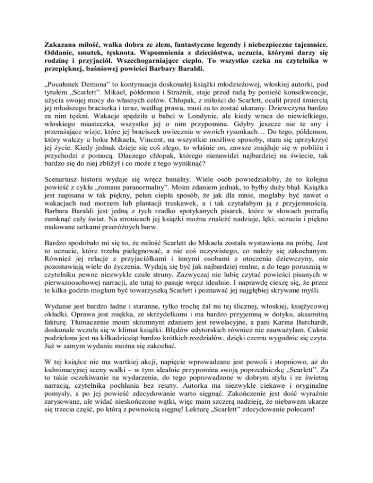 Zakazana miłość, walka dobra ze złem, fantastyczne legendy i niebezpieczne tajemnice. Oddanie, smutek, tęsknota. Wspomnienia z dzieciństwa, uczucia, którymi darzy się rodzinę i przyjaciół. Wszechogarniające ciepło. To wszystko czeka na czytelnika w przepięknej, baśniowej powieści Barbary Baraldi. „Pocałunek Demona” to kontynuacja doskonałej książki młodzieżowej, włoskiej autorki, pod tytułem „Scarlett”. Mikael, półdemon i Strażnik, staje przed radą by ponieść konsekwencje, użycia swojej mocy do własnych celów. Chłopak, z miłości do Scarlett, ocalił przed śmiercią jej młodszego braciszka i teraz, według prawa, musi za to zostać ukarany. Dziewczyna bardzo za nim tęskni. Wakacje spędziła u babci w Londynie, ale kiedy wraca do niewielkiego, włoskiego miasteczka, wszystko jej o nim przypomina. Gdyby jeszcze nie te sny i przerażające wizje, które jej braciszek uwiecznia w swoich rysunkach… Do tego, półdemon, który walczy u boku Mikaela, Vincent, na wszystkie możliwe sposoby, stara się uprzykrzyć jej życie. Kiedy jednak dzieje się coś złego, to właśnie on, zawsze znajduje się w pobliżu i przychodzi z pomocą. Dlaczego chłopak, którego nienawidzi najbardziej na świecie, tak bardzo się do niej zbliżył i co może z tego wyniknąć? Scenariusz historii wydaje się wręcz banalny. Wiele osób powiedziałoby, że to kolejna powieść z cyklu „romans paranormalny”. Moim zdaniem jednak, to byłby duży błąd. Książka jest napisana w tak piękny, pełen ciepła sposób, że jak dla mnie, mogłaby być nawet o wakacjach nad morzem lub plantacji truskawek, a i tak czytałabym ją z przyjemnością. Barbara Baraldi jest jedną z tych rzadko spotykanych pisarek, które w słowach potrafią zamknąć cały świat. Na stronicach jej książki można znaleźć nadzieje, lęki, uczucia i piękno malowane setkami przeróżnych barw. Bardzo spodobało mi się to, że miłość Scarlett do Mikaela została wystawiona na próbę. Jest to uczucie, które trzeba pielęgnować, a nie coś oczywistego, co należy się zakochanym. Również jej relacje z przyjaciółkami i innymi osobami z otoczenia dziewczyny, nie pozostawiają wiele do życzenia. Wydają się być jak najbardziej realne, a do tego poruszają w czytelniku pewne niezwykle czułe struny. Zazwyczaj nie lubię czytać powieści pisanych w pierwszoosobowej narracji, ale tutaj to pasuje wręcz idealnie. I naprawdę cieszę się, że przez te kilka godzin mogłam być towarzyszką Scarlett i poznawać jej najgłębiej skrywane myśli. Wydanie jest bardzo ładne i staranne, tylko trochę żal mi tej ślicznej, włoskiej, księżycowej okładki. Oprawa jest miękka, ze skrzydełkami i ma bardzo przyjemną w dotyku, aksamitną fakturę. Tłumaczenie moim skromnym zdaniem jest rewelacyjne, a pani Karina Burchardt, doskonale wczuła się w klimat książki. Błędów edytorskich również nie zauważyłam. Całość podzielona jest na kilkadziesiąt bardzo krótkich rozdziałów, dzięki czemu wygodnie się czyta. Już w samym wydaniu można się zakochać. W tej książce nie ma wartkiej akcji, napięcie wprowadzane jest powoli i stopniowo, aż do kulminacyjnej sceny walki – w tym idealnie przypomina swoją poprzedniczkę „Scarlett”. Za to takie oczekiwanie na wydarzenia, do tego poprowadzone w dobrym stylu i ze świetną narracją, czytelnika pochłania bez reszty. Autorka ma niezwykle ciekawe i oryginalne pomysły, a po jej powieść zdecydowanie warto sięgnąć. Zakończenie jest dość wyraźnie zarysowane, ale widać nieskończone wątki, więc mam szczerą nadzieję, że niebawem ukarze się trzecia część, po którą z pewnością sięgnę! Lekturę „Scarlett” zdecydowanie polecam!