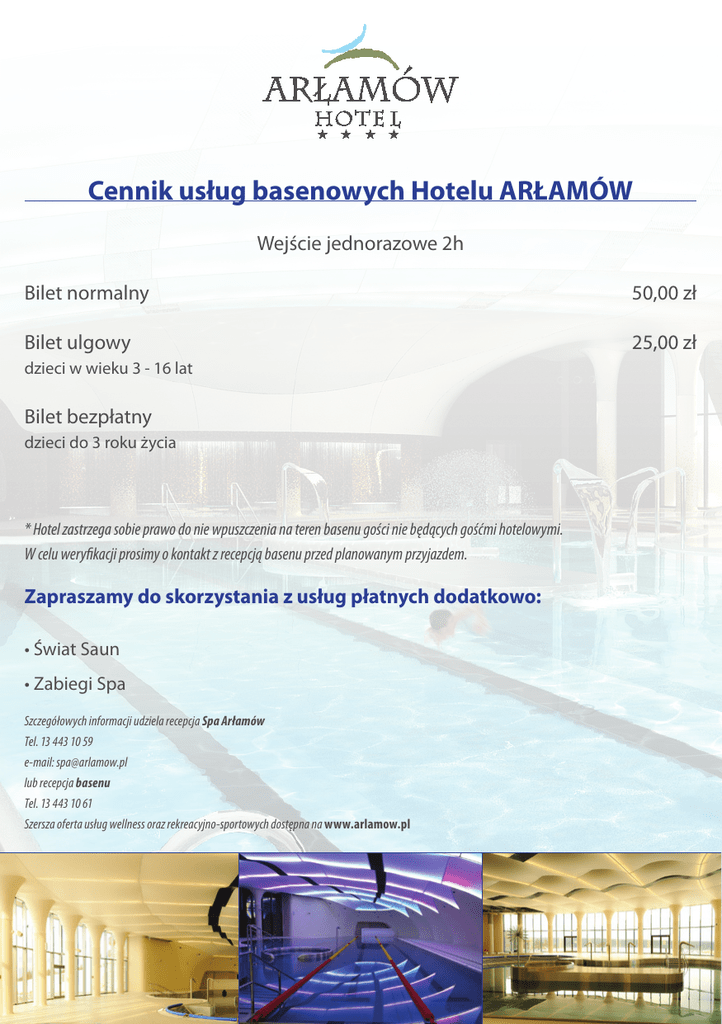 Cennik usług basenowych Hotelu ARŁAMÓW Wejście jednorazowe 2h Bilet normalny 50,00 zł Bilet ulgowy dzieci w wieku 3 - 16 lat 25,00 zł Bilet bezpłatny dzieci do 3 roku życia * Hotel zastrzega sobie prawo do nie wpuszczenia na teren basenu gości nie będących gośćmi hotelowymi. W celu weryfikacji prosimy o kontakt z recepcją basenu przed planowanym przyjazdem. Zapraszamy do skorzystania z usług płatnych dodatkowo: • Świat Saun • Zabiegi Spa Szczegółowych informacji udziela recepcja Spa Arłamów Tel. 13 443 10 59 e-mail: [email protected] lub recepcja basenu Tel. 13 443 10 61 Szersza oferta usług wellness oraz rekreacyjno-sportowych dostępna na www.arlamow.pl