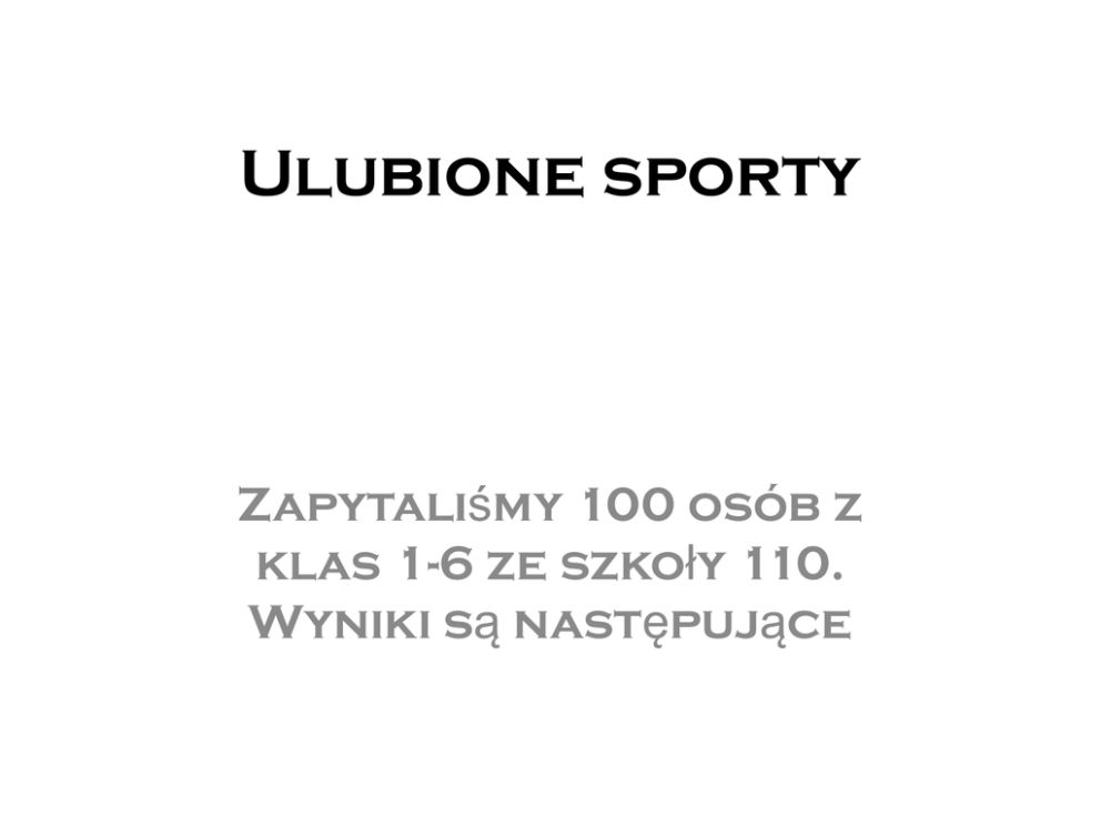 Ulubione sporty Zapytaliśmy 100 osób z klas 1-6 ze szkoły 110. Wyniki są następujące Piłka nożna • Gra zespołowa. jedna z najpopularniejszych dyscyplin sportowych na świecie Koszykówka • dyscyplina sportu drużynowego, w której dwie pięcioosobowe drużyny grają przeciwko sobie próbując zdobyć punkty umieszczając piłkę w koszu. Jest jedną z najpopularniejszych i najchętniej oglądanych dyscyplin na świecie. Za datę powstania koszykówki uznaje się 21 grudnia 1891 roku, a za jej twórcę – Jamesa Naismitha. Bieganie • Biegi w konkurencjach lekkoatletycznych dzielą się na: • sprinty (biegi krótkie), • biegi średnie, • biegi długie, • biegi przez płotki Łyżwy • To grupa dyscyplin sportowych i rekreacyjnych, w których zawodnik porusza się po lodzie na specjalnych stalowych płozach, przymocowanych do butów, zwanych łyżwami. Piłka ręczna • zespołowa dyscyplina sportu, uprawiana na całym świecie – zarówno przez kobiety, jak i przez mężczyzn – w której biorą udział dwie ekipy po 7 zawodników każda. Pływanie • metoda poruszania się w wodzie wykorzystywana przez człowieka oraz zwierzęta Siatkówka • sport drużynowy, w którym uczestniczą dwa sześcioosobowe zespoły, w każdym: rozgrywający, atakujący, dwóch środkowych i dwóch przyjmujących oraz libero. Na boisku przebywa jednak tylko sześciu zawodników, libero zmienia się ze środkowym będącym w linii obrony, gdy drużyna przyjmuje zagrywkę. Sporty walki • Sporty walki to ogólne określenie sportowych wersji technik walki takich jak: boks, karate, taekwondo, kick-boxing itp. Źródła • • https://pl.wikipedia.org/wiki/Wikipedia:Strona_g%C5%82%C3%B3wna https://www.google.pl/search?q=grafika+google&biw=1536&bih=764&source=lnms&tbm=is ch&sa=X&ved=0ahUKEwi3-r--5pbNAhViLZoKHZtXCqEQ_AUIBigB Przygotowali • Bartek Grzelak • Bartek Barcki • Paweł Pieszyński