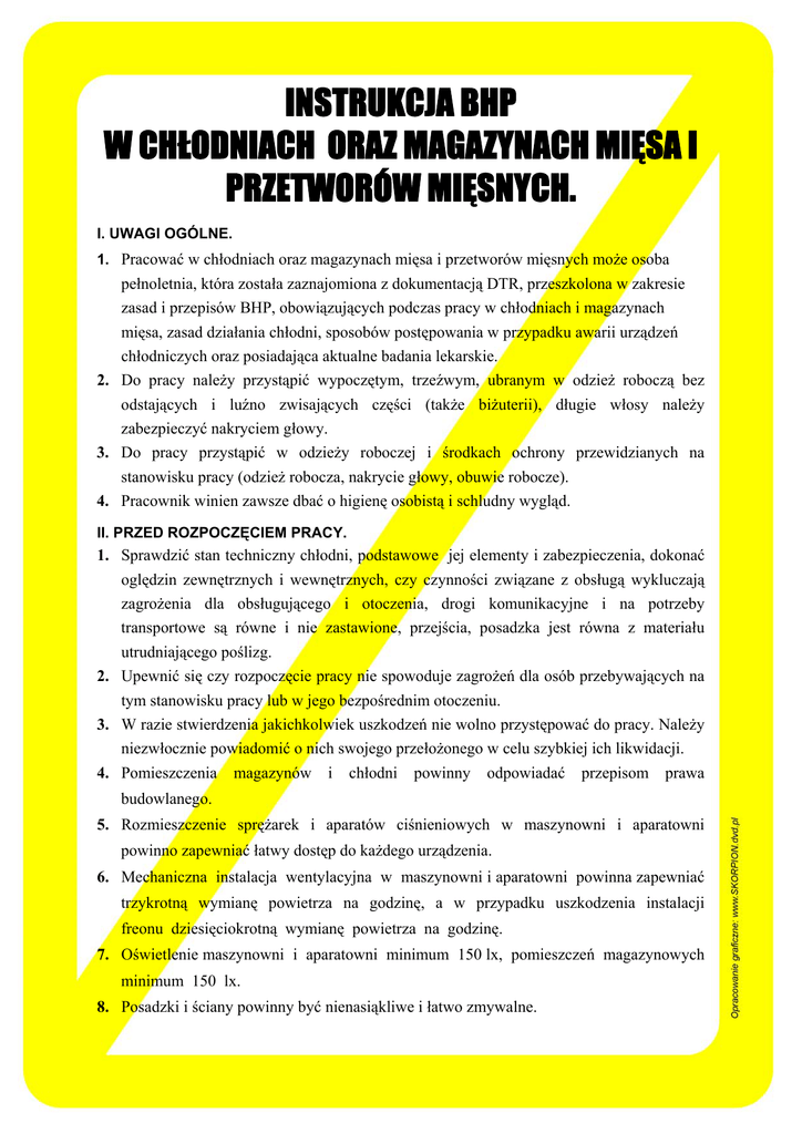 INSTRUKCJA BHP W CHŁODNIACH ORAZ MAGAZYNACH MIĘSA I PRZETWORÓW MIĘSNYCH. I. UWAGI OGÓLNE. 1. Pracować w chłodniach oraz magazynach mięsa i przetworów mięsnych może osoba pełnoletnia, która została zaznajomiona z dokumentacją DTR, przeszkolona w zakresie zasad i przepisów BHP, obowiązujących podczas pracy w chłodniach i magazynach mięsa, zasad działania chłodni, sposobów postępowania w przypadku awarii urządzeń chłodniczych oraz posiadająca aktualne badania lekarskie. 2. Do pracy należy przystąpić wypoczętym, trzeźwym, ubranym w odzież roboczą bez odstających i luźno zwisających części (także biżuterii), długie włosy należy zabezpieczyć nakryciem głowy. 3. Do pracy przystąpić w odzieży roboczej i środkach ochrony przewidzianych na stanowisku pracy (odzież robocza, nakrycie głowy, obuwie robocze). 4. Pracownik winien zawsze dbać o higienę osobistą i schludny wygląd. II. PRZED ROZPOCZĘCIEM PRACY. 1. Sprawdzić stan techniczny chłodni, podstawowe jej elementy i zabezpieczenia, dokonać oględzin zewnętrznych i wewnętrznych, czy czynności związane z obsługą wykluczają zagrożenia dla obsługującego i otoczenia, drogi komunikacyjne i na potrzeby transportowe są równe i nie zastawione, przejścia, posadzka jest równa z materiału utrudniającego poślizg. 2. Upewnić się czy rozpoczęcie pracy nie spowoduje zagrożeń dla osób przebywających na tym stanowisku pracy lub w jego bezpośrednim otoczeniu. 3. W razie stwierdzenia jakichkolwiek uszkodzeń nie wolno przystępować do pracy. Należy niezwłocznie powiadomić o nich swojego przełożonego w celu szybkiej ich likwidacji. 4. Pomieszczenia magazynów i chłodni powinny odpowiadać przepisom prawa budowlanego. 5. Rozmieszczenie sprężarek i aparatów ciśnieniowych w maszynowni i aparatowni powinno zapewniać łatwy dostęp do każdego urządzenia. 6. Mechaniczna instalacja wentylacyjna w maszynowni i aparatowni powinna zapewniać trzykrotną wymianę powietrza na godzinę, a w przypadku uszkodzenia instalacji freonu dziesięciokrotną wymianę powietrza na godzinę. 7. Oświetlenie maszynowni i aparatowni minimum 150 lx, pomieszczeń magazynowych minimum 150 lx. 8. Posadzki i ściany powinny być nienasiąkliwe i łatwo zmywalne. III. W TRAKCIE PRACY I PO JEJ ZAKOŃCZENIU. 1. Koncentrować całą swoja uwagę wyłącznie na czynnościach wykonywanych. 2. Wykonywać tylko prace zlecone przez bezpośredniego przełożonego. PODCZAS PRACY W MASZYNOWNI PRACOWNICY POWINNI : • wykonywać czynności dozoru ściśle wg instrukcji obsługi urządzeń, • bieżąco obserwować wskazania przyrządów pomiarowo-kontrolnych, • wszystkich drobnych kierownictwo, • utrzymywać w stałej sprawności sprzęt przeciwpożarowy i awaryjny. nieprawidłowościach powiadomić niezwłocznie PODCZAS PRACY W MAGAZYNACH PRACOWNICY POWINNI: • urządzenia magazynowe (stojaki, regały itp.) uniemożliwić ich przypadkowe przewrócenie, • przy stosowaniu w transporcie wózków ręcznych szerokość tras komunikacyjnych, aby możliwe przemieszczanie się, ustawiać w taki sposób, należy zachować taką było ich swobodne • układanie i zdejmowanie wyrobów, produktów lub opakowań na wysokość większą niż 1,5 m powinno odbywać się w sposób zmechanizowany, jeśli ręczny to przy zastosowaniu specjalnych pomostów. 3. Po zakończeniu pracy należy zatrzymać obsługiwane maszyny i inne urządzenia, wyłączyć dopływ energii je zasilającej oraz dokładnie oczyścić stanowisko robocze. 4. Upewnić się czy pozostawione stanowisko i urządzenia nie stworzą żadnych zagrożeń dla otoczenia. Zabrania się: • stosowania niebezpiecznych metod pracy, • korzystania z niesprawnych maszyn i urządzeń, pracowania w niesprawnej chłodni itp., • pracowania bez nakazanych ochron osobistych, • naprawiania samodzielnego maszyn, urządzeń, • dopuszczania na stanowiska pracy osób nieupoważnionych przez kierownictwo, • samodzielnego opuszczania stanowiska pracy, • obsługiwania mechanicznych urządzeń dźwignicowych akumulatorowych bez odpowiednich uprawnień, • spożywania posiłków i palenia tytoniu na stanowiskach pracy, • stosowania w maszynowni i aparatowni lamp przenośnych na napięcie wyższe niż 24 V. lub wózków IV. REMONTY I KONSERWACJE. 1. W terminach określonych przepisami sanitarnymi, pomieszczenia magazynowe powinny być sprzątane, myte i odkażane. 2. Remonty, regulacje, naprawy i konserwacje okresowe mogą wykonywać osoby posiadające do tego odpowiednie kwalifikacje. Pracownikowi obsługującemu chłodnię nie wolno tych czynności dokonywać. 3. Przy wykonywaniu czynności związanych z naprawą, regulacją czy konserwacją chłodnia i inne maszyny bądź urządzenia muszą być bezwzględnie zatrzymane i tak zabezpieczone, aby przypadkowe uruchomienie ich nie było w ogóle możliwe. Umieścić tablicę „NAPRAWA – NIE URUCHAMIAĆ ”. 4. Wszelkie prace związane z instalacją elektryczną może wykonywać tylko pracownik z odpowiednimi kwalifikacjami.