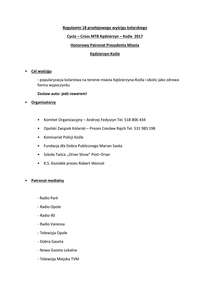 Regulamin 18 przełajowego wyścigu kolarskiego Cyclo – Cross MTB Kędzierzyn – Koźle 2017 Honorowy Patronat Prezydenta Miasta Kędzierzyn-Koźle • Cel wyścigu - popularyzacja kolarstwa na terenie miasta Kędzierzyna-Koźla i okolic jako zdrowa forma wypoczynku Zostaw auto- jedź rowerem! • • Organizatorzy • Komitet Organizacyjny – Andrzej Fedyszyn Tel. 518 806 434 • Opolski Związek Kolarski – Prezes Czesław Rajch Tel. 531 983 198 • Komisariat Policji Koźle • Fundacja dla Dobra Publicznego Marian Saska • Szkoła Tańca ,,Orian Show” Piotr Orian • K.S. Koziołek prezes Robert Wencel Patronat medialny - Radio Park - Radio Opole - Radio 90 - Radio Vanessa - Telewizja Opole - Dobra Gazeta - Nowa Gazeta Lokalna - Telewizja Miejska TVM • Termin i miejsce: 22.01.2017 Kędzierzyn-Koźle (os. Żabieniec) Zbiórka uczestników – Biuro Zawodów Przystań ,,Białasówka” ul. Jagiellońska godz. 8:00 Odprawa Techniczna: godz. 10.30 Zgłoszenia w dniu zawodów w Biurze Zawodów Start i Trasa wyścigu: Żabieniec, ul. Jagiellońska Start pierwszej kategorii zawodników godz. 11.00 • Uczestnictwo W wyścigu mają prawo startu zawodnicy licencjonowani (ważna licencja 2016 oraz ważne badania lekarskie) w kategorii żak, młodzik, junior młodszy, junior, masters. Organizator przewiduje start kategorii niestowarzyszonych do lat 12 niestowarzyszeni muszą posiadać pisemną zgode rodziców lub opikunów prawnych. • Trasa i dystans Wyścig zostanie rozegrany na trasie okrężnej – długość 1 okrążenia ok. 1600m Dystans/czas dla zawodników licencjonowanych zgodnie z przepisami PZKOL młodzik – 20 minut; junior młodszy – 30 minut; junior – 40 minut Pozostali startujący – dystans zostanie uzgodniony i podany na odprawie technicznej. 7. Nagrody dla zwycięzców - puchary - miejsca 1 – 3 - dyplomy – miejsca 1 - 6 - nagrody rzeczowe (wysokość nagród zostanie ogłoszona na odprawie) Rozdanie nagród nastąpi bezpośrednio po zawodach. 8. Postanowienia końcowe Dyrektor Wyścigu: – Andrzej Fedyszyn Tel. 518 806 434 / 77 482 33 52. Dyrektor Organizacyjny: Piotr Orian , Robert Wencel. Koszty organizacyjne zawodów ponoszą organizatorzy. Koszty uczestnictwa zawodników i osób towarzyszących pokrywają jednostki, kluby zgłaszające udział w zawodach. Opłata startowa według przepisów PZKOL. Sędziego Głównego wyznaczy OZKOL w porozumieniu z Organizatorem. Edward Bratuś. Komputer i pomiar elektroniczy firma ,,Orian-Show. Dwa boksy serwisowe Skład sędziowski zostanie uzupełniony na wniosek organizatora przez OZKOL. Zawodnicy startują na własną odpowiedzialność. Zawodnicy oraz osoby towarzyszące winni być ubezpieczeni indywidualnie przez kluby macierzyste. Organizator nie ponosi odpowiedzialności za wypadki powstałe podczas zawodów. Organizator nie ponosi odpowiedzialności za rzeczy zagubione lub skradzione podczas trwania zawodów. Wszystkie kwestie sporne rozstrzyga sędzia główny w porozumieniu z organizatorem. Najbliższy szpital znajduję się w Kędzierzynie-Koźlu ul. Roosvelta 4 tel. 77 4062481