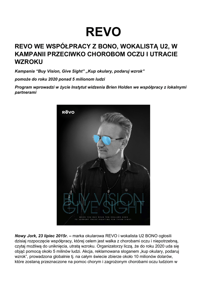 REVO REVO WE WSPÓŁPRACY Z BONO, WOKALISTĄ U2, W KAMPANII PRZECIWKO CHOROBOM OCZU I UTRACIE WZROKU Kampania “Buy Vision, Give Sight” „Kup okulary, podaruj wzrok” pomoże do roku 2020 ponad 5 milionom ludzi Program wprowadzi w życie Instytut widzenia Brien Holden we współpracy z lokalnymi partnerami Nowy Jork, 23 lipiec 2015r. – marka okularowa REVO i wokalista U2 BONO ogłosili dzisiaj rozpoczęcie współpracy, której celem jest walka z chorobami oczu i niepotrzebną, czytaj możliwą do uniknięcia, utratą wzroku. Organizatorzy liczą, że do roku 2020 uda się objąć pomocą około 5 milinów ludzi. Akcja, reklamowana sloganem „kup okulary, podaruj wzrok”, prowadzona globalnie tj. na całym świecie zbierze około 10 milionów dolarów, które zostaną przeznaczone na pomoc chorym i zagrożonym chorobami oczu ludziom w biedniejszych regionach świata. Nie tylko uzyskają dostęp do przesiewowych badań wzroku, ale również będą mieli możliwość dobrania i bezpłatnego wykonania odpowiednich okularów korekcyjnych oraz poddania się specjalistycznemu leczeniu. W praktyce wyglądać to będzie tak: 10 dolarów od każdej sprzedanej pary okularów REVO przekazane zostanie na konto tej akcji i tak aż do momentu zebrania całej sumy tj. 10 milionów dolarów. Zagospodarowaniem zebranych przez REVO I BONO funduszy i praktyczną realizacją postawionych zadań zajmie się, zaproszona do współpracy, organizacja non- profit Brien Holden Vision Institute. W pierwszej kolejności realizowane będą przesiewowe testy widzenia, dobór i przepisywanie okularów korekcyjnych, leczenie. Kolejnym planowanym krokiem będzie tworzenie lub rozbudowa podstawowego systemu zapobiegania i przeciwdziałania chorobom oczu. Tu znajdzie się miejsce na szkolenia przedstawicieli miejscowej ludności w zakresie profilaktyki zdrowotnej i zdobywania podstawowych umiejętności pozwalających wykrywać choroby oczu. Większość funduszy przekazanych przez REVO do Brien Holden przeznaczne zostanie na wsparcie ich kampanii „Our Children Vision” („Wzrok naszych dzieci”), której celem jest zapobieżenie chorobom oczu i utracie wzroku u ponad 50 milionów dzieci do roku 2020. Część funduszy wesprze też badania naukowe z zakresu chorób oczu. Szacuje się, że obecnie około 625 milionów ludzi na świecie cierpi na różnego rodzaju choroby oczy lub straciło wzrok. Według szacunków Brien Holden prawie 75% wszystkich chorób oczu, wliczając: krótkowzroczność, nadwzroczność, astygmatyzm i nie operowaną zaćmę, jest możliwa do uniknięcia lub wyleczenia, pod warunkiem stosowania odpowiedniej profilaktyki, w tym noszenia okularów korekcyjnych. Bono, który może pochwalić się długą i imponującą historią pomocy w zwalczaniu chorób na świecie, głównie HIV/AIDS, sam cierpi od 20 lat na jaskrę. Jego doświadczenia związane z chorobą, którą ma możliwość skutecznie leczyć, skłoniły go do walki o łatwiejszy dostęp wszystkich ludzi do leczenia chorób oczu. Wokalista U2 pojawi się w reklamach REVO i w materiałach promujących kampanię „Kup okulary, podaruj wzrok”. „Kampania „Kup okulary, podaruj wzrok” jest dla mnie bardzo osobistym przeżyciem” – powiedział Bono. Dzięki doskonałej opiece medycznej moje oczy mają się dobrze, ale dziesiątki milionów chorych ludzi na świecie nie dostaje takiej szansy. Nie mają możliwości noszenia okularów korekcyjnych, ani nawet dostępu do podstawowych badań wzroku. Słabe widzenie nie zagraża może życiu, ale jeśli nie masz możliwości leczenia i korygowania wad, upośledza je w znacznym stopniu. Eksperci z którymi rozmawiamy twierdzą, że największym problemem jest właśnie nie leczone, nie korygowane słabe widzenie, które sprawia, że dzieci nie mogą korzystać z nauki w szkole, a dorośli nie są w stanie poprawnie wykonywać swojej pracy. Każdy człowiek ma prawo widzieć i dlatego kampania „Kup okulary, podaruj wzrok” pomoże milionom ludzi zbadać swoje oczy i otrzymać okulary, które pozwolą im dobrze widzieć.” Bono podkreślił też, że ” Brien Holden okazał się doskonałym partnerem, który wykonuje ważną i wspaniałą pracę, ściśle współpracując z przedstawicielami lokalnych społeczności. To niezwykle inspirujące, co już udało im się osiągnąć. Jestem podekscytowany możliwością współpracy z nimi i z REVO.” Ychuda Shmidman, dyrektor generalny Sequential Brands Group, właściciel marki Revo powiedział ‘” Jesteśmy podekscytowani tą współpracą. Technologia, w której są produkowane soczewki REVO od początku przodowała w rozwiązaniach prozdrowotnych. Wierzymy, że nasi klienci uznają pomysł pomagania innym poprzez zakup okularów, za godny uwagi. My, jesteśmy dumni z faktu wspierania Bono i Brien Holden w ich walce o umożliwienie milionom ludzi na świecie dostępu do podstawowych badań wzroku i leczenia”. „Badanie wzroku i oczu to podstawa dobrej diagnostyki i dbania o dobry wzrok. Niestety dla milionów ludzi pozbawionych dostępu do badań, najprostsze problemy zdrowotne nie są poddawane leczeniu, co prowadzi do pogorszenia możliwości edukacyjnych dzieci, utraty pracy przez dorosłych i w efekcie zawsze do ubóstwa. Tak nie musi być. Takiej sytuacji można uniknąć” mówi dyrektor generalny ds.projektów w Brien Holden, Kovin Naidoo. „Wspólnymi siłami, w ramach akcji „Kup okulary, podaruj wzrok” możemy odcisnąć trwały ślad w historii walki o powszechny dostęp do badań wzroku.” Wprowadzając soczewki z powłokami lustrzanymi wyprodukowane w technologii testowanej przez NASA, REVO szybko zyskało pozycję lidera na rynku soczewek lustrzanych. Obecnie marka REVO oferuje gwarantujące wyraźne widzenie i najbardziej zaawansowane technologicznie, wysokokontrastowe, polaryzowane okulary i utrzymuje wiodąca pozycje na rynku. Innowacyjny system zarzadzania światłem (LMS) REVO zapewnia najwyżs