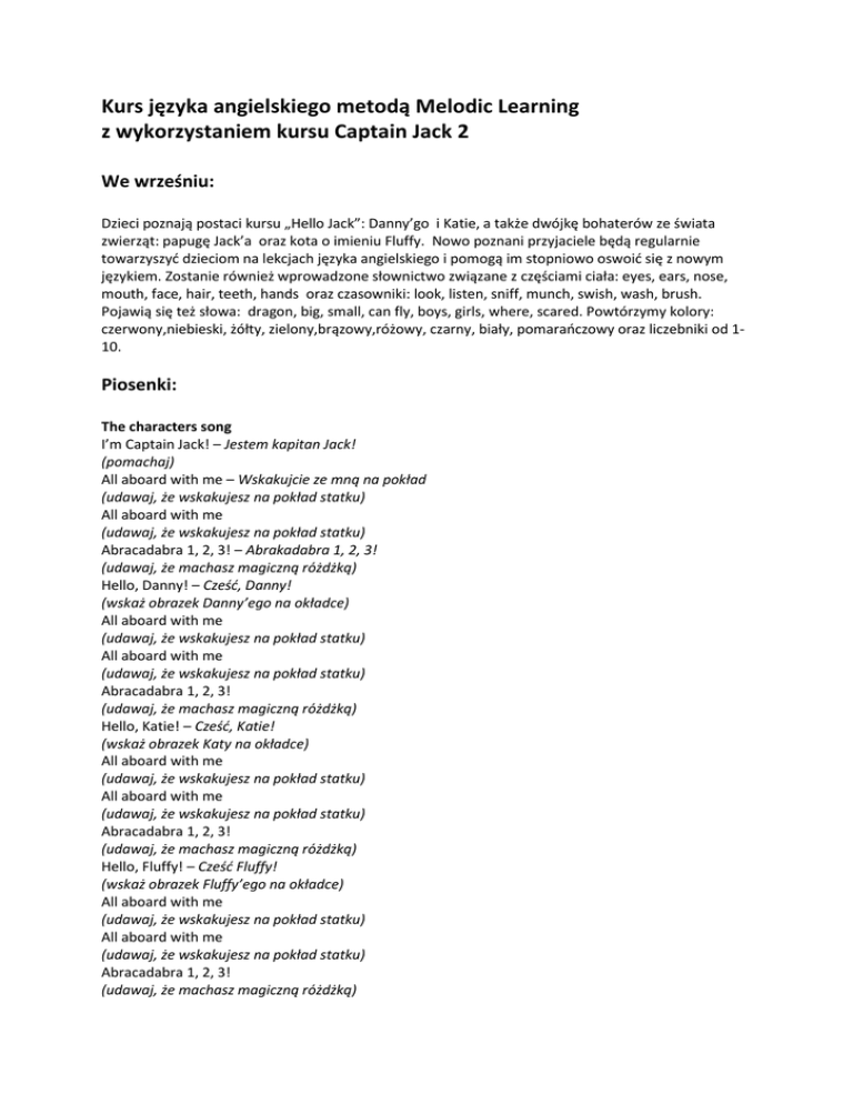 Kurs języka angielskiego metodą Melodic Learning z wykorzystaniem kursu Captain Jack 2 We wrześniu: Dzieci poznają postaci kursu „Hello Jack”: Danny’go i Katie, a także dwójkę bohaterów ze świata zwierząt: papugę Jack’a oraz kota o imieniu Fluffy. Nowo poznani przyjaciele będą regularnie towarzyszyć dzieciom na lekcjach języka angielskiego i pomogą im stopniowo oswoić się z nowym językiem. Zostanie również wprowadzone słownictwo związane z częściami ciała: eyes, ears, nose, mouth, face, hair, teeth, hands oraz czasowniki: look, listen, sniff, munch, swish, wash, brush. Pojawią się też słowa: dragon, big, small, can fly, boys, girls, where, scared. Powtórzymy kolory: czerwony,niebieski, żółty, zielony,brązowy,różowy, czarny, biały, pomarańczowy oraz liczebniki od 110. Piosenki: The characters song I’m Captain Jack! – Jestem kapitan Jack! (pomachaj) All aboard with me – Wskakujcie ze mną na pokład (udawaj, że wskakujesz na pokład statku) All aboard with me (udawaj, że wskakujesz na pokład statku) Abracadabra 1, 2, 3! – Abrakadabra 1, 2, 3! (udawaj, że machasz magiczną różdżką) Hello, Danny! – Cześć, Danny! (wskaż obrazek Danny’ego na okładce) All aboard with me (udawaj, że wskakujesz na pokład statku) All aboard with me (udawaj, że wskakujesz na pokład statku) Abracadabra 1, 2, 3! (udawaj, że machasz magiczną różdżką) Hello, Katie! – Cześć, Katie! (wskaż obrazek Katy na okładce) All aboard with me (udawaj, że wskakujesz na pokład statku) All aboard with me (udawaj, że wskakujesz na pokład statku) Abracadabra 1, 2, 3! (udawaj, że machasz magiczną różdżką) Hello, Fluffy! – Cześć Fluffy! (wskaż obrazek Fluffy’ego na okładce) All aboard with me (udawaj, że wskakujesz na pokład statku) All aboard with me (udawaj, że wskakujesz na pokład statku) Abracadabra 1, 2, 3! (udawaj, że machasz magiczną różdżką) The colours song Abracadabra! (udawaj, że machasz magiczną różdżką) Abracadabra! (udawaj, że machasz magiczną różdżką) Abracadabra! (udawaj, że machasz magiczną różdżką) 1, 2, 3! (udawaj, że machasz magiczną różdżką trzy razy) Yellow, red, purple (wskaż kolorowe karty) Green, white, pink (wskaż kolorowe karty) Black, orange, blue (wskaż kolorowe karty) And brown, too! (wskaż kolorowe karty) Abracadabra! (udawaj, że machasz magiczną różdżką) Abracadabra! (udawaj, że machasz magiczną różdżką) Abracadabra! (udawaj, że machasz magiczną różdżką) 1, 2, 3! (udawaj, że machasz magiczną różdżką trzy razy) Domowa zabawa z językiem angielskim Przed zaśpiewaniem piosenki „The colours song” warto przygotować dla każdego śpiewającego kredki lub mazaki w różnych kolorach: żółtym, czerwonym, fioletowym, zielonym, białym, różowym, czarnym, pomarańczowym, niebieskim i brązowym. Dziecko i rodzic będą mogli wówczas wskazywać przedmioty w odpowiednich kolorach w trakcie śpiewania piosenki WSKAŻ KOLORY W ramach przygotowań do zabawy rodzic pokazuje dziecku kredki lub mazaki w dziesięciu kolorach: czerwonym, zielonym, niebieskim, żółtym, czarnym, różowym, pomarańczowym, fioletowym, białym i brązowym, wymienia nazwy kolorów po angielsku: red / green / blue / yellow / black / pink / orange / purple / white / brown i zachęca malucha do powtarzania. Następnie wydaje polecenia: Point to... i prosi, żeby dziecko wskazało odpowiednią kredkę lub mazak. ZNAJDŹ KOLO RY Do zabawy najlepiej jest wybrać pokój dziecka. Rodzic prosi, aby maluch przyjrzał się różnym kolorom w wybranym pomieszczeniu. Następnie wydaje polecenia: Find red / green / blue / yellow / black / pink / orange / purple / white / brown. Zadaniem dziecka jest podbiegnięcie do przedmiotu w wymienionym kolorze. Następnie rodzic wskazuje różne przedmioty w pokoju, a dziecko określa po angielsku, w jakim są kolorze lub kolorach. Piosenki: The face song This is my face! – To jest moja twarz! (wskaż swoją twarz) This is my face! (wskaż swoją twarz) I’ve got eyes – Mam oczy (wskaż swoje oczy) Look, look, look! – Spójrz... (przystaw dłoń do czoła i rozglądaj się) I’ve got ears – Mam uszy (wskaż swoje uszy) Listen, listen, listen! – Słuchaj... (przyłóż dłonie do uszu) I’ve got a nose – Mam nos . (wskaż swój nos) Sniff, sniff, sniff! – Wąchaj... (pociągnij nosem) I’ve got a mouth – Mam usta (wskaż swoje usta) Munch, munch, munch! – Chrup... (udawaj, że jesz) I’ve got hair – Mam włosy (wskaż swoje włosy) Swish, swish, swish! – Zaszeleść... (poruszaj głową z boku na bok) The big and small song Big, big ears – Duże, duże uszy (przyłóż dłonie do uszu) Big, big eyes – Duże, duże oczy (rób palcami duże koła wokół swoich oczu) Big, big nose – Duży, duży nos (rób palcem duże koło wokół swojego nosa) Big, big mouth – Duże, duże usta (rób palcem duże koło wokół swoich ust) I’m big, big, big – Jestem duży, duży, duży (wyciągnij ręce na boki) And I can fly! – I potrafię latać! (poruszaj rękami w górę i w dół) Bye-bye! Bye-bye! – Pa, pa!... (machaj) Small, small ears – Małe, małe uszy (przyłóż dłonie do uszu) Small, small eyes – Małe, małe oczy (rób palcami małe koła wokół swoich oczu) Small, small nose – Mały, mały nos (rób palcem małe koło wokół swojego nosa) Small, small mouth – Małe, małe usta (rób palcem małe koło wokół swoich ust) I’m small, small, small – Jestem mały, mały, mały (ułóż ręce wzdłuż ciała) And I can fly! (poruszaj rękami w górę i w dół) Bye-bye! Bye-bye! (machaj) Domowa zabawa z językiem angielskim Należy przygotować 10 obrazków smoków w różnych kolorach. Rodzic wskazuje każdy z obrazków i prosi dziecko o nazwanie kolorów oraz o policzenie smoków. Następnie prosi malucha o wyjście z pokoju i chowa kilka obrazków w różnych miejscach. Dziecko wraca i stara się