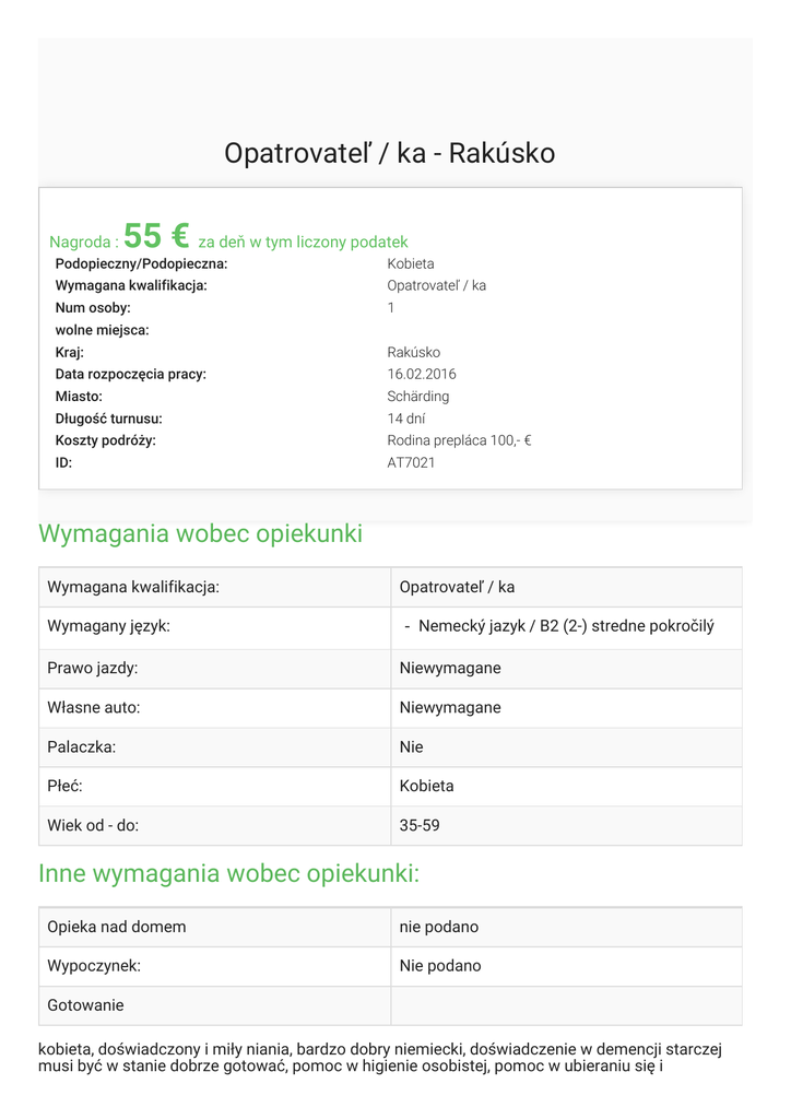 Agencja personalna Opatrovateľ / ka - Rakúsko Nagroda : 55 € za deň w tym liczony podatek Podopieczny/Podopieczna: Kobieta Wymagana kwalifikacja: Opatrovateľ / ka Num osoby: 1 wolne miejsca: Kraj: Rakúsko Data rozpoczęcia pracy: 16.02.2016 Miasto: Schärding Długość turnusu: 14 dní Koszty podróży: Rodina prepláca 100,- € ID: AT7021 Wymagania wobec opiekunki Wymagana kwalifikacja: Wymagany język: Opatrovateľ / ka - Nemecký jazyk / B2 (2-) stredne pokročilý Prawo jazdy: Niewymagane Własne auto: Niewymagane Palaczka: Nie Płeć: Kobieta Wiek od - do: 35-59 Inne wymagania wobec opiekunki: Opieka nad domem nie podano Wypoczynek: Nie podano Gotowanie kobieta, doświadczony i miły niania, bardzo dobry niemiecki, doświadczenie w demencji starczej musi być w stanie dobrze gotować, pomoc w higienie osobistej, pomoc w ubieraniu się i rozbieraniu, pomoc domowa, gotować, prać, czyste, żelaza, pomoc w ogrodzie, kupić, się między 15: 00-17: 00, oddzielny pokój dostępne austriackiego partnera jest wypłacane roczna opłata € 200. ubiegać się o stałej rodziny stać przez dwa tygodnie Frau und eine Liebe Erfahrene sehr gute, Pflegerin, Erfahrungen z Deutschkenntnisse Aletrsdemenz, muss gut kochen können, Hilfe bei der Körperhygiene, An- und Hilfe beim Ausziehen Hilfe im Haushalt - Kochen, Wäsche waschen, aufräumen, bügeln Hilfe im Garten - nach Bedarf, Einkauf erledigen, Czas wolny - od 15:00 do 17:00, własny pokój vorhanden Registrationsgebühr - 200 € zählt-bei Familie Stabiler fuer Ersatz 2 tygodnie Opis diagnozy pacjenta 1 Podopieczny/Podopieczna: Kobieta Wiek: Wzrost: 165 cm Waga: 65 kg Stopień niepełnosprawności: 2 Ruchliwość: Chôdza s oporou Główna diagnoza pacjenta: Starecká demencia - Duševné ochorenie Diagnozy uboczne: Nie podano Opis diagnozy pacjenta: kobieta, źle widzi przekroczył atak serca, począwszy starcze osłabienie, począwszy demencji starczej, porusza się kijami, mieszka nastrojowy Frau, problemem Auguen, Herzinfarkt, Altersschwäche, Altersdemenz, Bewegung mit Hilfe Zdjęcie vom Zadania opiekunki Sprzęt do pracy: Nie podano Informacjie dodatkowe: Nie podano Nagroda Nagroda: 55 € za deň w tym liczony podatek Koszty podróży: Rodina prepláca 100,- € Długość turnusu: 14 dní Zaliczka: - Nie podano Wkład na składki: Výška platu je uvedená v čistom. Táto rodina prispieva na odvody do sociálnej poisťovne (SVA) sumou do: 200,- € V prípade, že vaše mesačné odvody budú vyššie ako 200,- €, tak si zvyšnú sumu hradíte sami. Aktuálne informácie o výške odvodov, ako aj iné informácie nájdete na web stránke: http://esvsva.sozvers.at/portal27/portal/svaportal/start/startWindow? action=2&p_menuid=6259&p_tabid=1 Prowizje i premie: - prowizja za polecenie 100€ Środowisko pracy Typ zamieszkania: Rodinný dom Oddzielny pokój do dyspozycji: Tak Internet do dyspozycji: Nie je k dispozícií Telewizja do dyspozycji: Nie podano Oddzielna toaleta do dyspozycji: Nie podano Oddzielna łazienka do dyspozycji: Nie podano Zwierzęta w domu: Nie podano Ilość osób w domu: 0 Inne osoby w domu Nie podano Potrzebne dokumenty - prihlasovací formulár (po registrácií dostupný na stiahnutie) - osvedčenie od lekára - potvrdenie z banky o vedení bankového účtu - certifikát (opatrovateľský kurz min. v rozsahu 200 hodín) alebo zdravotné vzdelanie (vysvedčenie) : preložené do nemčiny (za poplatok 10,- € preložíme do 24 hodín). - výpis z registra trestov, úradne preložený do nemčiny (za poplatok 26,- € preložíme do 24 hodín). - V prípade, že máte zriadenú živnosť v Rakúsku nie je potrebný výpis z registra trestov ale kópia Geverbe listu. - aktuálnu fotku tváre alebo celej postavy (prípadne fotku Vás a opatrovanej osoby) - Rodný list (za poplatok 10,- € preložíme do 24 hodín). - Sobášny list ak ho máte (za poplatok 10,- € preložíme do 24 hodín). Všetky dokumenty posielajte vo farebnom vyhotovení. !!! Taktiež je potrebné zobrať si všetky dokumenty so sebou na osobný pohovor. Uzupełniające informacje Výška platu je uvedená v čistom. Táto rodina prispieva na odvody do sociálnej poisťovne (SVA) sumou do: 200,- € V prípade, že vaše mesačné odvody budú vyššie ako 200,- €, tak si zvyšnú sumu hradíte sami. Aktuálne informácie o výške odvodov, ako aj iné informácie nájdete na web stránke: http://esvsva.sozvers.at/portal27/portal/svaportal/start/startWindow?action=2&p_menuid=6259&p_tabid=1