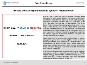 Raport tygodniowy 2013-11-15 Będzie dobrze czyli tydzień na rynkach finansowych BIURO ANALIZ ADMIRAL MARKETS RAPORT TYGODNIOWY 15.11.2013 Kończący się tydzień miał trzy wydarzenia o których warto wspomnieć w jego podsumowaniu. Mianowicie przesłuchanie Janet Yellen przez Komisję Bankową Senatu USA, publikację wstępnych szacunków dynamiki Produktu Krajowego Brutto (PKB) dla dużej grupy państw Unii Europejskiej oraz raport Banku Anglii nt. inflacji. Wnioski są optymistyczne dla rynków akcji. Będzie dobrze. Fed jeszcze długo będzie prowadził ultraluźną politykę monetarną. W kontynentalnej Europie wróciło umiarkowane, aczkolwiek nierównomierne, ożywienie. Wyraźnie za to poprawiła się sytuacja w brytyjskiej gospodarce, co jednak nie oznacza szybkiego zbliżenia się momentu podwyżek stóp procentowych przez Bank Anglii. Mając to wszystko na uwadze można postawić tezę, że jeszcze przynajmniej przez 2-3 tygodnie będzie trwała hossa na światowych rynkach akcji (później duża i długa korekta). Funt może zyskiwać do głównych walut. Waluty rynków mają chwilę oddechu po ostatnich przecenach. A na silniejsze umocnienie dolara (jako efekt zbliżającej się normalizacji polityki monetarnej) jeszcze trochę zaczekamy. W trzecim tygodniu listopada ton wydarzeniom będzie nadawać publikacja protokołów z ostatnich posiedzeń BoE i FOMC, wstępne odczyty indeksów PMI, niemieckie indeksy ZEW i Ifo, posiedzenie BoJ, a przede wszystkim cała seria wystąpień przedstawicieli głównych banków centralnych. www.admiralmarkets.pl 1 Raport tygodniowy 2013-11-15 Gołębicy cień nad Senatem USA Przesłuchanie Janet Yellen, obecnej wiceszefowej Fed, a od lutego 2014 roku prawdopodobnej szefowie tej instytucji, przez Komisję Bankową Senatu USA, co jest pierwszym krokiem do zatwierdzenia jej nominacji na szefa Fed, było jednym z wydarzeń kończącego się tygodnia. Nawet pomimo, że dla rynku walutowego tak naprawdę był to mały deszcz z naprawdę dużej chmury. Wydarzenie, jakim był przesłuchanie przyszłego szefa Fed, zostało „rozmontowane” z jednej strony przez wcześniejszą publikację treści wystąpienia. Z drugiej, przez samą Yellen, która niczym nie zaskoczyła i potwierdziła, że w spojrzeniu na politykę monetarną jest „gołębicą”. Yellen podtrzymała w inwestorach przeświadczenie, że zasiadając od lutego 2014 roku na fotelu prezesa Fed, będzie kontynuatorką obecnie prowadzonej polityki (której przecież jest współautorką) przez Bena Bernanke. Yellen zadeklarowała, że będzie dalej pracować na rzecz wspierania odbicia gospodarczego w USA i zrobi wszystko co konieczne, żeby to odbicie podtrzymać. Odnosząc się do sytuacji na rynku pracy powiedziała, że bezrobocie wciąż pozostaje zbyt wysokie. Jeżeli natomiast chodzi o QE3 to w opinii Yellen wparł on gospodarkę, a korzyści przewyższają koszty tego programu (aczkolwiek Fed na bieżąco analizuje www.admiralmarkets.pl jego skuteczność i koszty). Obecna wiceprezes Fed nie dostrzega też bańki na rynkach akcji. Słowa Yellen wsparły nastroje na rynkach i nieco zmniejszyły narosłe po ostatniej serii bardzo dobrych danych z USA obawy o to, że Fed będzie wcześnie ograniczał wartość skupowanych przez siebie obligacji. Pomimo to wciąż zakładamy, że do pierwszego cięcia QE3 dojdzie wcześniej niż w marcu 2014 roku (taki jest rynkowy konsensus). Oczekujemy też, że ponad wszelką wątpliwość takiej decyzji o cięciu QE3 będzie towarzyszyła inna decyzja, mianowicie obniżająca docelowy poziom stopy bezrobocia (obecnie to 6,5%, być może nowym celem będzie 6%), który to cel warunkuje utrzymanie rekordowo niskich stóp procentowych. Fed ma bowiem świadomość, że samo zapewnienie, że spadek bezrobocia do 6,5% nie oznacza automatycznej podwyżki stóp procentowych, nie uchroni przed wzrostem rynkowych stóp procentowych. Nie jest wykluczone, że na grudniowym posiedzeniu FOMC mogłoby dojść do obniżenia docelowego poziomu dla stopy bezrobocia , czemu będzie towarzyszyła zapowiedź cięcia QE3 od I kwartału 2014 roku. To możliwie najbardziej skrajny w tej chwili scenariusz jeżeli chodzi o politykę monetarną w USA. 2 Raport tygodniowy 2013-11-15 Optymizm Banku Anglii Bank Anglii widzi poprawę w brytyjskiej gospodarce. W opublikowanym Raporcie o inflacji bank podwyższył prognozy wzrostu gospodarczego na ten rok do 1,6% z 1,4% szacowanych jeszcze w sierpniu, a na przyszły rok do 2,8% z 2,5%. Bank też oczekuje, że stopa bezrobocia spadnie do docelowego poziomu 7% w IV kwartale 2014 roku, czyli aż dwa lata wcześniej niż prognozował przed trzema miesiącami. Szybszy wzrost gospodarczy, a przede wszystkim mocniejszy spadek stopy bezrobocia na Wyspach nie oznacza jednak wcześniejszych podwyżek stóp procentowych. Mark Carney, szef BoE, powiedział, że rekordowo niskie stopy mogą być utrzymywane nawet w momencie, gdy bezrobocie spadnie poniżej 7%. Nie wykluczył też, że bank obniży cel dla bezrobocia z obecnego 7% do 6,5%. Uważamy, że to za prawdopodobny krok. Zwłaszcza wtedy, gdy na podobny ruch zdecyduje się Fed. Powyższy scenariusz dłuższego obowiązywania niskich stóp procentowych wspierają też najnowsze dane o inflacji. Podobnie jak w całej Europie, również na Wyspach październik przyniósł jej mocniejszy spadek. Lepsze perspektywy gospodarki, pomimo zapewnienia Carneya ws. stóp, powinny w najbliższym czasie wspierać funta. Szczególnie w relacji do euro, dolara australijskiego, szwajcarskiego franka, czy japońskiego jena. www.admiralmarkets.pl Protokół FOMC i BoE wydarzenia Ważne Tradycyjnie publikacja protokołów z posiedzeń banków centralnych (w tym wypadku FOMC i BOE) to istotny element rynkowej gry. Dane z Niemiec W nadchodzącym tygodniu zostaną opublikowane niemieckie indeksy Ifo i ZEW. Dane mocno różniące się od prognoz będą miały bezpośrednie przełożenie na notowania euro.