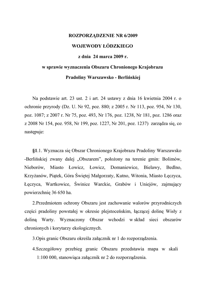 ROZPORZĄDZENIE NR 6/2009 WOJEWODY ŁÓDZKIEGO z dnia 24 marca 2009 r. w sprawie wyznaczenia Obszaru Chronionego Krajobrazu Pradoliny Warszawsko - Berlińskiej Na podstawie art. 23 ust. 2 i art. 24 ustawy z dnia 16 kwietnia 2004 r. o ochronie przyrody (Dz. U. Nr 92, poz. 880; z 2005 r. Nr 113, poz. 954, Nr 130, poz. 1087; z 2007 r. Nr 75, poz. 493, Nr 176, poz. 1238, Nr 181, poz. 1286 oraz z 2008 Nr 154, poz. 958, Nr 199, poz. 1227, Nr 201, poz. 1237) zarządza się, co następuje: §1.1. Wyznacza się Obszar Chronionego Krajobrazu Pradoliny Warszawsko -Berlińskiej zwany dalej „Obszarem”, położony na terenie gmin: Bolimów, Nieborów, Miasto Łowicz, Łowicz, Domaniewice, Bielawy, Bedlno, Krzyżanów, Piątek, Góra Świętej Małgorzaty, Kutno, Witonia, Miasto Łęczyca, Łęczyca, Wartkowice, Świnice Warckie, Grabów i Uniejów, zajmujący powierzchnię 36 650 ha. 2.Przedmiotem ochrony Obszaru jest zachowanie walorów przyrodniczych części pradoliny powstałej w okresie plejstoceńskim, łączącej dolinę Wisły z doliną Warty. Wyznaczony Obszar wchodzi w skład sieci obszarów chronionych i korytarzy ekologicznych. 3.Opis granic Obszaru określa załącznik nr 1 do rozporządzenia. 4.Szczegółowy przebieg granic Obszaru przedstawia mapa w skali 1:100 000, stanowiąca załącznik nr 2 do rozporządzenia. §2. Nadzór nad Obszarem sprawuje Wojewoda Łódzki. §3.Na terenie Obszaru, o którym mowa w § 1 wprowadza się następujące ustalenia dotyczące: 1. czynnej ochrony ekosystemów leśnych: 1) utrzymanie ciągłości i trwałości ekosystemów leśnych; 2) sprzyjanie tworzeniu zwartych kompleksów leśnych; 3) tworzenie i odtwarzanie stref ekotonowych, celem zwiększenia różnorodności biologicznej; 4) utrzymywanie i tworzenie leśnych korytarzy ekologicznych ze szczególnym uwzględnieniem możliwości migracji dużych ssaków; 5) zalesianie i zadrzewianie gruntów mało przydatnych do produkcji rolnej i nie przeznaczonych na inne cele, z wyłączeniem terenów, na których występują nieleśne siedliska przyrodnicze podlegające ochronie, siedliska gatunków roślin, grzybów i zwierząt związanych z ekosystemami nieleśnymi, a także miejsca pełniące funkcje punktów i ciągów widokowych na terenach o dużych wartościach krajobrazowych; 6) pozostawianie drzew o charakterze pomnikowym, drzew dziuplastych, części drzew obumarłych aż do całkowitego ich rozkładu; 7) zachowanie śródleśnych cieków, mokradeł, polan, torfowisk, wrzosowisk, muraw kserotermicznych i piaskowych oraz polan o wysokiej różnorodności biologicznej; 8) utrzymanie odpowiedniego poziomu wód gruntowych dla zachowania siedlisk wilgotnych i bagiennych; 9) zachowanie siedlisk chronionych i zagrożonych gatunków roślin, zwierząt i grzybów; 10) działania na rzecz czynnej ochrony oraz reintrodukcji rzadkich i zagrożonych gatunków roślin, zwierząt i grzybów. 2. czynnej ochrony innych ekosystemów lądowych: 1) przeciwdziałanie procesom zarastania łąk i pastwisk cennych ze względów przyrodniczych i krajobrazowych; 2) zachowanie śródpolnych torfowisk, obszarów wodno – błotnych, oczek wodnych wraz z pasem roślinności stanowiącej ich obudowę biologiczną oraz obszarów źródliskowych cieków; 3) kształtowanie zróżnicowanego krajobrazu rolniczego poprzez zachowanie mozaiki pól uprawnych, miedz, płatów wieloletnich ziołorośli, a także ochronę istniejących oraz formowanie nowych zadrzewień i zakrzewień śródpolnych i przydrożnych; 4) utrzymywanie i zwiększanie powierzchni trwałych użytków zielonych; 5) prowadzenie zabiegów agrotechnicznych z uwzględnieniem wymogów zbiorowisk roślinnych i zasiedlających je gatunków fauny, zwłaszcza ptaków (odpowiednie terminy, częstość i techniki koszenia); 6) utrzymywanie poziomu wód gruntowych odpowiedniego dla zachowania różnorodności biologicznej; 7) zachowanie i odtwarzanie korytarzy ekologicznych; 8) zachowanie siedlisk chronionych i zagrożonych gatunków roślin, zwierząt i grzybów; 9) działania na rzecz czynnej ochrony oraz reintrodukcji rzadkich i zagrożonych gatunków roślin, zwierząt i grzybów. 3. czynnej ochrony ekosystemów wodnych: 1) zachowanie zbiorników wód powierzchniowych wraz z ich naturalną obudową biologiczną; 2) utrzymywanie i tworzenie stref buforowych wzdłuż cieków oraz wokół zbiorników wodnych, w tym starorzeczy i oczek wodnych, w postaci pasów szuwarów, zakrzewień i zadrzewień, jako naturalnej obudowy biologicznej, celem zwiększenia różnorodności biologicznej oraz ograniczenia spływu substancji biogennych; 3) prowadzenie prac regulacyjnych cieków w zakresie niezbędnym dla ochrony przeciwpowodziowej i w oparciu o zasady dobrej praktyki utrzymania rzek; 4) zwiększanie retencji wodnej, odtwarzania funkcji obszarów źródliskowych o dużych zdolnościach retencyjnych; 5) zachowanie i odtwarzanie korytarzy ekologicznych opartych o ekosystemy wodne, celem zachowania dróg migracji gatunków; 6) działania na rzecz czynnej ochrony oraz reintrodukcji rzadkich i zagrożonych gatunków roślin, zwierząt i grzybów. §4.1. Na Obszarze wprowadza się następujące zakazy: 1) zabijania dziko występujących zwierząt, niszczenia ich nor, legowisk, innych schronień i miejsc rozrodu oraz tarlisk, złożonej ikry, z wyjątkiem amatorskiego połowu ryb oraz wykonywania czynności związanych z racjonalną gospodarką rolną, leśną, rybacką i łowiecką; 2) realizacji przedsięwzięć mogących znacząco oddziaływać na środowisko w rozumieniu przepisów ustawy z dnia 3 października 2008 r. o udostępnianiu informacji o środowisku i jego ochronie, udziale społeczeństwa w ochronie środowiska oraz o ocenach oddziaływania na środowisko (Dz. U. Nr 199, poz. 1227); 3) likwidowania i niszczenia zadrzewień śródpolnych, przydrożnych i nadwodnych, jeżeli nie wynikają one z potrzeby ochrony przeciwpowodziowej i zapewnienia bezpieczeństwa ruchu drogoweg