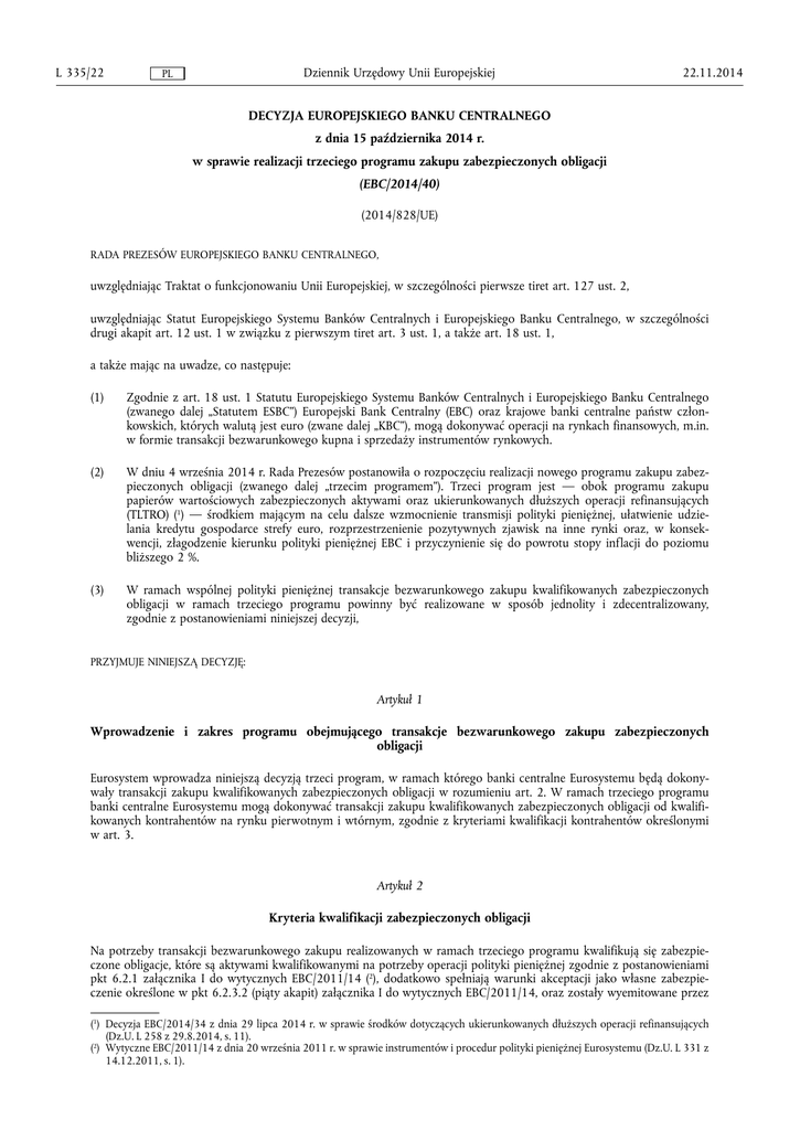 L 335/22 Dziennik Urzędowy Unii Europejskiej PL 22.11.2014 DECYZJA EUROPEJSKIEGO BANKU CENTRALNEGO z dnia 15 października 2014 r. w sprawie realizacji trzeciego programu zakupu zabezpieczonych obligacji (EBC/2014/40) (2014/828/UE) RADA PREZESÓW EUROPEJSKIEGO BANKU CENTRALNEGO, uwzględniając Traktat o funkcjonowaniu Unii Europejskiej, w szczególności pierwsze tiret art. 127 ust. 2, uwzględniając Statut Europejskiego Systemu Banków Centralnych i Europejskiego Banku Centralnego, w szczególności drugi akapit art. 12 ust. 1 w związku z pierwszym tiret art. 3 ust. 1, a także art. 18 ust. 1, a także mając na uwadze, co następuje: (1) Zgodnie z art. 18 ust. 1 Statutu Europejskiego Systemu Banków Centralnych i Europejskiego Banku Centralnego (zwanego dalej „Statutem ESBC”) Europejski Bank Centralny (EBC) oraz krajowe banki centralne państw człon kowskich, których walutą jest euro (zwane dalej „KBC”), mogą dokonywać operacji na rynkach finansowych, m.in. w formie transakcji bezwarunkowego kupna i sprzedaży instrumentów rynkowych. (2) W dniu 4 września 2014 r. Rada Prezesów postanowiła o rozpoczęciu realizacji nowego programu zakupu zabez pieczonych obligacji (zwanego dalej „trzecim programem”). Trzeci program jest — obok programu zakupu papierów wartościowych zabezpieczonych aktywami oraz ukierunkowanych dłuższych operacji refinansujących (TLTRO) (1) — środkiem mającym na celu dalsze wzmocnienie transmisji polityki pieniężnej, ułatwienie udzie lania kredytu gospodarce strefy euro, rozprzestrzenienie pozytywnych zjawisk na inne rynki oraz, w konsek wencji, złagodzenie kierunku polityki pieniężnej EBC i przyczynienie się do powrotu stopy inflacji do poziomu bliższego 2 %. (3) W ramach wspólnej polityki pieniężnej transakcje bezwarunkowego zakupu kwalifikowanych zabezpieczonych obligacji w ramach trzeciego programu powinny być realizowane w sposób jednolity i zdecentralizowany, zgodnie z postanowieniami niniejszej decyzji, PRZYJMUJE NINIEJSZĄ DECYZJĘ: Artykuł 1 Wprowadzenie i zakres programu obejmującego transakcje bezwarunkowego zakupu zabezpieczonych obligacji Eurosystem wprowadza niniejszą decyzją trzeci program, w ramach którego banki centralne Eurosystemu będą dokony wały transakcji zakupu kwalifikowanych zabezpieczonych obligacji w rozumieniu art. 2. W ramach trzeciego programu banki centralne Eurosystemu mogą dokonywać transakcji zakupu kwalifikowanych zabezpieczonych obligacji od kwalifi kowanych kontrahentów na rynku pierwotnym i wtórnym, zgodnie z kryteriami kwalifikacji kontrahentów określonymi w art. 3. Artykuł 2 Kryteria kwalifikacji zabezpieczonych obligacji Na potrzeby transakcji bezwarunkowego zakupu realizowanych w ramach trzeciego programu kwalifikują się zabezpie czone obligacje, które są aktywami kwalifikowanymi na potrzeby operacji polityki pieniężnej zgodnie z postanowieniami pkt 6.2.1 załącznika I do wytycznych EBC/2011/14 (2), dodatkowo spełniają warunki akceptacji jako własne zabezpie czenie określone w pkt 6.2.3.2 (piąty akapit) załącznika I do wytycznych EBC/2011/14, oraz zostały wyemitowane przez (1) Decyzja EBC/2014/34 z dnia 29 lipca 2014 r. w sprawie środków dotyczących ukierunkowanych dłuższych operacji refinansujących (Dz.U. L 258 z 29.8.2014, s. 11). (2) Wytyczne EBC/2011/14 z dnia 20 września 2011 r. w sprawie instrumentów i procedur polityki pieniężnej Eurosystemu (Dz.U. L 331 z 14.12.2011, s. 1). 22.11.2014 PL Dziennik Urzędowy Unii Europejskiej L 335/23 instytucje kredytowe z siedzibą w strefie euro. Na potrzeby transakcji bezwarunkowego zakupu realizowanych w ramach trzeciego programu kwalifikują się Multicédulas, które są aktywami kwalifikowanymi na potrzeby operacji polityki pieniężnej zgodnie z postanowieniami pkt 6.2.1 załącznika I do wytycznych EBC/2011/14 oraz które zostały wyemito wane przez podmioty specjalnego przeznaczenia z siedzibą w strefie euro. Opisane powyżej zabezpieczone obligacje kwalifikują się na potrzeby transakcji bezwarunkowego zakupu realizowanych w ramach trzeciego programu, o ile spełniają następujące wymogi dodatkowe: 1. Wymagane jest przyznanie zabezpieczonym obligacjom przez co najmniej jedną zewnętrzną instytucję oceny wiary godności kredytowej (ECAI) zaakceptowaną zgodnie z ramowymi zasadami oceny kredytowej w Eurosystemie (ECAF) oceny jakości kredytowej co najmniej na poziomie stopnia 3 jakości kredytowej (CQS3, obecnie odpowiadającej ocenie na poziomie 'BBB-' lub równoważnej). 2. Całkowity stan posiadania obligacji oznaczonej danym międzynarodowym numerem identyfikacyjnym papierów wartościowych przez wszystkie banki centralne Eurosystemu wspólnie z tytułu pierwszego (1) i drugiego (2) programu zakupów zabezpieczonych obligacji (zwanych dalej „pierwszym programem” i „drugim programem”), z tytułu trze ciego programu oraz z jakiekolwiek innego tytułu, nie może być większy niż 70 %. 3. Zabezpieczone obligacje muszą być denominowane w euro oraz utrzymywane i rozliczane w strefie euro. 4. Na potrzeby transakcji zakupu realizowanych w ramach trzeciego programu nie kwalifikują się zabezpieczone obli gacje wyemitowane przez podmioty, których dostęp do operacji kredytowych Eurosystemu został zawieszony — na czas takiego zawieszenia. 5. W okresie, w którym minimalne wymogi Eurosystemu w zakresie jakości kredytowej nie są stosowane w ramach wymogów w zakresie kwalifikowania zabezpieczeń dotyczących rynkowych instrumentów dłużnych emitowanych lub gwarantowanych przez rząd Grecji lub Cypru (zgodnie z art. 8 ust. 2 wytycznych EBC/2014/31 (3)), zabezpie czone obligacje podmiotów z siedzibą na Cyprze i w Grecji, które obecnie nie posiadają ratingu CQS3, muszą mieć rating na poziomie równym co najmniej najwyższemu ratingowi przyznanemu zabezpieczonym obligacjom przez odpowiednią instytucję w danej jurysdykcji, a całkowity stan posiadania obligacji oznaczonej