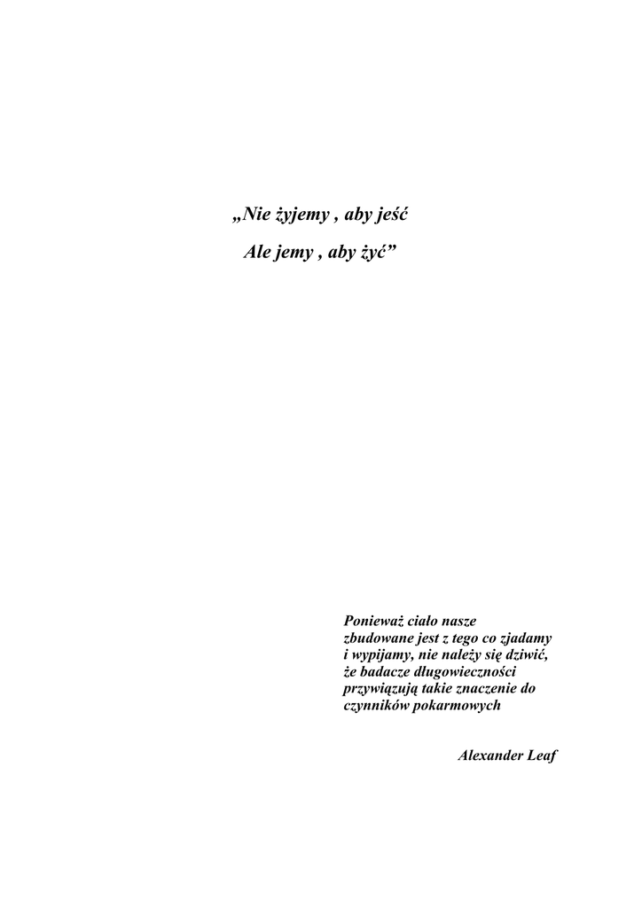 „Nie żyjemy , aby jeść Ale jemy , aby żyć” Ponieważ ciało nasze zbudowane jest z tego co zjadamy i wypijamy, nie należy się dziwić, że badacze długowieczności przywiązują takie znaczenie do czynników pokarmowych Alexander Leaf 1.1 Stara piramida zdrowego żywienia Założenia: Piramida zdrowego żywienia została opracowana w Stanach Zjednoczonych przez Departament Rolnictwa oraz Departament Zdrowia i Opieki Społecznej i jest zestawieniem zaleceń żywieniowym. Polscy dietetycy przystosowali ją do polskich warunków, w prowadzając nieznaczne zmiany zalecanych ilości porcji niektórych grup produktów. Podstawę Piramidy Zdrowego Żywienia i codziennej diety stanowią produkty zbożowe, których zaleca się spożywać około 5 porcji dziennie. Drugi poziom piramidy to 4 porcje warzyw i 3 porcje owoców. Trzecim poziom to 2 do 3 porcji mleka i produktów mlecznych oraz 1 do 2 porcji mięsa, ryb, jaj, nasion roślin strączkowych lub orzechów. Na szczycie piramidy znajdują się tłuszcze i słodycze, których spożycie powinno się ograniczać. Zalecane są oleje roślinne. Rozmieszczenie ilości porcji żywności w poszczególnych posiłkach zależy od ilości posiłków dziennie. Najbardziej wskazane jest rozłożenie spożywanych pokarmów na optymalnie 5 posiłków dziennie lub co najmniej 3 posiłki. Produkty zbożowe powinny występować prawie w każdym posiłku, warzywa i owoce w trzech, produkty mleczne w trzech lub dwóch a mięso w jednym lub w dwóch posiłkach. Mniejsze objętościowo posiłki są lepiej trawione i przyswajane co pozwala na bieżące wykorzystywanie składników odżywczych w procesach metabolicznych. Mniejsza ilość posiłków lub jedzenie nieregularne powodują okresowe braki szybko zużywanych składników pokarmowych. Po obfitym posiłku organizm zużywa dużo energii na trawienie, a układ pokarmowy i narządy wewnętrzne są nadmiernie przeciążone. Po obfitym posiłku organizm nie ma możliwości bieżącego zużycia przyswojonego pokarmu i magazynuje go w postaci rezerw tłuszczowych. Powoduje to również osłabienie sprawności działania układu odpornościowego, który zastaje zaangażowany w transport cząsteczek tłuszczów do różnych tkanek. Organizm człowieka dorosłego zużywa, w optymalnej temperaturze i wilgotności powietrza, w ciągu doby 2 do 3 litrów wody. Około 1,5 litra wody powinno być dostarczone w postaci płynów a reszta w pokarmach. Odwodnienie organizmu jest o wiele bardziej groźne w skutkach jak niedożywienie, gdyż większość procesów biochemicznych organizmu przebiega w roztworach wodnych. Produkty stosowane w diecie powinny posiadać wysoką wartość odżywczą. Należy unikać produktów wysoko przetworzonych, pozbawionych wielu wartościowych składników oraz zawierających dużo soli, cukru, szkodliwych tłuszczów i syntetycznych substancji smakowych i konserwujących. Zaleca się unikać dodatkowego spożywania tłuszczów poza wartościowymi olejami zawierającymi wielonienasycone kwasy tłuszczowe, najlepiej w postaci surowej (np. w sałatkach). Dzieciom do trzeciego roku życia należy podawać masło i oliwę z oliwek oraz oleje, sojowy, słonecznikowy oraz rzepakowy. W starszym wieku należy ograniczać spożywanie masła na rzecz miękkich margaryn zawierających nie więcej niż 1% izomerów trans. Również spożywanie słodyczy powinno być okazjonalne, trzy, cztery porcje w tygodniu. Większość słodyczy to produkty wysokoprzetworzone, zawierające dużo dodatków chemicznych, barwników, konserwantów, związków zapachowych, polepszaczy smaku, tłuszczów nasyconych i tłuszczów trans. Podobne właściwości mają chipsy i inne chrupki smakowe, zawierające dużo soli, cukrów, przypraw i tłuszczów, często w szczególnie szkodliwej postaci utlenionej. Produkty te poza wartościami smakowymi, raczej szkodzą. Do produktów o wysokiej wartości odżywczej należą; chleb razowy i pełnoziarniste kasze, ziemniaki, różnorodne świeże warzywa i owoce, chude mleko, jogurt, chude sery białe, nasiona roślin strączkowych, chude mięso i ryby, tłuste ryby morskie, oliwa z oliwek, oleje roślinne zawierające NNKT. Jadłospis sporządzony według zaleceń Piramidy Zdrowego Żywienia dostarcza około 2000 kcal dziennie. Jest to ilość prawie wystarczająca dla kobiet wykonujących pracę siedząca. Wielkość całkowitej przemiany materii jest indywidualna i zależy od, wieku, płci, rodzaju pracy zawodowej i aktywności pozazawodowej. Planowanie ilości spożywanych pokarmów powinno uwzględniać indywidualne potrzeby energetyczne. Bardzo istotnym jest stosowanie w jadłospisie różnorodnych pokarmów o wysokich wartościach odżywczych, co zabezpiecza przed niedoborami lub nadmiarem niektórych składników pokarmowych. W każdym posiłku powinny znajdować się produkty przynajmniej z trzech grup przedstawionych w piramidzie zdrowia. Należy unikać łączenia w jednym posiłku potraw ciężko strawnych. Najlepiej, gdy potrawy są przygotowywane bezpośrednio przed spożyciem a nie wielokrotnie odgrzewane, gdyż podczas przechowywania tracą wiele wartości odżywczych i mogą ulec zepsuciu. Posiłki powinny zawierać zrównoważoną ilość produktów pod względem ich kwasotwórczości i zasadotwórczości. Zasadotwórcze są warzywa, owoce i produkty mleczne, a kwasotwórcze, produkty zbożowe, mięso, ryby i jaja. W okresie zimy lepiej ograniczać spożywanie nowalijek, które są wyhodowane z użyciem dużej ilości nawozów mineralnych i środków ochrony roślin. Bezpieczniejsze są warzywa mrożone, kiszone lub przechowane ze zbiorów jesiennych. Aby zapobiec kumulowaniu się w naszym organizmie szkodliwych substancji należy unikać kupowania produktów pochodzących z tych samych źródeł, np. ciągle tych samych ryb, z tych samych łowisk, które mogą zawierać trujące metale ciężkie (rtęć, kadm). Dotyczy to również warzyw i owoców, nawet gd