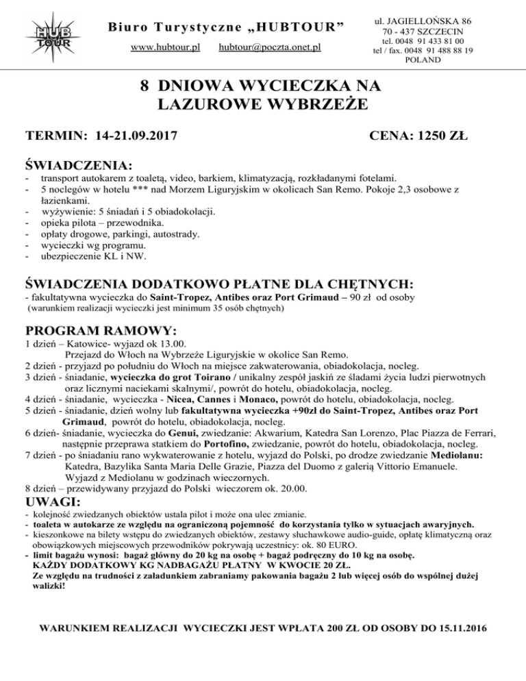 Biuro Turystyczne „HUBTOUR” www.hubtour.pl [email protected] ul. JAGIELLOŃSKA 86 70 - 437 SZCZECIN tel. 0048 91 433 81 00 tel / fax. 0048 91 488 88 19 POLAND 8 DNIOWA WYCIECZKA NA LAZUROWE WYBRZEŻE TERMIN: 14-21.09.2017 CENA: 1250 ZŁ ŚWIADCZENIA: - transport autokarem z toaletą, video, barkiem, klimatyzacją, rozkładanymi fotelami. 5 noclegów w hotelu *** nad Morzem Liguryjskim w okolicach San Remo. Pokoje 2,3 osobowe z łazienkami. wyżywienie: 5 śniadań i 5 obiadokolacji. opieka pilota – przewodnika. opłaty drogowe, parkingi, autostrady. wycieczki wg programu. ubezpieczenie KL i NW. ŚWIADCZENIA DODATKOWO PŁATNE DLA CHĘTNYCH: - fakultatywna wycieczka do Saint-Tropez, Antibes oraz Port Grimaud – 90 zł od osoby (warunkiem realizacji wycieczki jest minimum 35 osób chętnych) PROGRAM RAMOWY: 1 dzień – Katowice- wyjazd ok 13.00. Przejazd do Włoch na Wybrzeże Liguryjskie w okolice San Remo. 2 dzień - przyjazd po południu do Włoch na miejsce zakwaterowania, obiadokolacja, nocleg. 3 dzień - śniadanie, wycieczka do grot Toirano / unikalny zespół jaskiń ze śladami życia ludzi pierwotnych oraz licznymi naciekami skalnymi/, powrót do hotelu, obiadokolacja, nocleg. 4 dzień - śniadanie, wycieczka - Nicea, Cannes i Monaco, powrót do hotelu, obiadokolacja, nocleg. 5 dzień - śniadanie, dzień wolny lub fakultatywna wycieczka +90zł do Saint-Tropez, Antibes oraz Port Grimaud, powrót do hotelu, obiadokolacja, nocleg. 6 dzień- śniadanie, wycieczka do Genui, zwiedzanie: Akwarium, Katedra San Lorenzo, Plac Piazza de Ferrari, następnie przeprawa statkiem do Portofino, zwiedzanie, powrót do hotelu, obiadokolacja, nocleg. 7 dzień - po śniadaniu rano wykwaterowanie z hotelu, wyjazd do Polski, po drodze zwiedzanie Mediolanu: Katedra, Bazylika Santa Maria Delle Grazie, Piazza del Duomo z galerią Vittorio Emanuele. Wyjazd z Mediolanu w godzinach wieczornych. 8 dzień – przewidywany przyjazd do Polski wieczorem ok. 20.00. UWAGI: - kolejność zwiedzanych obiektów ustala pilot i może ona ulec zmianie. - toaleta w autokarze ze względu na ograniczoną pojemność do korzystania tylko w sytuacjach awaryjnych. - kieszonkowe na bilety wstępu do zwiedzanych obiektów, zestawy słuchawkowe audio-guide, opłatę klimatyczną oraz obowiązkowych miejscowych przewodników pokrywają uczestnicy: ok. 80 EURO. - limit bagażu wynosi: bagaż główny do 20 kg na osobę + bagaż podręczny do 10 kg na osobę. KAŻDY DODATKOWY KG NADBAGAŻU PŁATNY W KWOCIE 20 ZŁ. Ze względu na trudności z załadunkiem zabraniamy pakowania bagażu 2 lub więcej osób do wspólnej dużej walizki! WARUNKIEM REALIZACJI WYCIECZKI JEST WPŁATA 200 ZŁ OD OSOBY DO 15.11.2016