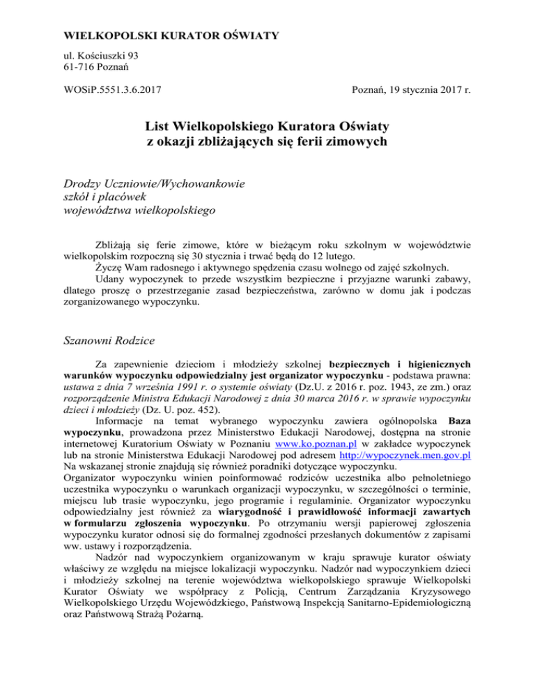 WIELKOPOLSKI KURATOR OŚWIATY ul. Kościuszki 93 61-716 Poznań WOSiP.5551.3.6.2017 Poznań, 19 stycznia 2017 r. List Wielkopolskiego Kuratora Oświaty z okazji zbliżających się ferii zimowych Drodzy Uczniowie/Wychowankowie szkół i placówek województwa wielkopolskiego Zbliżają się ferie zimowe, które w bieżącym roku szkolnym w województwie wielkopolskim rozpoczną się 30 stycznia i trwać będą do 12 lutego. Życzę Wam radosnego i aktywnego spędzenia czasu wolnego od zajęć szkolnych. Udany wypoczynek to przede wszystkim bezpieczne i przyjazne warunki zabawy, dlatego proszę o przestrzeganie zasad bezpieczeństwa, zarówno w domu jak i podczas zorganizowanego wypoczynku. Szanowni Rodzice Za zapewnienie dzieciom i młodzieży szkolnej bezpiecznych i higienicznych warunków wypoczynku odpowiedzialny jest organizator wypoczynku - podstawa prawna: ustawa z dnia 7 września 1991 r. o systemie oświaty (Dz.U. z 2016 r. poz. 1943, ze zm.) oraz rozporządzenie Ministra Edukacji Narodowej z dnia 30 marca 2016 r. w sprawie wypoczynku dzieci i młodzieży (Dz. U. poz. 452). Informacje na temat wybranego wypoczynku zawiera ogólnopolska Baza wypoczynku, prowadzona przez Ministerstwo Edukacji Narodowej, dostępna na stronie internetowej Kuratorium Oświaty w Poznaniu www.ko.poznan.pl w zakładce wypoczynek lub na stronie Ministerstwa Edukacji Narodowej pod adresem http://wypoczynek.men.gov.pl Na wskazanej stronie znajdują się również poradniki dotyczące wypoczynku. Organizator wypoczynku winien poinformować rodziców uczestnika albo pełnoletniego uczestnika wypoczynku o warunkach organizacji wypoczynku, w szczególności o terminie, miejscu lub trasie wypoczynku, jego programie i regulaminie. Organizator wypoczynku odpowiedzialny jest również za wiarygodność i prawidłowość informacji zawartych w formularzu zgłoszenia wypoczynku. Po otrzymaniu wersji papierowej zgłoszenia wypoczynku kurator odnosi się do formalnej zgodności przesłanych dokumentów z zapisami ww. ustawy i rozporządzenia. Nadzór nad wypoczynkiem organizowanym w kraju sprawuje kurator oświaty właściwy ze względu na miejsce lokalizacji wypoczynku. Nadzór nad wypoczynkiem dzieci i młodzieży szkolnej na terenie województwa wielkopolskiego sprawuje Wielkopolski Kurator Oświaty we współpracy z Policją, Centrum Zarządzania Kryzysowego Wielkopolskiego Urzędu Wojewódzkiego, Państwową Inspekcją Sanitarno-Epidemiologiczną oraz Państwową Strażą Pożarną. Rodzice przed wysłaniem dziecka na wypoczynek winni zapoznać się bardzo dokładnie z zaproponowaną przez danego organizatora wypoczynku ofertą, zwracając uwagę m.in. na: warunki sanitarno-higieniczne wybranego na wypoczynek obiektu, w tym warunki zakwaterowania, kadrę pedagogiczną, której zostanie powierzone dziecko, zabezpieczenie dostępu do opieki medycznej podczas trwania wypoczynku, w tym zasady informowania o chorobach i dolegliwościach oraz sposobach przyjmowania leków przez dziecko, postępowania w przypadku hospitalizacji dziecka w czasie wypoczynku, informacje o organizatorze w ogólnopolskiej bazie wypoczynku, szczegółowy program wypoczynku, regulamin pobytu na wypoczynku (m.in.: korzystanie z telefonu komórkowego, zasady korzystania z kieszonkowego – możliwość przechowywania pieniędzy i wartościowych przedmiotów, ewentualne terminy odwiedzin dziecka). Nieprawidłowości dotyczące organizacji wypoczynku, w szczególności w sytuacji wystąpienia zagrożenia dla zdrowia lub życia uczestników wypoczynku można zgłaszać telefonicznie: 1) Kuratorium Oświaty w Poznaniu, tel. 61 8541936, 61 8541 667, od poniedziałku do piątku, w godzinach 8.00 - 15.00, 2) Wojewódzkie Centrum Zarządzania Kryzysowego Wielkopolskiego Urzędu Wojewódzkiego, tel. 61 85 49 900, całodobowo, 3) bezpłatna infolinia, tel. 987. Informacji na temat wypoczynku dzieci i młodzieży szkolnej udzielają wizytatorzy Kuratorium Oświaty w Poznaniu: w Poznaniu: Alicja Maria Rajewicz, tel. 61 854 16 67, w Lesznie: Aldona Maria Grześkowiak-Węglarz, tel. 65 525 99 61, Magdalena Krystyna Jurkiewicz, tel. 65 525 89 02, w Pile: Renata Urszula Ciołek, tel. 67 349 14 59, w Kaliszu: Marzena Szczudlik, tel. 600 211 837, Sławomir Wilak, tel. 600 185 389, w Koninie: Joanna Karolewska, tel. 63 243 51 05 w. 18. Wielkopolski Kurator Oświaty Elżbieta Walkowiak Wielkopolski Kurator Oświaty /-/ Elżbieta Leszczyńska