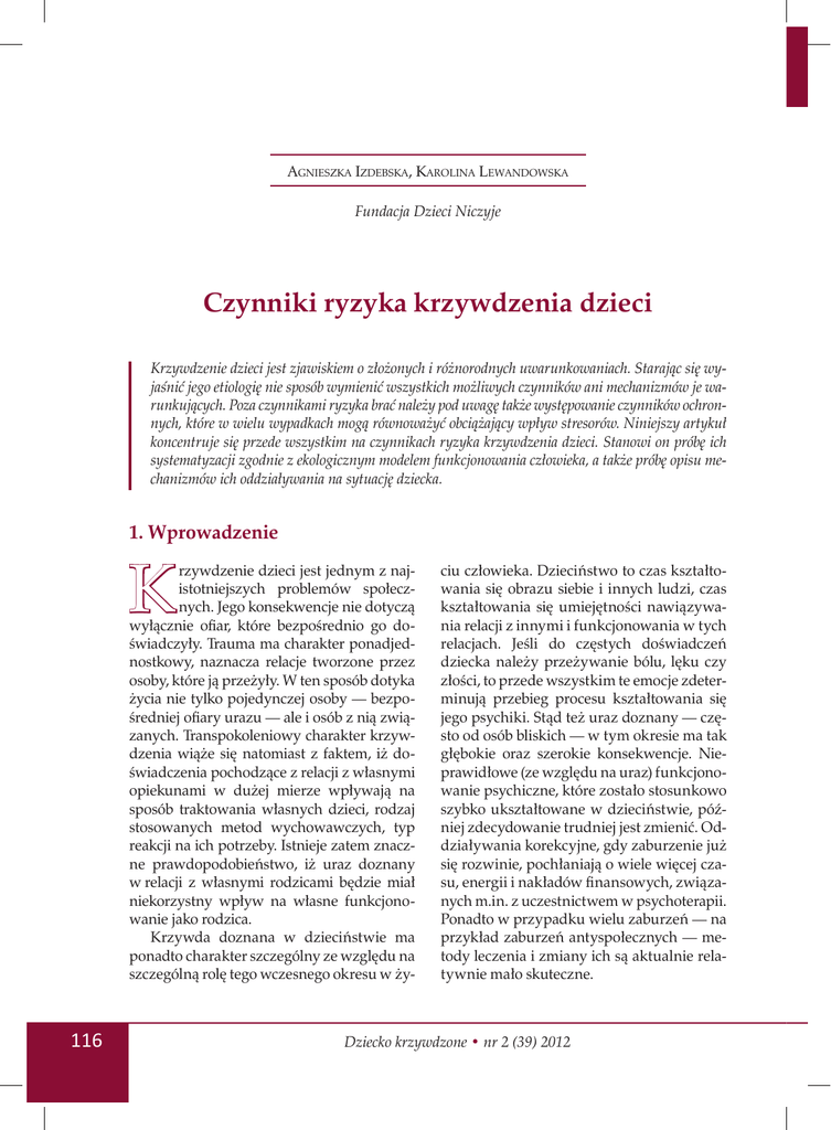 AGNIESZKA IZDEBSKA, KAROLINA LEWANDOWSKA Fundacja Dzieci Niczyje Czynniki ryzyka krzywdzenia dzieci Krzywdzenie dzieci jest zjawiskiem o złożonych i różnorodnych uwarunkowaniach. Starając się wyjaśnić jego etiologię nie sposób wymienić wszystkich możliwych czynników ani mechanizmów je warunkujących. Poza czynnikami ryzyka brać należy pod uwagę także występowanie czynników ochronnych, które w wielu wypadkach mogą równoważyć obciążający wpływ stresorów. Niniejszy artykuł koncentruje się przede wszystkim na czynnikach ryzyka krzywdzenia dzieci. Stanowi on próbę ich systematyzacji zgodnie z ekologicznym modelem funkcjonowania człowieka, a także próbę opisu mechanizmów ich oddziaływania na sytuację dziecka. 1. Wprowadzenie K rzywdzenie dzieci jest jednym z najistotniejszych problemów społecznych. Jego konsekwencje nie dotyczą wyłącznie ofiar, które bezpośrednio go doświadczyły. Trauma ma charakter ponadjednostkowy, naznacza relacje tworzone przez osoby, które ją przeżyły. W ten sposób dotyka życia nie tylko pojedynczej osoby — bezpośredniej ofiary urazu — ale i osób z nią związanych. Transpokoleniowy charakter krzywdzenia wiąże się natomiast z faktem, iż doświadczenia pochodzące z relacji z własnymi opiekunami w dużej mierze wpływają na sposób traktowania własnych dzieci, rodzaj stosowanych metod wychowawczych, typ reakcji na ich potrzeby. Istnieje zatem znaczne prawdopodobieństwo, iż uraz doznany w relacji z własnymi rodzicami będzie miał niekorzystny wpływ na własne funkcjonowanie jako rodzica. Krzywda doznana w dzieciństwie ma ponadto charakter szczególny ze względu na szczególną rolę tego wczesnego okresu w ży- 116 ciu człowieka. Dzieciństwo to czas kształtowania się obrazu siebie i innych ludzi, czas kształtowania się umiejętności nawiązywania relacji z innymi i funkcjonowania w tych relacjach. Jeśli do częstych doświadczeń dziecka należy przeżywanie bólu, lęku czy złości, to przede wszystkim te emocje zdeterminują przebieg procesu kształtowania się jego psychiki. Stąd też uraz doznany — często od osób bliskich — w tym okresie ma tak głębokie oraz szerokie konsekwencje. Nieprawidłowe (ze względu na uraz) funkcjonowanie psychiczne, które zostało stosunkowo szybko ukształtowane w dzieciństwie, później zdecydowanie trudniej jest zmienić. Oddziaływania korekcyjne, gdy zaburzenie już się rozwinie, pochłaniają o wiele więcej czasu, energii i nakładów finansowych, związanych m.in. z uczestnictwem w psychoterapii. Ponadto w przypadku wielu zaburzeń — na przykład zaburzeń antyspołecznych — metody leczenia i zmiany ich są aktualnie relatywnie mało skuteczne. Dziecko krzywdzone • nr 2 (39) 2012 AGNIESZKA IZDEBSKA, KAROLINA LEWANDOWSKA • CZYNNIKI RYZYKA KRZYWDZENIA DZIECI Pomoc osobom, które doświadczyły krzywdzenia — zarówno tym młodym, jak i dorosłym — jest bez wątpienia konieczna i ważna. Niemniej jednak istotne jest skupienie się na zapobieganiu problemowi, podejmowaniu działań interwencyjnych zanim jeszcze do krzywdzenia dziecka dojdzie. Na wartość takich działań wskazują zarówno dotyczące zjawiska analizy teoretyczne, jak i doświadczenia z istniejącej już w tym zakresie praktyki. Pozytywne skutki takich inicjatyw nie dotyczą jedynie sytuacji dziecka, ale również jego rodziny, a także całego społeczeństwa (por. Hosking, Walsh 2001). Należą do nich: • zmniejszenie przypadków urazów fizycznych i psychicznych dzieci, a w konsekwencji tego polepszenie ich fizycznego i psychicznego funkcjonowania zarówno w okresie dzieciństwa, jak i dorosłości; • zwiększenie odporności fizycznej i psychicznej dzieci — dzieci, które otrzymują odpowiednią opiekę, nie doświadczają w początkowych okresach swego życia nadmiernego stanu stresu są zarówno zdrowsze fizycznie, jak i budują zasoby psychiczne pomagające im radzić sobie z przyszłymi wyzwaniami, a nawet ewentualnymi urazami; • zapobieganie rozwojowi predyspozycji do przejawiania zaburzeń antyspołecznych i podejmowania aktów przemocy — wyniki badań wskazują, iż predyspozycje do podejmowania działań o charakterze przemocy, a także rozwijania się zaburzeń o charakterze antyspołecznym kształtują się do 3. roku życia w wyniku niewłaściwego traktowania dzieci przez rodziców; • redukcja kosztów, które ponosi społeczeństwo — w związku z działaniem takich instytucji, jak instytucje pomocy medycznej, społecznej, a także wymiaru sprawiedliwości — tj. obniżenie kosztów pomocy medycznej dla ofiar, terapii ofiar i sprawców, pomocy społecznej i psycho- logicznej, a także opieki publicznej. Skuteczna profilaktyka obniża także koszty związane z kosztami pracy organów ścigania i koszty sądowe. Aby działania profilaktyczne były jak najbardziej skuteczne, powinny być realizowane z uwzględnieniem trzech poziomów oddziaływania: 1) profilaktyki pierwszorzędowej — obejmującej wszystkie rodziny z dziećmi, np. kampanie społeczne; 2) profilaktyki drugorzędowej — adresowanej do tych rodzin, w których występują czynniki ryzyka krzywdzenia dziecka, ale w których nie doszło jeszcze do przemocy wobec dziecka, np. różne formy wsparcia psychospołecznego (warsztaty, konsultacje, monitorowanie funkcjonowania takich rodzin); 3) profilaktyki trzeciorzędowej — skierowanej do tych rodzin, w których doszło do krzywdzenia dziecka, a celem podejmowanych działań jest łagodzenie jego skutków i zapobieganie powtórzeniu przemocy w przyszłości. Są to oddziaływania interwencyjne, terapeutyczne, rehabilitacyjne. Zarówno wyodrębnianie rodzin, w których występują czynniki ryzyka krzywdzenia dzieci, jak i kierowanie wobec nich wspierających oddziaływań, należy do zakresu działań profilaktyki drugorzędowej, tj. działań kierowanych do rodzin należących do tzw. grup ryzyka. Programy przygotowane w ramach