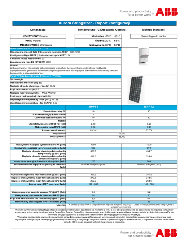 Aurora Stringsizer - Raport konfiguracji Temperatura (°C)Otoczenia Ogniwa Lokalizacja KONTYNENT Europa Minimalna -25°C -25°C Średnia 20°C 55°C Maksymalna 30°C 65°C KRAJ Polska MIEJSCOWOŚĆ Warszawa Metoda instalacji Równolegle do dachu Model inwertera PVI-4,2-TL-OUTD -S Odnotowana moc AC [W]/ Odnotowane napięcie AC [V] 4200 / 230 Konfiguracja Mppt MPPT (Liczba niezależnych MPPT.: 2) Całkowita liczba modułów PV 20 Zainstalowana moc DC (STC) [W] 5000 Notatki Wybrany inwerter nie posiada zabezpieczenia łańcuchów bezpiecznikami. Jeśli istnieje możliwość zaprojektowania generatora fotowoltaicznego w grupie trzech lub więcej niż trzech łańcuchów należy zawrzeć bezpieczniki o odpowiedniej mocy. Panel PV (producent / model) Viteco / E-PV 250W Technologia Odnotowana moc STC [W] 250 Napięcie obwodu otwartego - Voc [V] 37,72 Prąd zwarciowy - Isc [A] 8,81 Napięcie mocy maksymalnej - Vmp [V] 30,2 Prąd mocy maksymalnej - Imp [A] 8,28 Współczynnik temperatury - Voc [V/°C] -0,123 Współczynnik temperatury - Isc [mA/°C] 3,52 MPPT1 MPPT2 10 Panele / łańcuchy PV 10 Liczba równoległych łańcuchów 1 1 Całkowita liczba modułów PV 10 10 Notatki Zainstalowana moc DC (STC) [kW] Maksymalna moc/MPPT [kW] PPV(INST),MPPTi/PMPPTMAX 1 1 2,50 2,50 3,00 3,00 83,3% 83,3% PPV(inst)/PACR 119,0% PPV(inst)/PACMAX 108,7% Maksymalne napięcie systemu baterii PV [Vdc] 1000 Maksymalne napięcie inwertera na wejściu [Vdc] 600 600 Napięcie obwodu otwartego łańcucha dla temperatury @-25°C [Vdc] Napięcie obwodu otwartego łańcucha dla temperatury @65°C [Vdc] Napięcie aktywacyjne inwertera (domyślne) [Vdc] 438,7 438,7 328,0 328,0 200 200 Rekomendowane napięcie aktywacyjne inwertera [Vdc] Wartość domyślna (200) Wartość domyślna (200) Napięcie maksymalnej mocy łańcucha @-25°C [Vdc] 351,2 351,2 Napięcie maksymalnej mocy łańcucha @55°C [Vdc] 272,5 272,5 Napięcie maksymalnej mocy łańcucha @65°C [Vdc] 262,6 262,6 140 - 580 140 - 580 Maksymalny prąd zwarcia szeregu PV @65°C [Adc] 9,0 9,0 Maksymalny prąd zwarcia inwertera/MPPT [Adc] 20 20 Prąd MPP łańcucha PV dla temperatury @65°C [Adc] 8,4 8,4 16 16 Zakres pracy MPP inwertera* [Vdc] Maksymalny prąd wejścia MPPT inwertera [Adc] Legenda 1000 *) Zakres operacji MPPT z uwzględnieniem napięcia domyślnej aktywacji; 1) Liczba równoległych łańcuchów kompatybilna z połączeniami inwertera. Warunki użytkowania: Korzystając z tego narzędzia projektowego, zgadzacie się Państwo z tym, iż jest ono przeznaczone do szacowania konfiguracji łańcuchów wyłącznie z wykorzystaniem inwerterów PowerOne Aurora. PowerOne nie gwarantuje jego dokładności w przewidywaniu rzeczywistej wydajności systemu PV lub inwertera ani jego zgodności z przepisami i standardami obowiązującymi w miejscu inwestycji. Wszystkie konfiguracje powinny być powtórnie sprawdzone przez wykwalifikowanego inżyniera pod kątem ich zgodności z parametrami pracy inwertera oraz regulacjami elektrycznymi obowiązującymi w miejscu instalacji, Korzystając z tego narzędzia, użytkownik wyłącza PowerOne inc, z odpowiedzialności za wszelkie szkody, które mogą powstać wskutek korzystania z narzędzia.