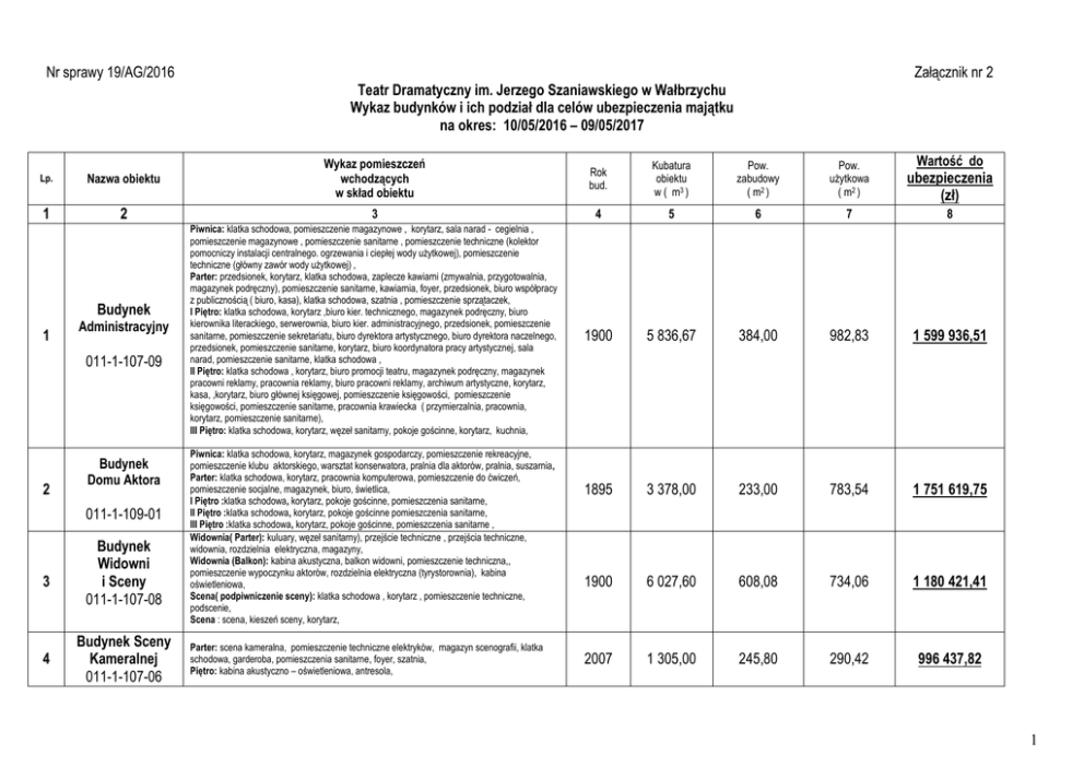 Nr sprawy 19/AG/2016 Załącznik nr 2 Teatr Dramatyczny im. Jerzego Szaniawskiego w Wałbrzychu Wykaz budynków i ich podział dla celów ubezpieczenia majątku na okres: 10/05/2016 – 09/05/2017 Lp. Nazwa obiektu 1 2 Budynek 1 Administracyjny 011-1-107-09 2 Budynek Domu Aktora 011-1-109-01 3 4 Budynek Widowni i Sceny 011-1-107-08 Budynek Sceny Kameralnej 011-1-107-06 Wartość do Wykaz pomieszczeń wchodzących w skład obiektu Rok bud. Kubatura obiektu w ( m3 ) Pow. zabudowy ( m2 ) Pow. użytkowa ( m2 ) ubezpieczenia (zł) 3 4 5 6 7 8 1900 5 836,67 384,00 982,83 1 599 936,51 1895 3 378,00 233,00 783,54 1 751 619,75 1900 6 027,60 608,08 734,06 1 180 421,41 2007 1 305,00 245,80 290,42 996 437,82 Piwnica: klatka schodowa, pomieszczenie magazynowe , korytarz, sala narad - cegielnia , pomieszczenie magazynowe , pomieszczenie sanitarne , pomieszczenie techniczne (kolektor pomocniczy instalacji centralnego. ogrzewania i ciepłej wody użytkowej), pomieszczenie techniczne (główny zawór wody użytkowej) , Parter: przedsionek, korytarz, klatka schodowa, zaplecze kawiarni (zmywalnia, przygotowalnia, magazynek podręczny), pomieszczenie sanitarne, kawiarnia, foyer, przedsionek, biuro współpracy z publicznością ( biuro, kasa), klatka schodowa, szatnia , pomieszczenie sprzątaczek, I Piętro: klatka schodowa, korytarz ,biuro kier. technicznego, magazynek podręczny, biuro kierownika literackiego, serwerownia, biuro kier. administracyjnego, przedsionek, pomieszczenie sanitarne, pomieszczenie sekretariatu, biuro dyrektora artystycznego, biuro dyrektora naczelnego, przedsionek, pomieszczenie sanitarne, korytarz, biuro koordynatora pracy artystycznej, sala narad, pomieszczenie sanitarne, klatka schodowa , II Piętro: klatka schodowa , korytarz, biuro promocji teatru, magazynek podręczny, magazynek pracowni reklamy, pracownia reklamy, biuro pracowni reklamy, archiwum artystyczne, korytarz, kasa, ,korytarz, biuro głównej księgowej, pomieszczenie księgowości, pomieszczenie księgowości, pomieszczenie sanitarne, pracownia krawiecka ( przymierzalnia, pracownia, korytarz, pomieszczenie sanitarne), III Piętro: klatka schodowa, korytarz, węzeł sanitarny, pokoje gościnne, korytarz, kuchnia, Piwnica: klatka schodowa, korytarz, magazynek gospodarczy, pomieszczenie rekreacyjne, pomieszczenie klubu aktorskiego, warsztat konserwatora, pralnia dla aktorów, pralnia, suszarnia, Parter: klatka schodowa, korytarz, pracownia komputerowa, pomieszczenie do ćwiczeń, pomieszczenie socjalne, magazynek, biuro, świetlica, I Piętro :klatka schodowa, korytarz, pokoje gościnne, pomieszczenia sanitarne, II Piętro :klatka schodowa, korytarz, pokoje gościnne pomieszczenia sanitarne, III Piętro :klatka schodowa, korytarz, pokoje gościnne, pomieszczenia sanitarne , Widownia( Parter): kuluary, węzeł sanitarny), przejście techniczne , przejścia techniczne, widownia, rozdzielnia elektryczna, magazyny, Widownia (Balkon): kabina akustyczna, balkon widowni, pomieszczenie techniczna,, pomieszczenie wypoczynku aktorów, rozdzielnia elektryczna (tyrystorownia), kabina oświetleniowa, Scena( podpiwniczenie sceny): klatka schodowa , korytarz , pomieszczenie techniczne, podscenie, Scena : scena, kieszeń sceny, korytarz, Parter: scena kameralna, pomieszczenie techniczne elektryków, magazyn scenografii, klatka schodowa, garderoba, pomieszczenia sanitarne, foyer, szatnia, Piętro: kabina akustyczno – oświetleniowa, antresola, 1 5 6 7 8 9 10 Budynek Magazynowy i Kotłowni Gazowej 011-1-101-03 Budynek Stolarni i Magazynu Kostiumów 011-1-101-02 Budynek Wiaty Magazynowej 011-1-101-01 Budynek Garażu 011-1-101-05 Budynek Zaplecza Scenicznego i Garderób 011-1-107-07 Budynek Portierni 011-1-101-04 Magazyn techniczny, kotłownia gazowa teatru, pomieszczenia magazynowe, magazyn mebli scenograficznych i rekwizytów, magazyn tarcicy 1930 3 705,80 329,04 235,94 355 814,40 Malarnia, pracownia tapicerska, pomieszczenie techniczne, pomieszczenia socjalne, archiwum zakładowe, biblioteka, magazyn kostiumów, biuro magazynu, pomieszczenie stolarni, pomieszczenie kierownika stolarni, magazyn obuwia, magazyn rekwizytów 1960 2 276,30 371,70 405,23 1 028 790,76 Pomieszczenia magazynowe 1976 1 408,65 256,12 251,15 403 267,21 Pomieszczenie magazynowe 1976 68,13 26,20 18,44 34 624,39 Parter: klatka schodowa, korytarz, pomieszczenie socjalne, pokój inspicjencki, magazynek podręczny maszynistów sceny, pomieszczenie rekwizytora, magazyny dekoracji , garderoby, magazynek elektryków, szatnia, Piętro: klatka schodowa, korytarz, magazynek akustyków, klatka schodowa , pomieszczenie sanitarne, magazyn podręczny garderobianej, garderoby, prasowalnia, charakteryzatornia, 1900 3 327,78 523,60 600,18 849 984,94 1911 151,69 43,32 33,93 13 599,54 3 020,86 4 335,72 8 214 496,73 Pomieszczenie gospodarcze, służbówka, pomieszczenie socjalne, pomieszczenie sanitarne OBIEKTY RAZEM BUDOWLE MASZYNY I URZĄDZENIA MAGAZYN KOSTIUMÓW I REKWIZYTÓW WYPOSAŻENIE SPRZĘT AKUSTYCZNO-OŚWIETLENIOWY KOMPUTERY GOTÓWKA MIENIE PRACOWNIKÓW OGÓŁEM 27 485,62 1 173 851,44 1 389 685,22 60 000,00 130 279,33 2 156 958,48 392 286,55 2 000,00 2 000,00 13 521 557,75 2 Nr sprawy:19/AG/2016 Załącznik nr 2.1 Teatr Dramatyczny im. Jerzego Szaniawskiego w Wałbrzychu Wykaz budowli dla celów ubezpieczenia majątku na okres: 10/05/2016 – 09/05/2017 L.p. 1 2 3 4 5 6 Nr inwentarzowy / Nazwa budowli 011-2-220-01 Plac z kostki betonowej 011-2-220-02 Dziedziniec wewnętrzny 011-2-220-03 Plac przed budynkiem „Domu Aktora” 011-2-220-04 Droga ewakuacyjna 011-2-220-05 Ogródek teatralny 011-2-291-01 Ogrodzenie teatru RAZEM Rok budowy 2015 2015 2015 2015 2015 2015 Wartość księgowa 221 273,78 241 984,60 150 413,22 180 252,25 231 498,56 148 429,03 1 173 851,44 Uwagi 3