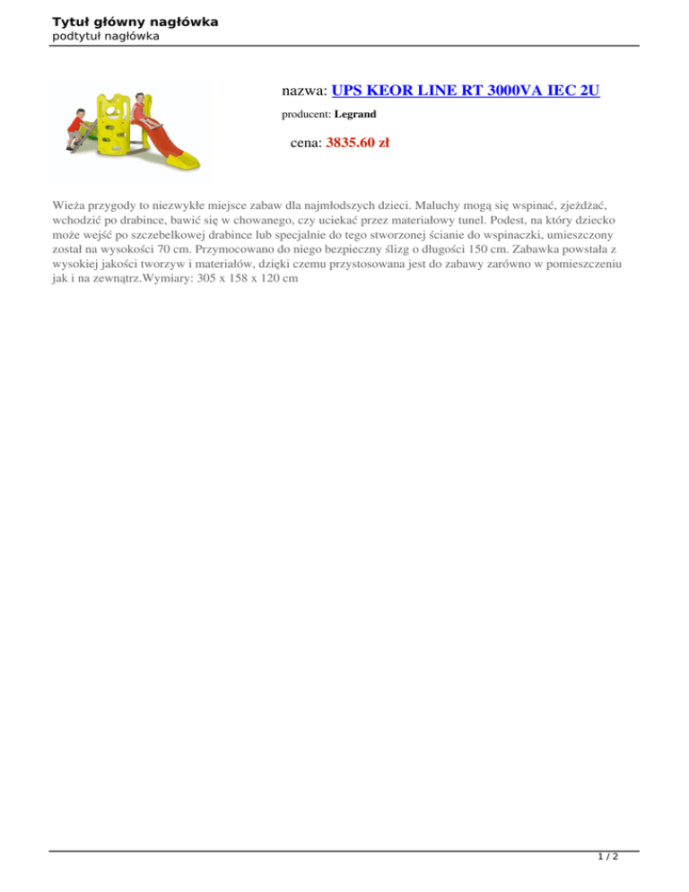 Tytuł główny nagłówka podtytuł nagłówka nazwa: UPS KEOR LINE RT 3000VA IEC 2U producent: Legrand cena: 3835.60 zł Wieża przygody to niezwykłe miejsce zabaw dla najmłodszych dzieci. Maluchy mogą się wspinać, zjeżdżać, wchodzić po drabince, bawić się w chowanego, czy uciekać przez materiałowy tunel. Podest, na który dziecko może wejść po szczebelkowej drabince lub specjalnie do tego stworzonej ścianie do wspinaczki, umieszczony został na wysokości 70 cm. Przymocowano do niego bezpieczny ślizg o długości 150 cm. Zabawka powstała z wysokiej jakości tworzyw i materiałów, dzięki czemu przystosowana jest do zabawy zarówno w pomieszczeniu jak i na zewnątrz.Wymiary: 305 x 158 x 120 cm 1/2 Tytuł główny nagłówka podtytuł nagłówka Kod Producenta nazwa 310048 wartość 2/2