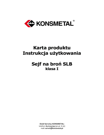 Karta produktu Instrukcja użytkowania Sejf na broń SLB klasa I Dział Serwisu KONSMETAL: telefon: 89 6253799 (pn-pt 8-16) mail: [email protected] Sejfy na broń SLB, klasa I Spis treści Zastosowanie ................................................................................................... 3 Certyfikaty do przechowywania ......................................................................... 3 Ważne – przeczytaj przed rozpoczęciem użytkowania sejfu ................................. 4 Opis produktu .................................................................................................. 4 Wyposażenie podstawowe ................................................................................ 4 Wyposażenie dodatkowe................................................................................... 5 Rodzaje zamków .............................................................................................. 5 Standardowe kolory .......................................................................................... 5 Dane techniczne: ............................................................................................. 5 Montaż do podłoża ........................................................................................... 6 Obsługa sejfu – otwieranie ............................................................................... 7 Obsługa sejfu – zamykanie ............................................................................... 8 Montaż półek ................................................................................................... 8 Wymiana baterii w zamku elektronicznym .......................................................... 9 Eksploatacja................................................................................................... 10 Konserwacja .................................................................................................. 10 Regulacja zawiasów........................................................................................ 11 Najczęściej występujące problemy i sposoby ich usunięcia ................................ 12 Dane kontaktowe Serwisu KONSMETAL ........................................................... 12 str. 2 Sejfy na broń SLB, klasa I Zdjęcie ma charakter poglądowy. Produkt może różnić się od przedstawionego na fotografii. Zastosowanie Sejfy SLB służą do przechowywania każdego rodzaj broni palnej. Przeznaczone są do użytku zarówno wolnostojącego, jak i do montażu w meblach oraz do zabudowy we wnękach meblowych. Wielopłaszczowa konstrukcja drzwi i korpusu, wykonana z solidnej stali zapewnia wysoką odporność na sforsowanie. Certyfikaty do przechowywania Wartości pod nadzorem zgodnie z normą europejską PN-EN 1143-1:2012, klasa I; Broni palnej i amunicji zgodnie z wymogami Rozporządzenia MSWiA z dnia 26 sierpnia 2014 r. w sprawie przechowywania, noszenia oraz ewidencjonowania broni i amunicji Po zamontowaniu zamka kl. C spełnia wymagania ROZPORZĄDZENIA MSWiA w sprawie zasad uzbrojenia specjalistycznych uzbrojonych formacji ochronnych i warunków przechowywania oraz ewidencjonowania broni i amunicji. UWAGA! Aby zachować klasę odporności zgodnie z certyfikatem sejf czy szafa o wadze do 1000kg musi być zakotwiony do podłoża zgodnie z instrukcją. str. 3 Sejfy na broń SLB, klasa I Ważne – przeczytaj przed rozpoczęciem użytkowania sejfu Proszę uważnie zapoznać się z niniejszą instrukcją i stosować się do jej zapisów. Jeśli urządzenie wyposażone jest w zamek szyfrowy i/lub elektroniczny ZAWSZE pamiętaj o zmianie szyfru fabrycznego na własny, nieznany osobom postronnym, PRZED rozpoczęciem użytkowania urządzenia. Pozostawienie szyfru fabrycznego stanowi zagrożenie dla bezpieczeństwa zdeponowanych w nim wartości. Zmiana szyfru oraz test nowego szyfru w zamku szyfrowym lub elektronicznym MUSI być wykonywana na otwartych drzwiach sejfu. Zmieniając szyfr na zamkniętych drzwiach narażasz się na konieczność ich awaryjnego serwisowego otwarcia. Jeśli sejf jest wyposażony w klamkę lub pokrętło do poruszania rygli otwarcie lub domknięcie drzwi należy wykonywać WYŁĄCZNIE trzymając za klamkę lub pokrętło do poruszania rygli. Otwieranie czy zamykanie drzwi sejfu poprzez ciągnięcie za klucz, pokrętło zamka szyfrowego czy klawiaturę zamka elektronicznego może skutkować uszkodzeniem wyrobu niepodlegającym gwarancji. Przed zamknięciem drzwi sejfu KONIECZNIE sprawdź czy rygle są maksymalnie schowane. Wysunięte rygle podczas zamykania drzwi sejfu mogą uszkodzić powłokę lakierniczą w miejscu uderzenia rygli o krawędź otworu drzwiowego. Takie uszkodzenia nie są traktowane, jako podstawa do naprawy gwarancyjnej. Na końcu niniejszej instrukcji znajdują się opisy postępowania przy najczęściej występujących problemach. Opis produktu Rozbudowana konstrukcja drzwi i korpusu, wykonana z najwyższej jakości blachy o wysokiej odporności na sforsowanie; Ruchomy system ryglujący, poziomy i pionowy; Konstrukcja rygla stałego uniemożliwiająca wyrwanie drzwi; System zawiasowania wewnętrznego, kąt otwarcia drzwi 900 ; Sejf wyposażony w klamkę, która zwiększa wygodę użytkowania; Wymiar i wyposażenie dostosowane do przechowywania 6 egzemplarzy broni długiej oraz dodatkowych akcesoriów; W wyposażeniu dwa uchwyty na wyciory oraz uchwyty na 6 szt. broni długiej, 2 półki; Silna osłona systemu ryglowego z zamontowanymi zamkami; Przystosowane do mocowania do podłoża; Gwarancja 24 miesiące. Wyposażenie podstawowe Atestowany zamek kluczowy klasy A, 2 klucze do zamka kluczowego, Kotwienie Instrukcja użytkowania wraz z kartą gwarancyjną. str. 4 Sejfy na broń SLB, klasa I Wyposażenie dodatkowe Zamiana zamka kluczowego na szyfrowy lub elektroniczny; Dodatkowy zamek kluczowy, szyfrowy lub elektroniczny; Zamiana zamka kl. A na zamek kl. C; Opóźnienie czasowe i cichy alarm zamka Comboga