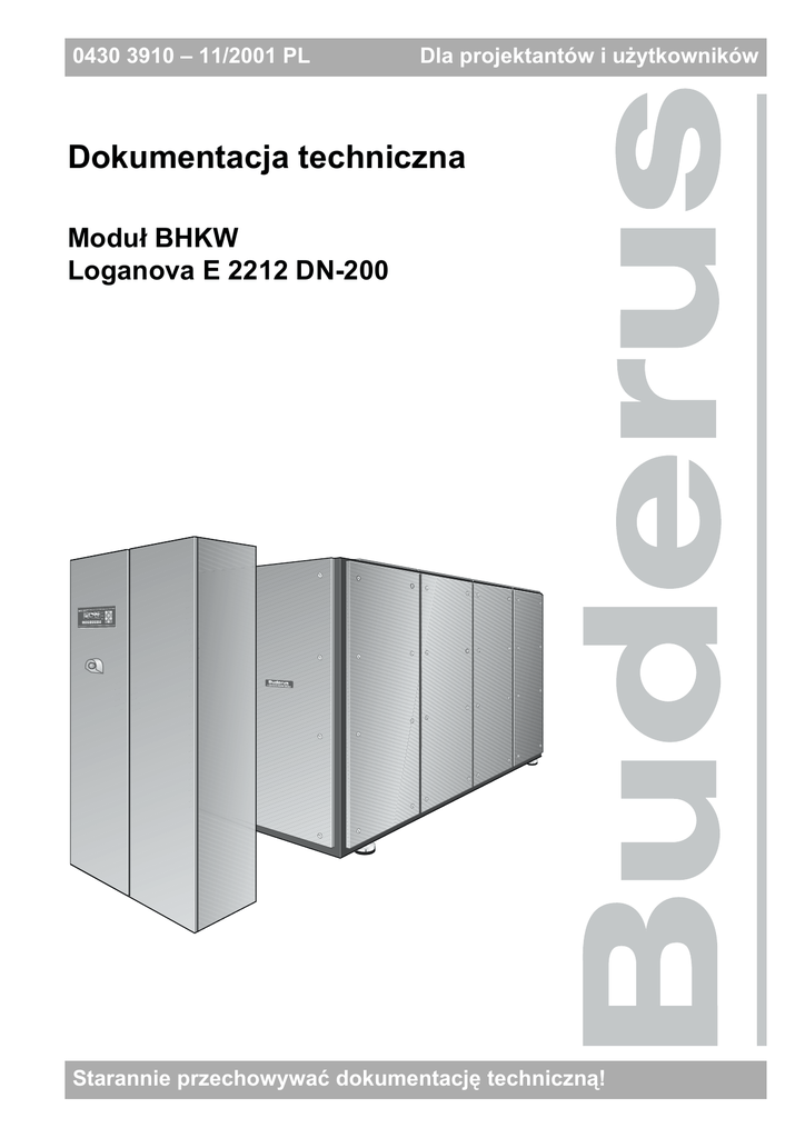 0430 3910 – 11/2001 PL Dla projektantów i użytkowników Dokumentacja techniczna Moduł BHKW Loganova E 2212 DN-200 Starannie przechowywać dokumentację techniczną! Impressum Urządzenie spełnia wymagania obowiązujących norm i dyrektyw. Zgodność z obowiązującymi normami i dyrektywami została udokumentowana. Odpowiednia dokumentacja oraz oryginał oświadczenia o zgodności z normami znajdują się u producenta. Zastrzega się możliwość wprowadzenia zmian technicznych! W związku ze stale prowadzonymi pracami rozwojowymi, rysunki, sposób działania urządzeń oraz dane techniczne mogą nieznacznie odbiegać od przedstawionych w niniejszych materiałach technicznych. Aktualizacja dokumentacji Jeżeli macie Państwo propozycje dotyczące poprawienia dokumentacji lub stwierdziliście Państwo niezgodności, prosimy o kontakt. Adres producenta Buderus Heiztechnik GmbH D-35573 Wetzlar http://www.heiztechnik.buderus.de e-mail: [email protected] Nr dokumentacji: 0430 3910 Data wydania: 11/2001 Zastrzega się możliwość wprowadzenia zmian w związku z ulepszeniami technicznymi! 2 Buderus Heiztechnik GmbH • http://www.heiztechnik.buderus.de Dokumentacja techniczna • Moduł BHKW Loganova E 2212 DN-200 • Wydanie 11/2001 Spis treści 1 Informacje ogólne . 1.1 1.2 1.3 1.4 2 2.8 2.9 2.10 2.11 3 Moc ciągła podczas pracy synchronicznej z siecią elektroenergetyczną Praca wyspowa . . . . . . . . . . . . . . . . . . . . . . . . . . . . . . . . . . . . Emisja substancji szkodliwych . . . . . . . . . . . . . . . . . . . . . . . . . . Bilans energetyczny . . . . . . . . . . . . . . . . . . . . . . . . . . . . . . . . . Opis produktu . 2.1 2.2 2.3 2.4 2.5 2.6 2.7 . . . . . . . . . . . . . . . . . . . . . . . . . . . . . . . . . . . . . . . . . . .4 . . . . . . . . .5 . . . . . . . . .5 . . . . . . . . .6 . . . . . . . . . . . . . . . . . . . . . . . . . . . . . . . . . . . . . . . . . . . . . .7 Silnik tłokowy z zapłonem iskrowym na paliwo gazowe z wyposażeniem Sprzęgło . . . . . . . . . . . . . . . . . . . . . . . . . . . . . . . . . . . . . . . . Generator synchroniczny prądu trójfazowego . . . . . . . . . . . . . . . . . Rama nośna . . . . . . . . . . . . . . . . . . . . . . . . . . . . . . . . . . . . . Połączenia rurowe . . . . . . . . . . . . . . . . . . . . . . . . . . . . . . . . . . System wymienników ciepła . . . . . . . . . . . . . . . . . . . . . . . . . . . . System katalitycznego oczyszczania spalin oraz wstępny tłumik hałasu przepływu spalin . . . . . . . . . . . . . . . . . . . . . . . . . . . . . . . . . . . System zasilania olejem smarnym . . . . . . . . . . . . . . . . . . . . . . . . Osłona dźwiękochłonna oraz odprowadzenie powietrza odlotowego . . . Urządzenia kontrolno-pomiarowe . . . . . . . . . . . . . . . . . . . . . . . . . Szafa sterownicza . . . . . . . . . . . . . . . . . . . . . . . . . . . . . . . . . . Konserwacja . . . . . . . . . .5 . . . . . . . . .7 . . . . . . . . 10 . . . . . . . . 10 . . . . . . . . 11 . . . . . . . . 11 . . . . . . . . 11 . . . . . . . . 12 . . . . . . . . 13 . . . . . . . . 13 . . . . . . . . 14 . . . . . . . . 15 . . . . . . . . . . . . . . . . . . . . . . . . . . . . . . . . . . . . . . . . . . . . . . 17 3.1 Plan przeglądów konserwacyjnych . . . . . . . . . . . . . . . . . . . . . . . . . . . . . . . . 18 4 Dane techniczne 4.1 4.2 4.3 4.4 4.5 4.6 4.7 4.8 4.9 4.10 5 . . . . . . . . . . . . . . . . . . . . . . . . . . . . . . . . . . . . . . . . . . . . 20 Paliwa oraz pojemności napełniania . . . . . . . . . . . . . . . . . . . . . Wytwarzanie energii cieplnej . . . . . . . . . . . . . . . . . . . . . . . . . . Silnik tłokowy z zapłonem iskrowym na paliwo gazowe . . . . . . . . . Generator synchroniczny prądu trójfazowego . . . . . . . . . . . . . . . Powietrze dostarczane do procesu spalania, wentylacja oraz spaliny Wymienniki ciepła . . . . . . . . . . . . . . . . . . . . . . . . . . . . . . . . Poziom emisji dźwięków . . . . . . . . . . . . . . . . . . . . . . . . . . . . Przyłącza oraz połączenia kablowe. . . . . . . . . . . . . . . . . . . . . . Wymiary, waga urządzeń oraz zastosowane kolory. . . . . . . . . . . . Wymagania dotyczące sposobu zainstalowania modułu . . . . . . . . Załącznik . . . . . . . . . . . 20 . . . . . . . . . . 20 . . . . . . . . . . 21 . . . . . . . . . . 21 . . . . . . . . . . 22 . . . . . . . . . . 23 . . . . . . . . . . 23 . . . . . . . . . . 24 . . . . . . . . . . 25 . . . . . . . . . . 26 . . . . . . . . . . . . . . . . . . . . . . . . . . . . . . . . . . . . . . . . . . . . . . . . . 28 5.1 Opcje (wyposażenie i usługi opcjonalne) . . . . . . . . . . . . . . . . . . . . . . . . . . . . 28 5.2 Możliwość skorzystania ze zwolnień z podatku ekologicznego (w Niemczech) . . . . . 29 5.3 Zestawienie urządzeń . . . . . . . . . . . . . . . . . . . . . . . . . . . . . . . . . . . . . . . . 30 6 Indeks 7 Deklaracja zgodności . . . . . . . . . . . . . . . . . . . . . . . . . . . . . . . . . . . . . . . . . . . . . . . . . . . . 33 . . . . . . . . . . . . . . . . . . . . . . . . . . . . . . . . . . . . . . . . 35 Zastrzega się możliwość wprowadzenia zmian w związku z ulepszeniami technicznymi! Buderus Heiztechnik GmbH • http://www.heiztechnik.buderus.de Dokumentacja techniczna • Moduł BHKW Loganova E 2212 DN-200 • Wydanie 11/2001 3 1 1 Informacje ogólne Informacje ogólne Moduł elektrociepłowni blokowej (moduł BHKW) "Loganova E 2212 DN-200" jest kompletną, gotową do zastosowania na obiekcie jednostką energetyczną z generatorem synchronicznym chłodzonym powietrzem, przeznaczoną do skojarzonego wytwarzania energii elektrycznej oraz ciepła: trójfazowego prądu elektrycznego (400 V, 50 Hz) oraz ciepłej wody na potrzeby grzewcze, w warunkach maksymalnego poziomu temperatur na zasilaniu/powrocie instalacji grzewczej, wynoszącego 90/70 °C, przy standardowym spadku temperatury obiegowej wody grzewczej 20 K. Każdy moduł BHKW może pr