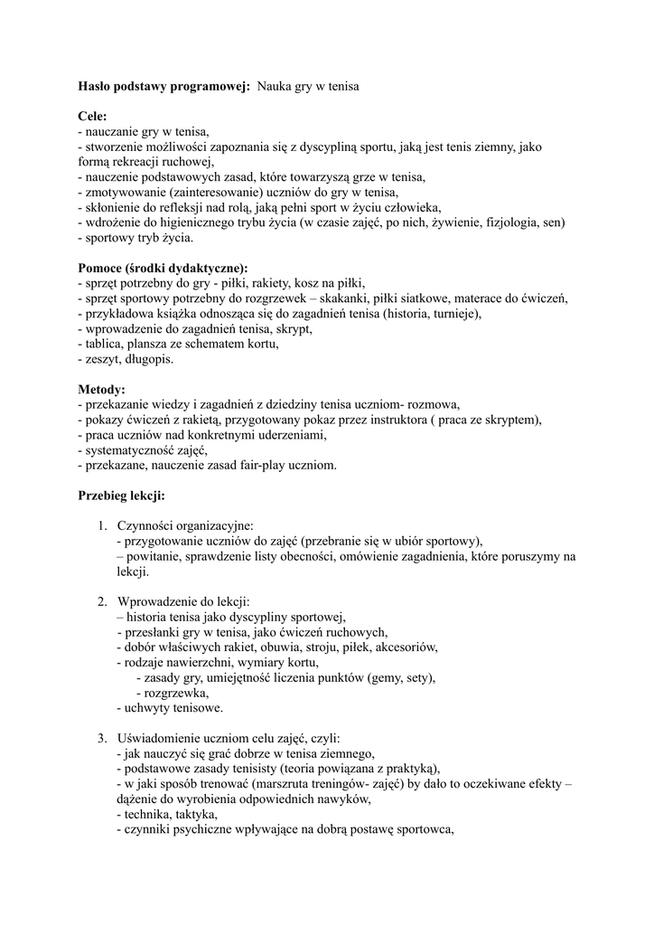 Hasło podstawy programowej: Nauka gry w tenisa Cele: - nauczanie gry w tenisa, - stworzenie możliwości zapoznania się z dyscypliną sportu, jaką jest tenis ziemny, jako formą rekreacji ruchowej, - nauczenie podstawowych zasad, które towarzyszą grze w tenisa, - zmotywowanie (zainteresowanie) uczniów do gry w tenisa, - skłonienie do refleksji nad rolą, jaką pełni sport w życiu człowieka, - wdrożenie do higienicznego trybu życia (w czasie zajęć, po nich, żywienie, fizjologia, sen) - sportowy tryb życia. Pomoce (środki dydaktyczne): - sprzęt potrzebny do gry - piłki, rakiety, kosz na piłki, - sprzęt sportowy potrzebny do rozgrzewek – skakanki, piłki siatkowe, materace do ćwiczeń, - przykładowa książka odnosząca się do zagadnień tenisa (historia, turnieje), - wprowadzenie do zagadnień tenisa, skrypt, - tablica, plansza ze schematem kortu, - zeszyt, długopis. Metody: - przekazanie wiedzy i zagadnień z dziedziny tenisa uczniom- rozmowa, - pokazy ćwiczeń z rakietą, przygotowany pokaz przez instruktora ( praca ze skryptem), - praca uczniów nad konkretnymi uderzeniami, - systematyczność zajęć, - przekazane, nauczenie zasad fair-play uczniom. Przebieg lekcji: 1. Czynności organizacyjne: - przygotowanie uczniów do zajęć (przebranie się w ubiór sportowy), – powitanie, sprawdzenie listy obecności, omówienie zagadnienia, które poruszymy na lekcji. 2. Wprowadzenie do lekcji: – historia tenisa jako dyscypliny sportowej, - przesłanki gry w tenisa, jako ćwiczeń ruchowych, - dobór właściwych rakiet, obuwia, stroju, piłek, akcesoriów, - rodzaje nawierzchni, wymiary kortu, - zasady gry, umiejętność liczenia punktów (gemy, sety), - rozgrzewka, - uchwyty tenisowe. 3. Uświadomienie uczniom celu zajęć, czyli: - jak nauczyć się grać dobrze w tenisa ziemnego, - podstawowe zasady tenisisty (teoria powiązana z praktyką), - w jaki sposób trenować (marszruta treningów- zajęć) by dało to oczekiwane efekty – dążenie do wyrobienia odpowiednich nawyków, - technika, taktyka, - czynniki psychiczne wpływające na dobrą postawę sportowca, - cechy fizyczne, które partie mięśni mają największe znaczenie przy grze w tenisa. 4. Zapoznanie się z materiałem ćwiczeniowym, określonymi umiejętnościami ruchowymi (rozgrzewka, ćwiczenia złożone): - bieg naokoło kortu, przysiady, wymachy, skłony, - zabawy w grupach jako forma rozgrzewki, - zabawy z piłką (rzucanie, odbijanie, podrzucanie itp.), - podstawy tenisa- uchwyty rakiety, praca nóg, - uderzenia i jego fazy, - forhend, bekhend, serwis, smecz, wolej, skrót, lob, - techniki uderzeń, rotacja piłki, - siła, prędkość, wytrzymałość na korcie, - treningi wytrzymałościowe (kondycyjne), - testy sprawnościowe. 5. Pokazanie i utrwalanie poprawności wykonania ćwiczenia: - wprowadzenie innych akcesoriów systematyczność celu świadomego przesłania treści ćwiczenia, - systematyczność wykonywanych ćwiczeń przez uczniów 6. Wiązanie teorii z praktyką (ćwiczenia pod okiem instruktora- uczniowie wykonują samodzielnie): - omówienie pozycji i sposobu ustawienia na korcie, - pokazanie uderzenia, postawy, - powtarzanie poznanego ćwiczenia, - doskonalenie wykonywanego ćwiczenia, - wybór ucznia najlepiej wykonującego ćwiczenie (jako przykład dla reszty grupy), - sprawdzian poprawności wykonania ćwiczenia. Podsumowanie 1. Jawna ocena uczniów: - plusy i minusy dla uczestniczących w zajęciach (za aktywność bądź bierną postawę w lekcji), - wskazówki i rady instruktora, - założenie – osiągnięcia dotyczące lekcji, - odpowiedzi na pytania. 2. Zadania domowe mające na celu zainteresowanie jak również utrwalenie zdobytych na lekcji wiadomości i pozyskanych umiejętności. 3. Określenie tematyki kolejnej lekcji.