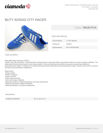 Halina Paszkaniak "ViaModa"odzież, obuwie Ul. Krótka 1, brzozów 604 645 233 BUTY ADIDAS CITY RACER Cena: 199,00 PLN Opis słownikowy Czas dostawy 1-2 dni robocze Producent ADIDAS Zastosowanie BUTY SPORTOWE Opis produktu Buty adidas Neo City Racer F97872 .Model z serii Neo City Racer. Cholewka butów wykonana jest z nylonowej siatki a wewnętrzna osłona to zamsz w kolorze niebieski,. Trzy białe paski dobrze komponują się z całą resztą projektu. Gumowa podeszwa jest bardzo przyczepna i gwarantuje stabilność, jednocześnie jest lekka a w połączeniu z całą konstrukcją obuwia doskonale amortyzacje podczas biegu. Noszenie tych butów na pewno zachęci Cię do rywalizacji z najlepszymi. Właściwości: -Marka: Adidas -Model: City Racer -Indeks: F97876 -Fason: Buty sportowe -Kolor dominujący: Niebieski -Materiał zewnętrzny: Materiał tekstylny, tworzywo syntetyczne -Materiał wewnętrzny: Materiał tekstylny -Materiał podeszwy: Tworzywo syntetyczne Parametry WYBIERZ ROZMIAR Plik wygenerowano: 02-03-2017 43 1/3, 44, 45 1/3 Oprogramowanie sklepu: AptusShop Halina Paszkaniak "ViaModa"odzież, obuwie Ul. Krótka 1, brzozów 604 645 233 Galeria Plik wygenerowano: 02-03-2017 Powered by TCPDF (www.tcpdf.org) Oprogramowanie sklepu: AptusShop