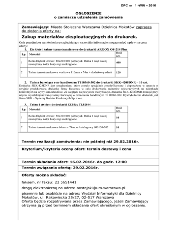 DPC nr 1 -WIN – 2016 OGŁOSZENIE o zamiarze udzielenia zamówienia Zamawiający: Miasto Stołeczne Warszawa Dzielnica Mokotów zaprasza do złożenia oferty na: Zakup materiałów eksploatacyjnych do drukarek. Opis przedmiotu zamówienia uwzględniający wszystkie informacje mogące mieć wpływ na ceną oferty: 1. Etykiety i taśmy termotransferowe do drukarki ARGOX OS-214 Plus Lp. Materiał Ilość szt. 1 Rolka Etykiet termotr. 80x20/1000 półpołysk. Rolka 1 rząd nawój zewnętrzny kolor biały rogi zaokrąglone. 400 2 Taśma termotransferowa woskowa 110mm x 74m + dodatkowy rdzeń 120 2. Taśma barwiąca o nr handlowym T110360-302 do drukarki SKK-4208DNR – 10 szt. Drukarka SKK-428DNR jest urządzeniem, które zostało specjalnie zmodyfikowane i doposażone w oparciu o seryjnie produkowaną drukarkę firmy Datamax w celu drukowania numerów rejestracyjnych na nalepkach kontrolnych na szyby samochodowe. Ze względu na powyższe modyfikacje, drukarka SKK-4208DNR drukuje przy użyciu wyselekcjonowanej taśmy barwiącej o oznaczeniu handlowym T110360-302. Dystrybutorem drukarek jest firma SKK – Systemy Kodów Kreskowych Sp. z o.o. 3. Taśmy i etykiety do drukarki ZEBRA TLP2844 Lp. Materiał Ilość szt. 1 Rolka Etykiet termotr. 50x30/1000 półpołysk. Rolka 1 rząd nawój zewnętrzny kolor biały rogi zaokrąglone. 10 2 Taśma termotransferowa 64mm x 74m, nr katalogowy 800130-202 10 Termin realizacji zamówienia: nie później niż 29.02.2016r. Kryterium/kryteria oceny ofert: termin dostawy i cena Termin składania ofert: 16.02.2016r. do godz. 12:00 Termin związania ofertą: 29.02.2016r. Oferty można składać: faksem, nr faksu: 22 5651441 drogą elektroniczną na adres: [email protected] pisemnie lub osobiście na adres: Wydział Informatyki dla Dzielnicy Mokotów, ul. Rakowiecka 25/27, 02-517 Warszawa Oferta będzie rozpatrywana przez Zamawiającego, jeżeli Zamawiający otrzyma ją przed terminem składania ofert określonym w ogłoszeniu. Komórka organizacyjna Urzędu Dzielnicy Mokotów m.st. Warszawy realizująca wydatek: Wydział Informatyki Osoba do kontaktu: Adam Ostojski tel: 22 5651440 Informacje dodatkowe: 1. Zamawiający będzie rozpatrywał oferty złożone zgodnie ogłoszeniem. 2. Zamawiający udzieli zamówienia wykonawcy, którego oferta zostanie wybrana jako najkorzystniejsza. 3. Niezwłocznie po rozpatrzeniu ofert, w przypadku braku decyzji o unieważnieniu postępowania, informacja o wyborze wykonawcy zostanie zamieszczona na stronie internetowej Urzędu, na której zostało zamieszczone ogłoszenie. 4. Zamawiający zastrzega sobie prawo do zmiany ogłoszenia bez podania przyczyn. 5. Zamawiający zastrzega sobie prawo odwołania ogłoszenia w każdym czasie bez podawania przyczyn. 6. W sprawie nie ujętych w ogłoszeniu mają zastosowanie przepisy kodeksu cywilnego. Załączniki 1. wzór/projekt umowy 2. wzór oferty /-/ Adam Ostojski Naczelnik Wydziału Informatyki .................................................... data, podpis i pieczątka kierownika komórki organizacyjnej realizującej wydatek