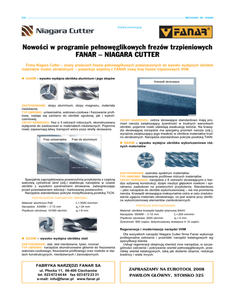 810 MECHANIK NR 10/2008 Artykuł promocyjny Nowości w programie pełnowęglikowych frezów trzpieniowych FANAR – NIAGARA CUTTER Firma Niagara Cutter – znany producent frezów pełnowęglikowych przeznaczonych do wysoko wydajnych obróbek materiałów trudno obrabialnych – prezentuje wspólną z FANAR nową linię frezów trzpieniowych VHM. A345M – wysoko wydajna obróbka aluminium i jego stopów ZASTOSOWANIE: stopy aluminium, stopy magnezu, materiały nieżelazne. TYP OBRÓBKI: uniwersalna, walcowo-czołowa i frezowanie profi- lowe, nadaje się zarówno do obróbki zgrubnej, jak i wykończeniowej. CECHY NARZĘDZIA: frez o 3 ostrzach roboczych, skonstruowany wyłącznie do zastosowań w materiałach nieżelaznych. Pojemne rowki zapewniają łatwy transport wióra poza strefę skrawania. CECHY NARZĘDZIA: ostrza skrawające standardowo mają pro- mień naroża zwiększający żywotność w trudnych warunkach obróbki; pojemne rowki ułatwiają ewakuację wiórów. Na krawędzi skrawającej narzędzie ma specjalny promień naroża (zdj.), wyraźnie zwiększający jego trwałość w obróbce materiałów trudno obrabialnych. Narzędzie standardowo pokryte powłoką TiAlN. S645M – wysoko wydajna obróbka wykończeniowa różnych materiałów Specjalnie zaprojektowana powierzchnia przyłożenia z częścią walcową cylindrical land (zdj.) stabilizuje narzędzie w czasie obróbki z wysokimi parametrami skrawania, zabezpieczając przed powstawaniem wibracji i karbowanej powierzchni. Narzędzie standardowo pokryte modyfikowaną powłoką TiCN. PRZYKŁADOWE PARAMETRY OBRÓBKI: Materiał: aluminium Pa6 Narzędzie: A345M – ∅ 12 mm Prędkość obrotowa: 10 000 obr/min fz = 3500 mm/min ap = 24 mm ae = 8 mm ZASTOSOWANIE: szerokie spektrum materiałów. TYP OBRÓBKI: frezowanie profilowe różnych materiałów. CECHY NARZĘDZIA: narzędzia z 6 ostrzami skrawającymi o bar- dzo sztywnej konstrukcji; dzięki niezbyt głębokim rowkom i spiralnemu zaskokowi na powierzchni przyłożenia. Standardowo – jako narzędzie do obróbki wykończeniowej – nie ma promienia naroża. Krawędź skrawająca maksymalnie ostra w celu zredukowania ugięcia materiału obrabianego, co jest ważne przy obróbce wykończeniowej elementów cienkościennych. PRZYKŁAD ZASTOSOWANIA: Materiał: obróbka krawędzi łopatki tytanowej 6Al4V Narzędzie: S645M – ∅ 12 mm fz = 200 mm/min ae = 4 mm Prędkość obrotowa: 2000 obr/min Żywotność: 800 części; dotychczasowy dostawca 4 ÷ 6 części. Regeneracja i modernizacja narzędzi VHM S335M – wysoko wydajna obróbka stali ZASTOSOWANIE: stal, stal nierdzewna, tytan, inconel. TYP OBRÓBKI: narzędzie skonstruowane głównie do frezowania walcowo-czołowego, frezowania profilowego oraz rowków w stalach konstrukcyjnych, nierdzewnych i żaroodpornych. Dla wszystkich narzędzi Niagara Cutter firma Fanar wykonuje profesjonalne ostrzenie i przeróbki narzędzi katalogowych wg specyfikacji klienta. Usługi regeneracji obejmują również inne narzędzia, w szczególności ostrzenie i pokrywanie wierteł pełnowęglikowych, przeróbkę wierteł katalogowych, taką jak dodanie stopnia, redukcja średnicy i wiele innych. FABRYKA NARZĘDZI FANAR SA ul. Płocka 11, 06-400 Ciechanów tel. 023 672 44 44 fax 023 672 23 31 e-mail: [email protected] www.fanar.pl ZAPRASZAMY NA EUROTOOL 2008 PAWILON GŁÓWNY, STOISKO 325