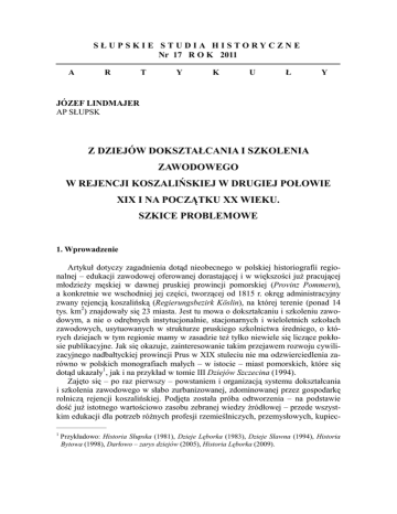 Z dziejów szkolenia SŁUPS K I E dokształcania S T U D Ii A H I Szawodowego... TORYCZNE Nr 17 R O K 2011 A R T Y K U Ł 117 Y JÓZEF LINDMAJER AP SŁUPSK Z DZIEJÓW DOKSZTAŁCANIA I SZKOLENIA ZAWODOWEGO W REJENCJI KOSZALIŃSKIEJ W DRUGIEJ POŁOWIE XIX I NA POCZĄTKU XX WIEKU. SZKICE PROBLEMOWE 1. Wprowadzenie Artykuł dotyczy zagadnienia dotąd nieobecnego w polskiej historiografii regionalnej – edukacji zawodowej oferowanej dorastającej i w większości już pracującej młodzieży męskiej w dawnej pruskiej prowincji pomorskiej (Provinz Pommern), a konkretnie we wschodniej jej części, tworzącej od 1815 r. okręg administracyjny zwany rejencją koszalińską (Regierungsbezirk Köslin), na której terenie (ponad 14 tys. km2) znajdowały się 23 miasta. Jest tu mowa o dokształcaniu i szkoleniu zawodowym, a nie o odrębnych instytucjonalnie, stacjonarnych i wieloletnich szkołach zawodowych, usytuowanych w strukturze pruskiego szkolnictwa średniego, o których dziejach w tym regionie mamy w zasadzie też tylko niewiele się liczące pokłosie publikacyjne. Jak się okazuje, zainteresowanie takim przejawem rozwoju cywilizacyjnego nadbałtyckiej prowincji Prus w XIX stuleciu nie ma odzwierciedlenia zarówno w polskich monografiach małych – w istocie – miast pomorskich, które się dotąd ukazały1, jak i na przykład w tomie III Dziejów Szczecina (1994). Zajęto się – po raz pierwszy – powstaniem i organizacją systemu dokształcania i szkolenia zawodowego w słabo zurbanizowanej, zdominowanej przez gospodarkę rolniczą rejencji koszalińskiej. Podjęta została próba odtworzenia – na podstawie dość już istotnego wartościowo zasobu zebranej wiedzy źródłowej – przede wszystkim edukacji dla potrzeb różnych profesji rzemieślniczych, przemysłowych, kupiec——————— 1 Przykładowo: Historia Słupska (1981), Dzieje Lęborka (1983), Dzieje Sławna (1994), Historia Bytowa (1998), Darłowo – zarys dziejów (2005), Historia Lęborka (2009). 118 Józef Lindmajer ko-handlowych. Przysposobienie zawodowe było prowadzone w powoływanych przez władze administracyjne i oświatowe wszystkich miast szkołach wieczorowych metodą kursów trwających najczęściej 6-7 miesięcy, rzadziej przez 12 (system dwusemestralny). Rozwój ilościowy takich placówek skróconego dokształcania zawodowego dla młodych pracujących mężczyzn po szkole elementarnej stał się w Niemczech zjawiskiem powszechnym w drugiej połowie XIX w., bowiem opartym – zwłaszcza od dekady lat osiemdziesiątych – na odpowiednich i rygorystycznych (np. dla pracodawców) przepisach ustawodawstwa Rzeszy (z lat 1883, 1891 i 1897). Wręcz śladowy stan dotychczas oferowanej wiedzy historycznej w wybranym przez nas zakresie problemowym nie pozwolił wzbogacić zawartej tu wiedzy faktograficznej o pewien rodzaj rozważań i przemyśleń analityczno-porównawczych, zamieścić opinii oraz wniosków wartościujących – chociażby na tle podobnego systemu kształcenia, szczególnie w zawodach pozarolniczych w sąsiedniej rejencji szczecińskiej. Przyjęcie takiego zakresu przedmiotowego uzasadnia pominięcie w tym artykule (nawet skrótowe) powstania i działalności w rejencji koszalińskiej wielosemestralnych szkół zawodowych finansowanych przez państwo. Dotyczy to 2-letnich seminariów nauczycielskich (tylko męskich) w Koszalinie (od 1816 r.), Bytowie (od 1859 r.) oraz w Drawsku (od 1867 r.)2, liczniejszych preparand3, a także jedynej w tym regionie państwowej średniej (3-letniej) szkoły rolniczej wraz z oddziałem przygotowawczym (2-letnią, Vorschule), istniejącej w Świdwinie od wiosny 1878 r. Proces uaktywniania nowych proliberalnych, prekapitalistycznych sił produkcyjnych w miastach monarchii pruskiej rozpoczął się wraz z wprowadzeniem reform ustrojowych i w sferze gospodarczo-społecznej na początku XIX w. Mocą ordynacji z 19 listopada 1808 r. miastom w Prusach, zrównanym prawnie4, został przywrócony jednolity ustrój samorządowy. Każdy ośrodek miejski otrzymał osobowość prawną z szerokim zakresem autonomii w sprawach wewnętrznych – jako odrębna gmina administracyjna. Pomimo likwidacji form życia stanowego i zniesienia starego korporacjonizmu miejskiego, utrzymana została nierównoprawność w czynnym i biernym dostępie do kształtowania składu wybieranych organów samorządowych – rady miejskiej i magistratu. Decydował o tym status przynależności do kategorii pełnoprawnych obywateli miasta, wynikający z posiadania uprawnienia do wykonywania tzw. zawodów miejskich, dochodu określonej wysokości i własnych nieruchomości (dom, ziemia)5. ——————— 2 Kształcono w nich nauczycieli szkół elementarnych, zwłaszcza wiejskich. 3 Od początku lat dwudziestych XIX wieku do I wojny światowej działało ich w rejencji co najmniej 11 (w różnych okresach): w Barzowicach (powiat sławieński), Bytowie, Mokrem (powiat koszaliński), Barcinie (powiat miastecki), Okonku, Czaplinku, Miastku, Białogardzie, Koszalinie, Drawsku, Szczecinku. 4 Dotąd były one podporządkowane administracji państwowej, zwłaszcza skarbowo-podatkowej (Immediatstädte), inne zaś znajdowały się pod zwierzchnością prywatną (Mediatstädte). 5 Bliżej o tym przede wszystkim: A. Wielopolski, Ustrój polityczny Pomorza Zachodniego w XIX wieku, Poznań 1965, s. 53-55; S. Salmonowicz, Podziały terytorialne i ustrój polityczny ziem pomorskich w latach 1815-1850, [w:] Historia Pomorza, red. G. Labuda, t. III, cz. I, Poznań 1993, s. 117-122. Z dziejów dokształcania i szkolenia zawodowego... 119 Po tej reformie w małych miastach rejencji koszalińskiej (nie wyłączając kilku większych – Słupska, Koszalina, Kołobrzegu) znaczną przewagę w stanowieniu i wykonywaniu nowego prawa municypalnego uzyskała warstwa mieszczańska profesji rzemieślniczych i kupieckich – zorganizowana i działająca zawodowo w branżowych cechach, cieszących się wciąż monopol