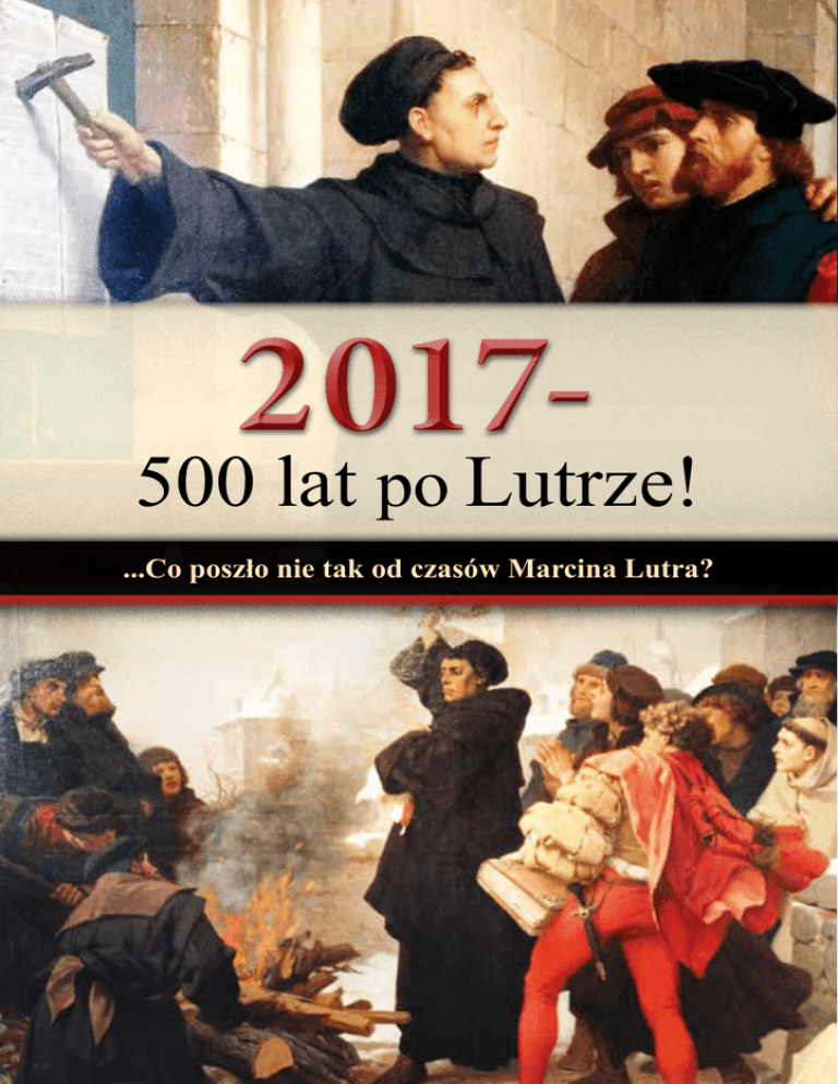 2017- 500 lat po Lutrze! ...Co poszło nie tak od czasów Marcina Lutra? 2017 - 500 lat po Lutrze! ...Co poszło nie tak od czasów Marcina Lutra? W dniu 31 października 2017 roku minie 500 lat, od kiedy Marcin Luter przybił 95 tez na drzwiach katedry w Wittenberdze. Te 95 tez ujawniło niektóre niebiblijne nauki i tradycje Kościoła Katolickiego. Ludzie byli zaskoczeni, że jeden człowiek zdecydował się na tak śmiały czyn. W tamtych czasach było to niewyobrażalnym szczytem odwagi. Jeden człowiek ośmielił się wystąpić przeciwko potężnemu systemowi władzy religijnej i politycznej! To było czymś więcej niż walka Dawida z Goliatem. Marcin Luter nie dążył do obalenia istniejącego Kościoła, lecz do jego reformy; zauważył bowiem upadek moralności wśród mnichów i kleru oraz wiele nadużyć, które w rażący sposób uchybiały imieniu i naukom Chrystusa. Oburzony tym reformator postanowił przedstawić swoją propozycję zmian społeczeństwu niemieckiemu, które jak wierzył miało prawo do poznania prawdy. Reakcja społeczeństwa przerosła najśmielsze oczekiwania niemieckiego reformatora. Ludność Wittenbergi poparła przedstawione tezy i doceniła niezwykłą odwagę Lutra. Jego tezy w bardzo krótkim czasie rozpowszechniono w całych Niemczech, a potem w innych europejskich krajach. Ludzie szybko zrozumieli, że Kościół Katolicki promował wiele niebiblijnych nauk i tradycji i dlatego poparli protest Lutra. Jedna mała iskra potrafi wywołać wielki ogień. Wynikło z tego wiele ożywionych debat, a 95 tez spowodowało, że ludzie zaczęli myśleć samodzielnie. Istniejący do tej pory system religijny wymuszał tylko jeden 2 „słuszny” punkt widzenia, lecz oto nadchodziła nowa era, era wolności religijnej. Ludzie pragnęli tej wolności, lecz potrzebowali kogoś, kto nada jej określony kształt i kierunek. Jedynym słusznym i bezpiecznym kierunkiem było podążanie za Słowem Bożym. Właśnie tego domagał się Marcin Luter. W tamtych czasach tylko kapłaństwo miało Biblię i dlatego było ono wielce poważane przez lud. To im powierzono Słowo Boże, by wykładali je wśród ludu właściwie. Wzięli kredyt społecznego zaufania i mieli obowiązek wobec Boga czynić ludzi uczniami Chrystusa. Powinni też być przykładem pokory, skromności, wstrzemięźliwości i czystości właściwych Chrystusowi. Gołym okiem było jednak widać braki w tej praktycznej pobożności. Marcin Luter przez swoje 95 tez i wygłaszane kazania, ujawnił, że kapłańskie tradycje i nauki nie były zgodne z naukami Biblii. Na skutek społecznego poparcia powstały dwa odrębne obozy - kościół katolicki kontra zwolennicy reformacji. Ponieważ Luter trzymał się swoich odkryć i nauk, w końcu został wezwany do stawienia się przed sejmem w Wormacji. Sejm pod wpływem żądań legata papieskiego chciał, aby reformator przyznał się do swoich pism w obecności zebranych świadków, a następnie odwołał wszystko, co napisał i powiedział. Przeciwko Lutrowi i jego naukom przeciwstawił się cały autorytet papiestwa. Legat, reprezentujący na sejmie głowę Ko- ścioła Katolickiego, tonem nie znoszącym sprzeciwu zażądał odwołania nauk, które według niego naruszały dobre imię Kościoła. Nie prosił o wyjaśnienia, nie zaprosił do dyskusji i nie odpowiadał na pytania. Reformatora traktował jak samozwańczego rebelianta, któremu trzeba pokazać, gdzie jest jego miejsce. W jego postawie można było zauważyć poczucie wyższości i władzy. Pomimo tego Luter powiedział łagodnie, jakże innym tonem niż legat: „Przez miłosierdzie Boże proszę Jego Cesarski Majestat i was znamienici książęta oraz każdego tu obecnego, abyście powołując się na słowa proroków i apostołów udowodnili mi, że zbłądziłem. Gdy tylko zostanę przekonany, odwołam każdy błąd i pierwszy wrzucę w ogień moje książki.” Dalej kontynuował: Kwiecień 1521 r. Wormacja, LUTER PRZED SEJMEM „Nie mogę podporządkować swej wiary ani papieżowi, ani soborom, ponieważ wiadomo wszystkim, że często mylili się i zaprzeczali sobie. Dlatego dopóki nie zostanę przekonany przez świadectwo Pisma Świętego lub przez jasne dowody, a także przez fragmenty, które przeczytałem, dopóki moje sumienie nie będzie w zgodzie ze Słowem Bożym, dopóty nie mogę odwołać i nie odwołam swych nauk, gdyż postępowanie przeciw własnemu sumieniu jest niebezpieczne dla chrześcijanina. Jak tu stoję, nie mogę inaczej; Tak mi dopomóż Bóg. Amen” (Wielki Bój str. 84-85, D’Aubigné, tom 7, rozdz. 8). Ta szczera i prosta wypowiedź Marcina Lutra zrobiła wielkie wrażenie na zebranych. Nie byli to pospolici ludzie, lecz najważniejsze osoby w państwie. Szybko zrozumieli, że racja jest po stronie refor- 3 matora. Wszyscy od dawna znali pazerność kleru, jego zamiłowanie do zbytku i władzy. Nadto porównując uprzejmy i uroczysty ton wypowiedzi Lutra z apodyktycznym i hałaśliwym jazgotem urzędnika papieskiego, który domagał się bezwarunkowego podporządkowania bez merytorycznej dyskusji, zebrani książęta poparli w duchu słuszne intencje Lutra. Jego zamiarem nie była walka i słowne utarczki. Nie chciał burzyć, lecz budować; jednak nieraz tak jest, że nie da się zbudować nowej budowli na zmurszałym fundamencie. Dotąd miał jeszcze cień nadziei, że konstruktywne uwagi zostaną przyjęte i dialog zostanie podjęty. Niestety, szansa na reformę kościoła została butnie odrzucona. Po tym spotkaniu na sejmie w Wormacji Marcin Luter nie bez smutku i obaw zrozumiał, że chcąc dokonać dzieła reformy, nie może iść w jednym jarzmie z papiestwem. Oni nie chcieli niczego zmieniać, gdyż zmiany zagroziłyby ich stabilizacji i niekwestionowanej pozycji. Ponadto podjęcie rozmów byłoby jednoznaczne z uznaniem racji Lutra i przyznaniem się do wytkniętych przez niego błędów, na co nie pozwalała ich duma. Tak więc doktor Luter musi