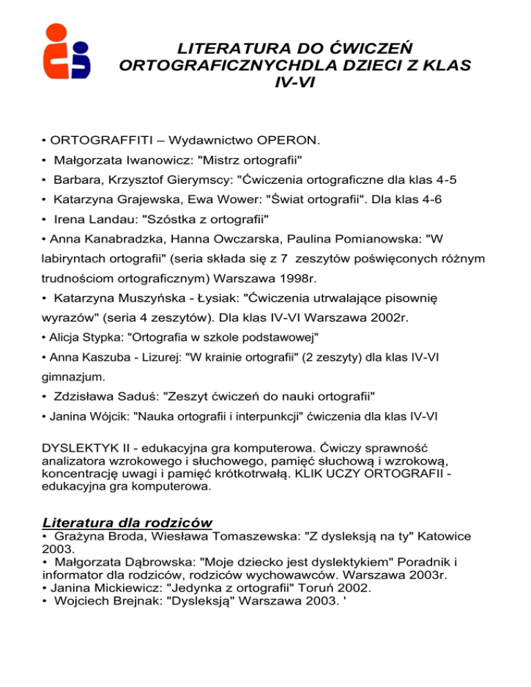 LITERATURA DO ĆWICZEŃ ORTOGRAFICZNYCHDLA DZIECI Z KLAS IV-VI • ORTOGRAFFITI – Wydawnictwo OPERON. • Małgorzata Iwanowicz: "Mistrz ortografii" • Barbara, Krzysztof Gierymscy: "Ćwiczenia ortograficzne dla klas 4-5 • Katarzyna Grajewska, Ewa Wower: "Świat ortografii". Dla klas 4-6 • Irena Landau: "Szóstka z ortografii" • Anna Kanabradzka, Hanna Owczarska, Paulina Pomianowska: "W labiryntach ortografii" (seria składa się z 7 zeszytów poświęconych różnym trudnościom ortograficznym) Warszawa 1998r. • Katarzyna Muszyńska - Łysiak: "Ćwiczenia utrwalające pisownię wyrazów" (seria 4 zeszytów). Dla klas IV-VI Warszawa 2002r. • Alicja Stypka: "Ortografia w szkole podstawowej" • Anna Kaszuba - Lizurej: "W krainie ortografii" (2 zeszyty) dla klas IV-VI gimnazjum. • Zdzisława Saduś: "Zeszyt ćwiczeń do nauki ortografii" • Janina Wójcik: "Nauka ortografii i interpunkcji" ćwiczenia dla klas IV-VI DYSLEKTYK II - edukacyjna gra komputerowa. Ćwiczy sprawność analizatora wzrokowego i słuchowego, pamięć słuchową i wzrokową, koncentrację uwagi i pamięć krótkotrwałą. KLIK UCZY ORTOGRAFII edukacyjna gra komputerowa. Literatura dla rodziców • Grażyna Broda, Wiesława Tomaszewska: "Z dysleksją na ty" Katowice 2003. • Małgorzata Dąbrowska: "Moje dziecko jest dyslektykiem" Poradnik i informator dla rodziców, rodziców wychowawców. Warszawa 2003r. • Janina Mickiewicz: "Jedynka z ortografii" Toruń 2002. • Wojciech Brejnak: "Dysleksją" Warszawa 2003. '