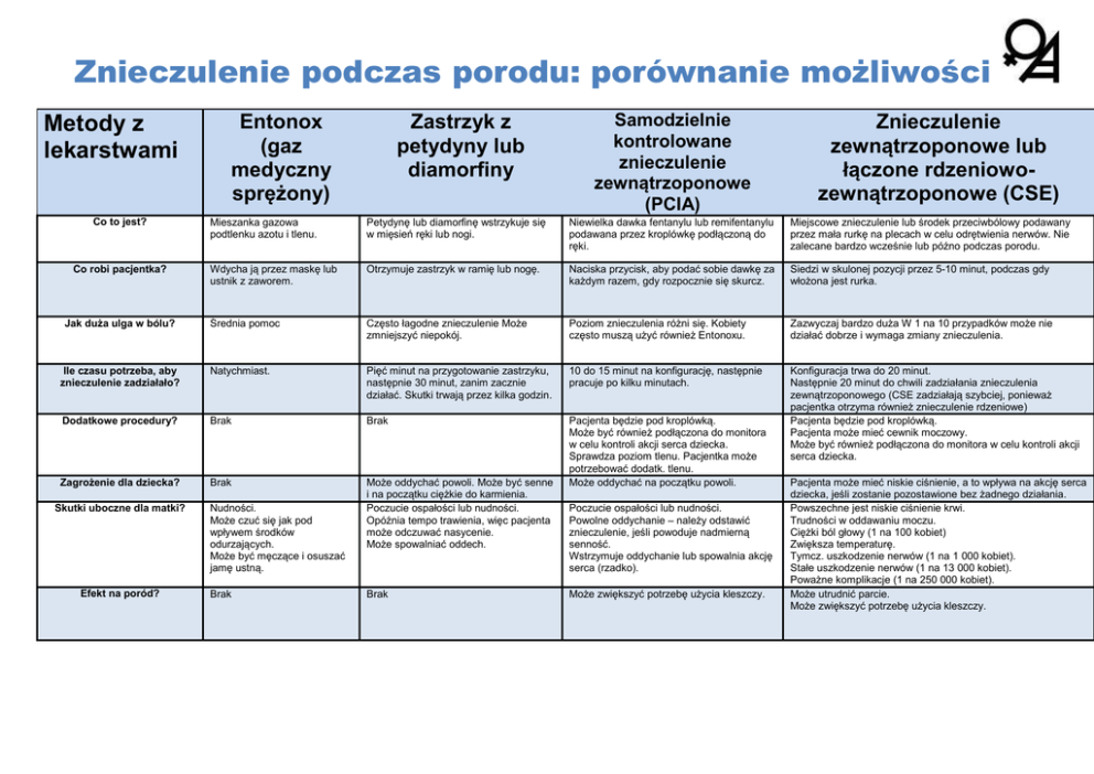 Znieczulenie podczas porodu: porównanie możliwości Metody z lekarstwami Entonox (gaz medyczny sprężony) Zastrzyk z petydyny lub diamorfiny Samodzielnie kontrolowane znieczulenie zewnątrzoponowe (PCIA) Znieczulenie zewnątrzoponowe lub łączone rdzeniowozewnątrzoponowe (CSE) Mieszanka gazowa podtlenku azotu i tlenu. Petydynę lub diamorfinę wstrzykuje się w mięsień ręki lub nogi. Niewielka dawka fentanylu lub remifentanylu podawana przez kroplówkę podłączoną do ręki. Miejscowe znieczulenie lub środek przeciwbólowy podawany przez mała rurkę na plecach w celu odrętwienia nerwów. Nie zalecane bardzo wcześnie lub późno podczas porodu. Wdycha ją przez maskę lub ustnik z zaworem. Otrzymuje zastrzyk w ramię lub nogę. Naciska przycisk, aby podać sobie dawkę za każdym razem, gdy rozpocznie się skurcz. Siedzi w skulonej pozycji przez 5-10 minut, podczas gdy włożona jest rurka. Średnia pomoc Często łagodne znieczulenie Może zmniejszyć niepokój. Poziom znieczulenia różni się. Kobiety często muszą użyć również Entonoxu. Zazwyczaj bardzo duża W 1 na 10 przypadków może nie działać dobrze i wymaga zmiany znieczulenia. Ile czasu potrzeba, aby znieczulenie zadziałało? Natychmiast. Pięć minut na przygotowanie zastrzyku, następnie 30 minut, zanim zacznie działać. Skutki trwają przez kilka godzin. 10 do 15 minut na konfigurację, następnie pracuje po kilku minutach. Dodatkowe procedury? Brak Brak Zagrożenie dla dziecka? Brak Może oddychać powoli. Może być senne i na początku ciężkie do karmienia. Poczucie ospałości lub nudności. Opóźnia tempo trawienia, więc pacjenta może odczuwać nasycenie. Może spowalniać oddech. Pacjenta będzie pod kroplówką. Może być również podłączona do monitora w celu kontroli akcji serca dziecka. Sprawdza poziom tlenu. Pacjentka może potrzebować dodatk. tlenu. Może oddychać na początku powoli. Konfiguracja trwa do 20 minut. Następnie 20 minut do chwili zadziałania znieczulenia zewnątrzoponowego (CSE zadziałają szybciej, ponieważ pacjentka otrzyma również znieczulenie rdzeniowe) Pacjenta będzie pod kroplówką. Pacjenta może mieć cewnik moczowy. Może być również podłączona do monitora w celu kontroli akcji serca dziecka. Co to jest? Co robi pacjentka? Jak duża ulga w bólu? Skutki uboczne dla matki? Efekt na poród? Nudności. Może czuć się jak pod wpływem środków odurzających. Może być męczące i osuszać jamę ustną. Brak Brak Poczucie ospałości lub nudności. Powolne oddychanie – należy odstawić znieczulenie, jeśli powoduje nadmierną senność. Wstrzymuje oddychanie lub spowalnia akcję serca (rzadko). Może zwiększyć potrzebę użycia kleszczy. Pacjenta może mieć niskie ciśnienie, a to wpływa na akcję serca dziecka, jeśli zostanie pozostawione bez żadnego działania. Powszechne jest niskie ciśnienie krwi. Trudności w oddawaniu moczu. Ciężki ból głowy (1 na 100 kobiet) Zwiększa temperaturę. Tymcz. uszkodzenie nerwów (1 na 1 000 kobiet). Stałe uszkodzenie nerwów (1 na 13 000 kobiet). Poważne komplikacje (1 na 250 000 kobiet). Może utrudnić parcie. Może zwiększyć potrzebę użycia kleszczy. Basen z wodą TENS Alternatywne terapie Co to jest? Basen lub wanna wypełniona gorącą wodą. Delikatny prąd elektryczny przepływa przez podkładki na plecach. Akupunktura, akupresura lub hipnoterapia. Co robi pacjentka? Leży w wodzie podczas porodu i przez chwilę po urodzeniu dziecka. Pacjentka naciska przycisk w celu kontroli prądu. Pacjentka musi umówić się z terapeutą, który będzie obecny podczas porodu. Może pomóc zrelaksować się i zmniejszyć nieco bóle podczas skurczów. Lekka Uczucie mrowienia pomaga zmniejszyć ból. Idealnie nadaje się do redukcji bólu pleców we wczesnej fazie porodu. Pięć minut do chwili założenia i skonfigurowania podkładek. Może pomóc zrelaksować się i zmniejszyć nieco bóle podczas skurczów. Brak Brak Brak Problemy z oddychaniem i infekcje przenoszone drogą wodną (rzadko). Brak Brak Brak Brak Brak Brak Brak Brak Metody fizyczne Jak duża ulga w bólu? Natychmiast. Ile czasu potrzeba, aby znieczulenie zadziałało? Dodatkowe procedury? Zagrożenie dla dziecka? Skutki uboczne dla matki? Efekt na poród? Działa w chwili rozpoczęcia terapii. Ulotka opublikowana przez Obstetric Anaesthetists ’ Association (OAA), 21 Portland Place, Londyn, Wielka Brytania, W1B 1PY. Telefon: +44 (0)20 7631 8883. Faks: +44 (0)20 7631 4352. Organizacja charytatywna zarejestrowana pod numerem 1111382. Nr rejestracji 5540014 (Anglia). Data publikacji: 05/10/14, wersja 4. Użyteczne źródła dla kobiet w ciąży, w tym na temat znieczulenia podczas porodu można znaleźć na stronie internetowej http://www.labourpains.com, zarządzanej przez OAA. Jesteśmy wdzięczni organizacji charytatywnej Translators without Borders za zapewnienie niniejszego tłumaczenia