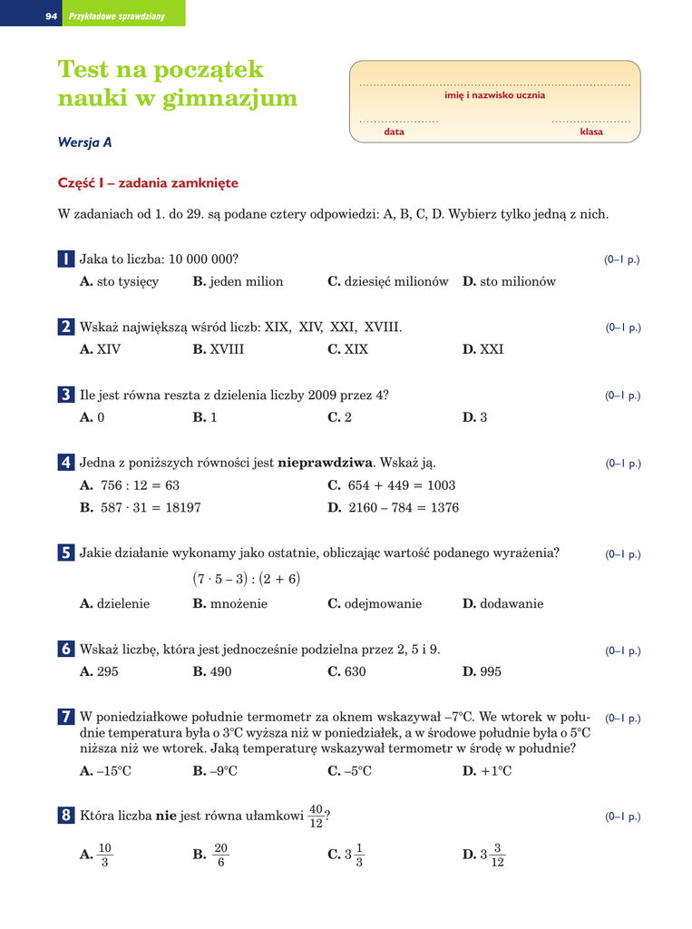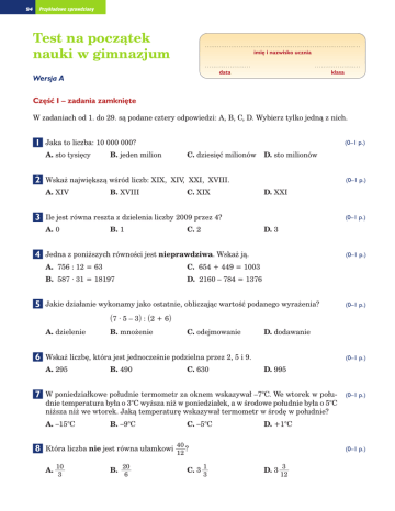 94 Przykładowe sprawdziany Test na poczàtek nauki w gimnazjum .............................................................................. imi´ i nazwisko ucznia ...................... data ...................... klasa Wersja A Cz´Êç I – zadania zamkni´te W zadaniach od 1. do 29. sà podane cztery odpowiedzi: A, B, C, D. Wybierz tylko jednà z nich. 1 Jaka to liczba: 10 000 000? A. sto tysi´cy 2 5 C. dziesi´ç milionów D. sto milionów B. XVIII C. XIX (0–1 p.) D. XXI Ile jest równa reszta z dzielenia liczby 2009 przez 4? A. 0 4 B. jeden milion Wska˝ najwi´kszà wÊród liczb: XIX, XIV, XXI, XVIII. A. XIV 3 (0–1 p.) B. 1 C. 2 (0–1 p.) D. 3 Jedna z poni˝szych równoÊci jest nieprawdziwa. Wska˝ jà. A. 756 : 12 = 63 C. 654 + 449 = 1003 B. 587 · 31 = 18197 D. 2160 – 784 = 1376 (0–1 p.) Jakie działanie wykonamy jako ostatnie, obliczajàc wartoÊç podanego wyra˝enia? (0–1 p.) (7 · 5 – 3) : (2 + 6) A. dzielenie 6 D. dodawanie B. 490 C. 630 (0–1 p.) D. 995 W poniedziałkowe południe termometr za oknem wskazywał –7°C. We wtorek w południe temperatura była o 3°C wy˝sza ni˝ w poniedziałek, a w Êrodowe południe była o 5°C ni˝sza ni˝ we wtorek. Jakà temperatur´ wskazywał termometr w Êrod´ w południe? A. –15°C 8 C. odejmowanie Wska˝ liczb´, która jest jednoczeÊnie podzielna przez 2, 5 i 9. A. 295 7 B. mno˝enie B. –9°C C. –5°C D. +1°C Która liczba nie jest równa ułamkowi 40 ? (0–1 p.) 12 A. 10 3 B. 20 6 (0–1 p.) C. 3 1 3 D. 3 3 12 Przykładowe sprawdziany 9 Jaka liczba odpowiada punktowi A zaznaczonemu na osi liczbowej? A. 1 B. 2 2 C. 0,6 3 10 Wska˝ postaç dziesi´tnà ułamka A. 0,999... (0–1 p.) D. 0,7 5 . 9 (0–1 p.) B. 0,595959... C. 0,454545... D. 0,555... 11 Jakà liczb´ otrzymamy po zaokràgleniu liczby 284,582 do pełnych dziesiàtek? A. 290 B. 280 C. 284,5 D. 284,6 12 Jedna z poni˝szych równoÊci jest nieprawdziwa. Wska˝ jà. (0–1 p.) A. 2 : 1 3 = 2 – 3 C. 3 · 4 · 5 = 1 + 1 B. 1 – 1 = 1 · 1 D. 7 + 7 = 7 · 7 5 3 4 4 5 3 4 (0–1 p.) 5 6 6 3 6 6 13 Plan miejscowoÊci Kocie Łapki ma kształt kwadratu o boku długoÊci 9 15 cm. Ile jest (0–1 p.) równe pole tego planu? A. 18 2 cm2 B. 36 4 cm2 5 C. 81 1 cm2 5 D. 84 16 cm2 25 25 14 Wska˝ diagram, w którym po wykonaniu działaƒ otrzymamy najwi´kszy wynik. 2 3 + A. 13 · B. C. 6 D. 41 : 21 = 5 7 + 5 8 = 1 3 · 12 13 = 6 10 – 11 = 2 4 3 1 3 – · 4 (0–1 p.) 4 6 15 Na widowni pewnego kina jest 12 rz´dów po x miejsc oraz 8 rz´dów po y miejsc. Ile miejsc jest na tej widowni? A. (12 + x) · (8 + y) C. 20 · (x + y) B. 12y + 8x D. 12x + 8y (0–1 p.) 95 96 Przykładowe sprawdziany 16 Rozwiàzaniem równania A. 3 3x + 0,5 = 15,5 jest liczba: B. 3,5 C. 5 (0–1 p.) D. 5,5 17 W wielokàcie przedstawionym na rysunku obok ka˝de (0–1 p.) dwa sàsiednie boki sà prostopadłe. Wska˝ par´ boków równoległych. A. JK i GH C. AB i FG B. ED i CD D. HI i JK 18 WÊród kàtów zaznaczonych na rysunku łukami sà oznaczone: (0–1 p.) A. 3 kàty ostre, 4 kàty rozwarte i 2 kàty proste B. 4 kàty ostre, 3 kàty rozwarte i 2 kàty proste C. 3 kàty ostre, 5 kàtów rozwartych i 1 kàt prosty D. 4 kàty ostre, 4 kàty rozwarte i 1 kàt prosty 19 Jeden z kàtów wierzchołkowych ma miar´ 50°. Jakà miar´ ma kàt przyległy do drugiego (0–1 p.) z tej pary kàtów wierzchołkowych? A. 50° B. 130° C. 180° D. 230° 20 W trójkàcie ostrokàtnym jeden z kàtów ma miar´ 25°. Inny kàt w tym trójkàcie mo˝e (0–1 p.) mieç miar´: A. 90° B. 72° C. 65° D. 59° 21 Na rysunku obok przedstawiono figur´ zło˝onà z kwadratu (0–1 p.) i dwóch trójkàtów równobocznych. Czy mo˝na ten rysunek dokoƒczyç tak, aby otrzymaç siatk´ pewnego ostrosłupa lub graniastosłupa? A. Mo˝na otrzymaç siatk´ graniastosłupa lub ostrosłupa. B. Mo˝na otrzymaç siatk´ ostrosłupa, ale nie mo˝na otrzymaç siatki graniastosłupa. C. Mo˝na otrzymaç siatk´ graniastosłupa, ale nie mo˝na otrzymaç siatki ostrosłupa. D. Nie mo˝na otrzymaç ani siatki graniastosłupa, ani siatki ostrosłupa. 22 Karton mleka ma wymiary 5 cm, 10 cm i 20 cm, a karton soku 8 cm, 10 cm i 13 cm. Wska˝ zdanie prawdziwe. A. Karton mleka ma wi´kszà obj´toÊç, ale mniejsze pole powierzchni ni˝ karton soku. B. Karton mleka ma wi´kszà obj´toÊç i wi´ksze pole powierzchni ni˝ karton soku. C. Karton mleka ma mniejszà obj´toÊç i mniejsze pole powierzchni ni˝ karton soku. D. Karton mleka ma mniejszà obj´toÊç, ale wi´ksze pole powierzchni ni˝ karton soku. (0–1 p.) Przykładowe sprawdziany 23 Wska˝ figur´, która ma najwi´ksze pole. A. figura I (0–1 p.) C. figura III B. figura II D. figura IV 24 W pewne upalne popołudnie zapytano 60 przypadkowo spotkanych osób, ile porcji lodów (0–1 p.) zjadły ju˝ dzisiaj. WÊród tych osób 30% nie zjadło ˝adnej porcji, 25% – jednà, 20% – dwie, a 15% – trzy porcje. Pozostałe osoby stwierdziły, ˝e zjadły wi´cej ni˝ trzy porcje lodów. Ile było tych osób? A. 6 B. 8 C. 10 D. 12 25 Wojtek rozpoczyna dziÊ zaj´cia o godzinie 8:55. Ma tylko 4 lekcje po 45 minut, a przerwy (0–1 p.) mi´dzy kolejnymi lekcjami trwajà po 10 minut. O której godzinie skoƒczy si´ ostatnia lekcja Wojtka? A. 11:55 B. 12:15 C. 12:25 D. 12:35 26 Wojtek narysował na mapie tras´, jakà przepłynàł ze swoim tatà ˝aglówkà po Jeziorze (0–1 p.) Mokrym. Trasa ta ma na mapie długoÊç 14 cm, a mapa jest sporzàdzona w skali 1 : 20 000. Ile kilometrów w rzeczywistoÊci liczy ta trasa? A. 2,8 km B. 3,5 km C. 5,6 km D. 7 km 27 Asia pokonała na rowerze stromy podjazd górski o długoÊci 2,5 km w czasie 20 minut. (0–1 p.) Na szczycie zawróciła i w czasie 10 minut dotarła z powrotem do miejsca, z którego wyruszyła. Jaka była Êrednia pr´dkoÊç Asi podczas całej tej przeja˝d˝ki? A. 2,5 km h B. 5 km h C. 7,5 km h D. 10 km h 28 Kostka do gry ma mas´ 2,5 g. Ile nale˝y wziàç takich kostek, aby ich łàczna masa b