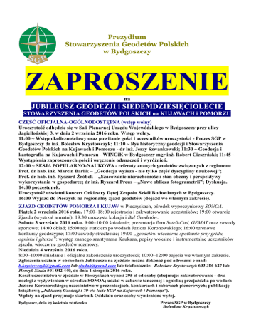 Prezydium Stowarzyszenia Geodetów Polskich w Bydgoszczy ZAPROSZENIE na JUBILEUSZ GEODEZJI i SIEDEMDZIESIĘCIOLECIE STOWARZYSZENIA GEODETÓW POLSKICH na KUJAWACH i POMORZU CZĘŚĆ OFICJALNA-OGÓLNODOSTĘPNA (wstęp wolny) Uroczystość odbędzie się w Sali Plenarnej Urzędu Wojewódzkiego w Bydgoszczy przy ulicy Jagiellońskiej 3, w dniu 2 września 2016 roku. Wstęp wolny. 11:00 ~ Wstęp okolicznościowy oraz powitanie gości i uczestników uroczystości - Prezes SGP w Bydgoszczy dr inż. Bolesław Krystowczyk; 11:10 ~ Rys historyczny geodezji i Stowarzyszenia Geodetów Polskich na Kujawach i Pomorzu - dr inż. Jerzy Szwankowski; 11:30 ~ Geodezja i kartografia na Kujawach i Pomorzu - WINGiK w Bydgoszczy mgr inż. Robert Cieszyński; 11:45 ~ Wystąpienia zaproszonych gości i wręczenie odznaczeń i wyróżnień. 12:00 ~ SESJA POPULARNO-NAUKOWA - referaty znanych geodetów związanych z regionem: Prof. dr hab. inż. Marcin Barlik – „Geodezja wyższa - nie tylko część dyscypliny naukowej”; Prof. dr hab. inż. Ryszard Źróbek – „Szacowanie nieruchomości: stan obecny i perspektywy wykorzystania w gospodarce; dr inż. Ryszard Preus – „Nowe oblicza fotogrametrii”; Dyskusja. 14:00 poczęstunek. Uroczystość uświetni koncert Orkiestry Dętej Zespołu Szkół Budowlanych w Bydgoszczy. 16:00 Wyjazd do Pieczysk na regionalny zjazd geodetów (dojazd we własnym zakresie). ZJAZD GEODETÓW POMORZA I KUJAW w Pieczyskach, ośrodek wypoczynkowy SONOA. Piątek 2 września 2016 roku. 17:00–18:00 rejestracja i zakwaterowanie uczestników; 19:00 otwarcie Zjazdu (wystrzał armatni); 19:30 uroczysta kolacja i Bal Geodetów. Sobota 3 września 2016 roku. 9:00–10:00 śniadanie; prezentacja firm Satell-Cad, GEMAT oraz zawody sportowe; 14:00 obiad; 15:00 rejs statkiem po wodach Jeziora Koronowskiego; 16:00 terenowe konkursy geodezyjne; 17:00 zawody strzeleckie; 19:00 „geodetów wieczorne spotkanie przy grillu, ognisku i gitarze”: występ znanego szantymana Kaukaza, popisy wokalne i instrumentalne uczestników zjazdu, wieczorne geodetów rozmowy. Niedziela 4 września 2016 roku. 8:00–10:00 śniadanie i oficjalne zakończenie uroczystości; 10:00–12:00 zajęcia we własnym zakresie. Zgłoszenia udziału w obchodach Jubileuszu na zjeździe można dokonać pod adresami e-mail: [email protected] lub [email protected] lub telefonicznie: Bolesław Krystowczyk 603 386 627 lub Henryk Siuda 501 042 440, do dnia 1 sierpnia 2016 roku. Koszt uczestnictwa w zjeździe w Pieczyskach wynosi 295 zł od osoby (obejmuje: zakwaterowanie - dwa noclegi z wyżywieniem w ośrodku SONOA; udział w zabawie tanecznej i ognisku; przejażdżka po wodach Jeziora Koronowskiego; uczestnictwo w prezentacjach, konkursach i zabawach plenerowych; publikację książkową „Jubileusz Geodezji i 70-cio lecie SGP na Kujawach i Pomorzu”). Wpłaty na zjazd przyjmuje skarbnik Oddziału oraz osoby wymienione wyżej. Bydgoszcz, dnia 25 kwietnia 2016 roku Prezes SGP w Bydgoszczy Bolesław Krystowczyk