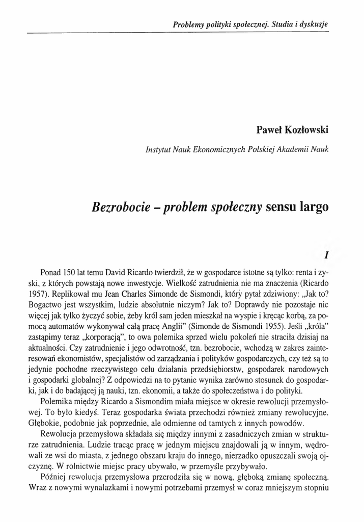 Problemy polityki społecznej. Studia i dyskusje Paweł Kozłowski Instytut Nauk Ekonomicznych Polskiej Akademii Nauk Bezrobocie - problem społeczny sensu largo i Ponad 150 lat temu David Ricardo twierdził, że w gospodarce istotne są tylko: renta i zy ski, z których powstają nowe inwestycje. Wielkość zatrudnienia nie ma znaczenia (Ricardo 1957). Replikował mu Jean Charles Simonde de Sismondi, który pytał zdziwiony: „Jak to? Bogactwo jest wszystkim, ludzie absolutnie niczym? Jak to? Doprawdy nie pozostaje nic więcej jak tylko życzyć sobie, żeby król sam jeden mieszkał na wyspie i kręcąc korbą, za po mocą automatów wykonywał całą pracę Anglii” (Simonde de Sismondi 1955). Jeśli „króla” zastąpimy teraz „korporacją”, to owa polemika sprzed wielu pokoleń nie straciła dzisiaj na aktualności. Czy zatrudnienie i jego odwrotność, tzn. bezrobocie, wchodzą w zakres zainte resowań ekonomistów, specjalistów od zarządzania i polityków gospodarczych, czy też są to jedynie pochodne rzeczywistego celu działania przedsiębiorstw, gospodarek narodowych i gospodarki globalnej? Z odpowiedzi na to pytanie wynika zarówno stosunek do gospodar ki, jak i do badającej ją nauki, tzn. ekonomii, a także do społeczeństwa i do polityki. Polemika między Ricardo a Sismondim miała miejsce w okresie rewolucji przemysło wej. To było kiedyś. Teraz gospodarka świata przechodzi również zmiany rewolucyjne. Głębokie, podobnie jak poprzednie, ale odmienne od tamtych z innych powodów. Rewolucja przemysłowa składała się między innymi z zasadniczych zmian w struktu rze zatrudnienia. Ludzie tracąc pracę w jednym miejscu znajdowali ją w innym, wędro wali ze wsi do miasta, z jednego obszaru kraju do innego, nierzadko opuszczali swoją oj czyznę. W rolnictwie miejsc pracy ubywało, w przemyśle przybywało. Później rewolucja przemysłowa przerodziła się w nową, głęboką zmianę społeczną. Wraz z nowymi wynalazkami i nowymi potrzebami przemysł w coraz mniejszym stopniu 10 Paweł Kozłowski był czynnikiem decydującym o nowoczesności. Ważniejszy stawał się sektor trzeci, tzn. usługi. Tak jak w okresie rewolucji przemysłowej czerpał siłę roboczą z rolnictwa, tak później kurczenie się zatrudnienia w przemyśle rekompensowane było wielkim wzrostem zapotrzebowania na pracę w usługach. Szybko przybywało nauczycieli, prawników, pie lęgniarek i lekarzy. Coraz więcej było urzędników, strażników, policjantów, architektów, pokojówek i nianiek, pracowników banków i poczty, pilotów i ratowników. Wzrost był bardzo duży. W 1870 r. w skali świata w usługach pracowało 3 min, w 1990 roku - 90 min osób. Wielkość sektora usług była wyrazem nowoczesności społeczeństwa. Teraz i to się zmienia. Wkroczyliśmy wyraźnie w ostatnie dziesięciolecie minionego wieku, w nową rewolucję technologiczną. Rodzi się społeczeństwo informatyczne. Dziś wszystkie trzy tradycyjne sektory gospodarki - rolnictwo, przemysł i usługi - skazują lu dzi na bezrobocie. Kurczą się, gdyż wynalazki z dziedziny elektroniki, a także zapowie dzi wdrożenia do technologii wynalazków z mikrobiologii powodują, że miejsc dla pracy ludzkiej ubywa. Co prawda i tym razem, podobnie jak poprzednio, powstaje nowy sektor. Teraz o obliczu nowych czasów decyduje sektor naukowo-techniczny. Tworzą go nau kowcy, technicy, programiści, konsultanci, menedżerowie i eksperci. Ale jest to sektor niewielki, elitarny, w którym zarobki są wysokie, lecz ludzi w nim pracujących niewielu. Jego liczebność i możliwości rozrastania się w żadnym stopniu nie rekompensują zmniej szania się trzech sektorów tradycyjnych, zwłaszcza przemysłu i usług, bo w rolnictwie w rozwiniętych krajach pracuje już i tak bardzo mało osób. Ludzi, w stosunku do miejsc pracy jest zbyt dużo. W połowie lat dziewięćdziesiątych bezrobocie w świecie osiągnęło w stosunku do czasów wielkiej depresji lat trzydziestych najwyższy poziom. Ponad 800 min ludzi w wieku produkcyjnym było bez pracy lub pra cowało w niepełnym wymiarze, a więc miało pracy za mało, dochodów z pracy też za ma ło, za to czasu zbędnego zbyt dużo. Rewolucja technologiczna nie odbywa się w pustce społecznej. Drugim, nie mniej waż nym procesem jest ciągły wzrost demograficzny, duży przyrost naturalny w krajach ubo gich, przedłużanie się życia w krajach bogatych. Spotkanie się tych dwóch tendencji: tech nologicznej i demograficznej, rodzi napięcia, które są podobne do rowów tektonicznych w skorupie ziemskiej - mogą wpływać na położenie całych kontynentów. Jeremy Rifkin stwierdza dobitnie:,Uderzenie między presją zaludnienia a coraz mniejszymi szansami za trudnienia będzie kształtowało geopolitykę nowej gospodarki nowoczesnych technologii przez pierwsze dekady nowego stulecia” (Rifkin 2001: 265). To zderzenie już tworzy współczesny obraz świata. Składa się na niego kilka elemen tów. Świat staje się coraz bardziej spolaryzowany. Są biedne i bogate jego regiony, w ra mach poszczególnych krajów zamożne i ubogie strefy, ludzie, którym zaokrągla się syl wetka z nadmiaru jedzenia, i ludzie, którym puchną brzuchy z głodu. Społeczeństwo dzie li się na tych, którzy są zatrudnieni, na bezrobotnych i na wykluczonych, czyli zbędnych. Wykluczeni to odrębna kategoria niż bezrobotni - oni są teraz nie tylko poza rynkiem pra cy, oni w gruncie rzeczy znaleźli się poza społeczeństwem. Tworzą się getta najbogat szych i - z drugiej strony - najbiedniejszych. Jednych ochraniają prywatne policje, kame ry i helikoptery, inni żyją pod osłoną nieba. Bezrobocie - problem społeczny sensu largo 11 Bezrobotni, tak lekceważeni przez Ricardo, byli niegdyś w nieporównanie lepszej sy tuacji materialnej niż wykluczeni w wielu krajach współczesnych. Tamci nie byli samot ni. Troszczyły się o nich specjalne organizacje, powstawały związki zawodowe