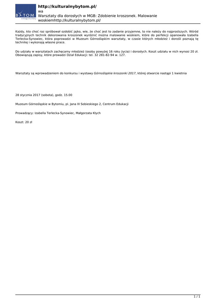 http://kulturalnybytom.pl/ wa Warsztaty dla dorosłych w MGB: Zdobienie kroszonek. Malowanie woskiemhttp://kulturalnybytom.pl/ Każdy, kto choć raz spróbował ozdobić jajko, wie, że choć jest to zadanie przyjemne, to nie należy do najprostszych. Wśród tradycyjnych technik dekorowania kroszonek wyróżnić można malowanie woskiem, które do perfekcji opanowała Izabella Terlecka-Synowiec, która poprowadzi w Muzeum Górnośląskim warsztaty, w czasie których młodzież i dorośli poznają tę technikę i wykonają własne prace. Do udziału w warsztatach zachęcamy młodzież (osoby powyżej 16 roku życia) i dorosłych. Koszt udziału w nich wynosi 20 zł. Obowiązują zapisy, które prowadzi Dział Edukacji: tel. 32 281-82-94 w. 127. Warsztaty są wprowadzeniem do konkursu i wystawy Górnośląskie kroszonki 2017, której otwarcie nastąpi 1 kwietnia 28 stycznia 2017 (sobota), godz. 15.00 Muzeum Górnośląskie w Bytomiu, pl. Jana III Sobieskiego 2, Centrum Edukacji Prowadzący: Izabella Terlecka-Synowiec, Małgorzata Kłych Koszt: 20 zł 1/1 Powered by TCPDF (www.tcpdf.org)
