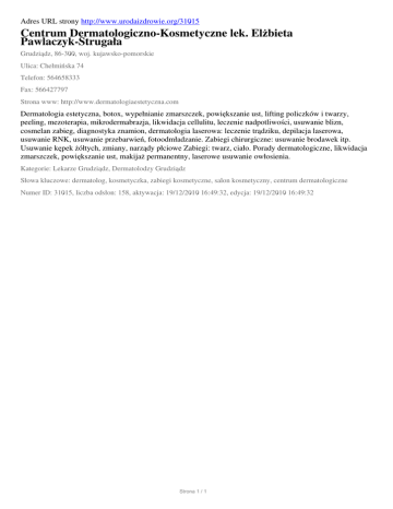 Adres URL strony http://www.urodaizdrowie.org/31015 Centrum Dermatologiczno-Kosmetyczne lek. Elżbieta Pawlaczyk-Strugała Grudziądz, 86-300, woj. kujawsko-pomorskie Ulica: Chełmińska 74 Telefon: 564658333 Fax: 566427797 Strona www: http://www.dermatologiaestetyczna.com Dermatologia estetyczna, botox, wypełnianie zmarszczek, powiększanie ust, lifting policzków i twarzy, peeling, mezoterapia, mikrodermabrazja, likwidacja cellulitu, leczenie nadpotliwości, usuwanie blizn, cosmelan zabieg, diagnostyka znamion, dermatologia laserowa: leczenie trądziku, depilacja laserowa, usuwanie RNK, usuwanie przebarwień, fotoodmładzanie. Zabiegi chirurgiczne: usuwanie brodawek itp. Usuwanie kępek żółtych, zmiany, narządy płciowe Zabiegi: twarz, ciało. Porady dermatologiczne, likwidacja zmarszczek, powiększanie ust, makijaż permanentny, laserowe usuwanie owłosienia. Kategorie: Lekarze Grudziądz, Dermatolodzy Grudziądz Słowa kluczowe: dermatolog, kosmetyczka, zabiegi kosmetyczne, salon kosmetyczny, centrum dermatologiczne Numer ID: 31015, liczba odsłon: 158, aktywacja: 19/12/2010 16:49:32, edycja: 19/12/2010 16:49:32 Strona 1 / 1