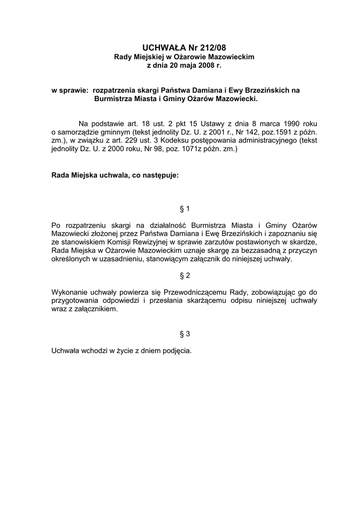 UCHWAŁA Nr 212/08 Rady Miejskiej w OŜarowie Mazowieckim z dnia 20 maja 2008 r. w sprawie: rozpatrzenia skargi Państwa Damiana i Ewy Brzezińskich na Burmistrza Miasta i Gminy OŜarów Mazowiecki. Na podstawie art. 18 ust. 2 pkt 15 Ustawy z dnia 8 marca 1990 roku o samorządzie gminnym (tekst jednolity Dz. U. z 2001 r., Nr 142, poz.1591 z późn. zm.), w związku z art. 229 ust. 3 Kodeksu postępowania administracyjnego (tekst jednolity Dz. U. z 2000 roku, Nr 98, poz. 1071z późn. zm.) Rada Miejska uchwala, co następuje: §1 Po rozpatrzeniu skargi na działalność Burmistrza Miasta i Gminy OŜarów Mazowiecki złoŜonej przez Państwa Damiana i Ewę Brzezińskich i zapoznaniu się ze stanowiskiem Komisji Rewizyjnej w sprawie zarzutów postawionych w skardze, Rada Miejska w OŜarowie Mazowieckim uznaje skargę za bezzasadną z przyczyn określonych w uzasadnieniu, stanowiącym załącznik do niniejszej uchwały. §2 Wykonanie uchwały powierza się Przewodniczącemu Rady, zobowiązując go do przygotowania odpowiedzi i przesłania skarŜącemu odpisu niniejszej uchwały wraz z załącznikiem. §3 Uchwała wchodzi w Ŝycie z dniem podjęcia. Załącznik do Uchwały Nr 212/08 Rady Miejskiej w OŜarowie Mazowieckim z dnia 20 maja 2008r. OŜarów Mazowiecki, dnia 16 kwietnia 2008 roku Stanowisko Komisji Rewizyjnej w sprawie skargi na działalność Burmistrza złoŜonej dnia 13 lutego 2008 roku przez państwa Brzezińskich Zgodnie z art. 227 Kodeksu postępowania administracyjnego (Dz. U. z 2000 roku, Nr 98, poz. 1071 – tekst jednolity), Komisja Rewizyjna po zapoznaniu się z treścią Skargi Państwa Brzezińskich z dnia 13 lutego 2008 roku, przekazaną przez przewodniczącego Rady do rozpoznania celem stwierdzenia zasadności skargi na Burmistrza Miasta i Gminy OŜarów Mazowiecki, niniejszym przedstawia swoje stanowisko w przedmiotowej sprawie: W skardze z dnia 13 lutego 2008 roku Państwo Brzezińscy podnieśli, Ŝe postępowanie w ich sprawie prowadzone jest biurokratycznie poprzez zaniedbania, nadto niezgodnie z prawem, naruszając tym samym praworządność, oraz prawa i interesy skarŜących. W pierwszej kolejności pragniemy przedstawić zebrane przez nas ustalenia faktyczne i prawne, a następnie odnieść się do zasadności przedstawionych przez Państwa Brzezińskich zastrzeŜeń. Państwo Brzezińscy w dniu 3 marca 2003r. złoŜyli wniosek o wydanie decyzji o warunkach zabudowy i zagospodarowania terenu dla działki pod budowę budynku mieszkalnego jednorodzinnego. Zgodnie z ustaleniami ówcześnie obowiązującego miejscowego planu ogólnego zagospodarowania przestrzennego Gminy OŜarów Mazowiecki (uchwała nr 35/94 Rady Miejskiej w OŜarowie Mazowieckim z dnia 15 listopada 1994r.) teren działki nr ew. 113/2 połoŜonej Płochocinie znajdował się na terenie rolno- osadniczym. Zgodnie z zapisami tamtego planu, istniała moŜliwość „…formowania nowej zabudowy zagrodowej odpowiadającej wielkością i charakterem prowadzonej działalności rolniczej pod warunkiem zachowania ładu przestrzennego i minimum obszarowego, które wynosi 2,0ha (fizyczne) uŜytków rolnych…” Po przeanalizowaniu akt sprawy została wydana decyzja o odmowie ustalenia decyzji o zabudowie, ze względu na niespełnienie warunków zapisu planu, dotyczących powierzchni. Państwo Brzezińscy odwołali się od decyzji odmownej i sprawa za pośrednictwem Burmistrza została skierowana do Samorządowego Kolegium Odwoławczego w Warszawie wraz z kompletem akt sprawy w dniu 4 kwietnia 2003r. Samorządowe Kolegium Odwoławcze decyzję Burmistrza uchyliło i przekazało sprawę do ponownego rozpatrzenia organowi I instancji. W ślad decyzji SKO został sporządzony projekt decyzji o warunkach zabudowy oraz analiza terenu, zgodnie z zapisami ustawy o planowaniu i zagospodarowaniu przestrzennym (wniosek o warunki zabudowy został złoŜony w czasie obowiązywania planu zagospodarowania, plan obowiązywał do 1 stycznia 2004r.) Pismem przewodnim Burmistrz Miasta i Gminy wysłał projekt decyzji, zgodnie z ustawą do innych organów celem zaopiniowania, o warunkach zabudowy do uzgodnień zgodnie z art. 53 ust .4, art. 60 ust. 2 ustawy o planowaniu i zagospodarowaniu przestrzennym – w dniu 4 czerwca 2004r. W trakcie uzyskiwania uzgodnień do przesłanego projektu decyzji o warunkach zabudowy, Państwo Brzezińscy odwołali się od postanowienia Burmistrza Miasta i Gminy OŜarów Mazowiecki w zakresie zarządcy dróg gminnych – sprawa została przekazana do SKO. Nowe uzgodnienie w zakresie dróg zostało wydane 15 kwietnia 2005r. Po uzyskaniu wszystkich pozytywnych uzgodnień, Burmistrz Miasta i Gminy OŜarów Mazowiecki wydał decyzję o warunkach zabudowy dla inwestycji polegającej na budowie budynku mieszkalnego na działce nr ew. 113/2 w Płochocinie. Decyzja została wydana 29 kwietnia 2005 roku. Po spotkaniu Państwa Brzezińskich z Panem Burmistrzem w styczniu 2008 roku, zostało przygotowane pismo, informujące o przygotowanej decyzji oraz o konieczności uiszczenia opłaty skarbowej za tą decyzję. Państwo Brzezińscy, w swoim piśmie z dnia 23 stycznia b.r. zaznaczyli, Ŝe Urząd nie przedstawia podstawy prawnej do Ŝądania uiszczenia opłaty skarbowej za ww. decyzję. W związku z powyŜszym Referat wystąpił do radcy prawnego Urzędu o opinię odnośnie konieczności uiszczenia takiej opłaty. Radca prawny podtrzymał stanowisko Referatu stwierdzające konieczność uiszczenia takiej opłaty skarbowej w wysokości 107zł. Takie stanowisko na piśmie zostało przesłane Państwu Brzezińskim w dniu 8 lutego 2008 roku. W odpowiedzi na pismo Burmistrza w dniu 13 lutego b.r. Państwo Brzezińscy złoŜyli skargę do Samorządowego Kolegium Odwoławczego. Zdaniem Referatu Planowania Przestrzennego i Budownictwa zostały zachowane wszystkie przepisy prawa. Z przedstawionego powyŜej materiału i stanowiska Referatu Planowania Przestrzennego i Budownictwa wynika, iŜ głównym zastrzeŜenie