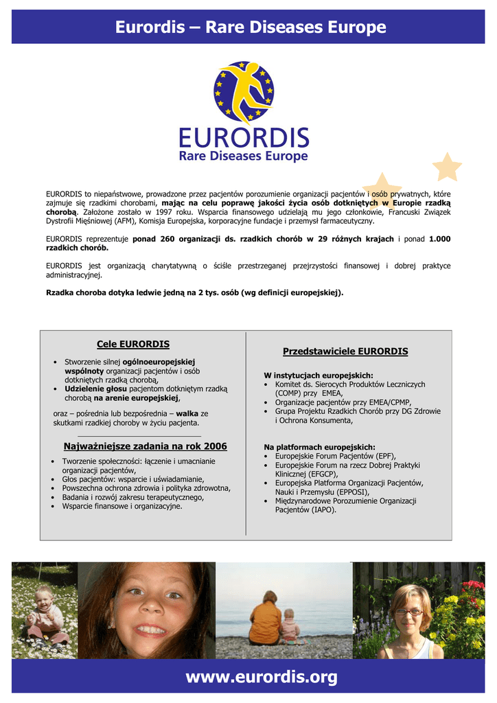Eurordis – Rare Diseases Europe EURORDIS to niepaństwowe, prowadzone przez pacjentów porozumienie organizacji pacjentów i osób prywatnych, które zajmuje się rzadkimi chorobami, mając na celu poprawę jakości życia osób dotkniętych w Europie rzadką chorobą. Założone zostało w 1997 roku. Wsparcia finansowego udzielają mu jego członkowie, Francuski Związek Dystrofii Mięśniowej (AFM), Komisja Europejska, korporacyjne fundacje i przemysł farmaceutyczny. EURORDIS reprezentuje ponad 260 organizacji ds. rzadkich chorób w 29 różnych krajach i ponad 1.000 rzadkich chorób. EURORDIS jest organizacją charytatywną o ściśle przestrzeganej przejrzystości finansowej i dobrej praktyce administracyjnej. Rzadka choroba dotyka ledwie jedną na 2 tys. osób (wg definicji europejskiej). Cele EURORDIS • • Przedstawiciele EURORDIS Stworzenie silnej ogólnoeuropejskiej wspólnoty organizacji pacjentów i osób dotkniętych rzadką chorobą, Udzielenie głosu pacjentom dotkniętym rzadką chorobą na arenie europejskiej, oraz – pośrednia lub bezpośrednia – walka ze skutkami rzadkiej choroby w życiu pacjenta. Najważniejsze zadania na rok 2006 • • • • • Tworzenie społeczności: łączenie i umacnianie organizacji pacjentów, Głos pacjentów: wsparcie i uświadamianie, Powszechna ochrona zdrowia i polityka zdrowotna, Badania i rozwój zakresu terapeutycznego, Wsparcie finansowe i organizacyjne. W instytucjach europejskich: • Komitet ds. Sierocych Produktów Leczniczych (COMP) przy EMEA, • Organizacje pacjentów przy EMEA/CPMP, • Grupa Projektu Rzadkich Chorób przy DG Zdrowie i Ochrona Konsumenta, Na platformach europejskich: • Europejskie Forum Pacjentów (EPF), • Europejskie Forum na rzecz Dobrej Praktyki Klinicznej (EFGCP), • Europejska Platforma Organizacji Pacjentów, Nauki i Przemysłu (EPPOSI), • Międzynarodowe Porozumienie Organizacji Pacjentów (IAPO). www.eurordis.org www.eurordis.org OSIĄGNIĘCIA Wsparcie i praca polityczna Powiązania i wymiana informacji • Ponad 260 członków w 29 krajach, • Strona internetowa w 6 językach, • Comiesięczny internetowy biuletyn informacyjny w 6 językach, • Ponad 450 organizacji pacjentów i 60 ochotników wspomagało działalność Eurordis w ostatnich 18 miesiącach, • Organizacja Europejskiej Konferencji o Rzadkich Chorobach (np. Dania 2001r., Francja 2003r., Luksemburg 2005r.), • Powiązania z 11 narodowymi porozumieniami, • Organizacja corocznych zjazdów członków (np. Hiszpania 2002r., Belgia 2003r., Irlandia 2004r., Włochy 2005r.). • Współpraca przy zatwierdzeniu rozporządzenia UE dotyczącego leków na rzadkie choroby w 1999 roku, • Wspieranie wszelkich działań, mających na celu nadanie na stałe rzadkim chorobom priorytetowej rangi w polityce zdrowotnej UE, • Wspieranie wszelkich działań, mających na celu nadanie rzadkim chorobom priorytetowej rangi w ramowym programie badawczym UE, • Lobbing na rzecz rozporządzenia UE dotyczącego leków dla dzieci. Dostęp do informacji, diagnozy, leczenia i opieki Badania i rozwój zakresu terapeutycznego • Współpraca w Komitecie ds. Sierocych Produktów Leczniczych (COMP) Europejskiej Agencji ds. Leków (EMEA) przy nadawaniu nazwy ponad 350 lekom na rzadkie choroby, • Współpraca w komitecie odpowiedzialnym za kontakty z organizacjami pacjentów (CPMP) Europejskiej Agencji ds. Leków (EMEA) w celu przystępnego i solidnego informowania pacjentów o lekach, • Utworzenie europejskiej siatki banków materiału biologicznego (EuroBioBank), gromadzących DNA, komórki i tkanki pacjentów dotkniętych rzadką chorobą, Ankiety o dostępie pacjentów do leków na rzadkie choroby w UE, • Współudział przy pozyskiwaniu środków UE na projekty badawcze dotyczące rzadkich chorób, Rejestracja profili i działalności europejskich organizacji pacjentów dotkniętych rzadką chorobą. • 20 firm farmaceutycznych udziela się przy Okrągłym Stole przedsiębiorstw, • Raporty ze spotkań na następujące tematy: „Dostęp pacjentów do ‚Compassionate Use‘“, „Alternatywne metody badań klinicznych“, „Stosunki między sponsorami a organizacjami pacjentów przy badaniach klinicznych dot. rzadkich chorób”, itd. • Wskazówki dotyczące tworzenia i zarządzania grup pacjentów i punktów informacyjnych na temat rzadkich chorób, • Ankiety naukowe o dostępie do opieki lekarskiej (8 rzadkich chorób, 70 organizacji, 17 krajów, 6000 odpowiedzi) i o dostępie do diagnozy i późnej diagnozie (8 rzadkich chorób, 70 organizacji, 17 krajów, 6000 odpowiedzi), • Programy szkoleniowe na temat protokołów badań klinicznych (12 spotkań, 170 uczestników, 137 organizacji) i na temat poszukiwania informacji w Internecie (6 spotkań, 100 uczestników, 58 organizacji), • • Platforma rzadkich chorób EURORDIS jest częścią platformy rzadkich chorób z siedzibą w Paryżu, wraz z: • • • • Alliance Maladies Rares GIS Institut des Maladies Rares Maladies Rares Info Service Orphanet European Organisation for Rare Diseases - Plateforme Maladies Rares 102 rue Didot – Paris 75014 – France Tel + 33 1 56 53 52 10 Fax + 33 1 56 53 52 15 Brussels office: Tel/fax + 32 2 733 81 10