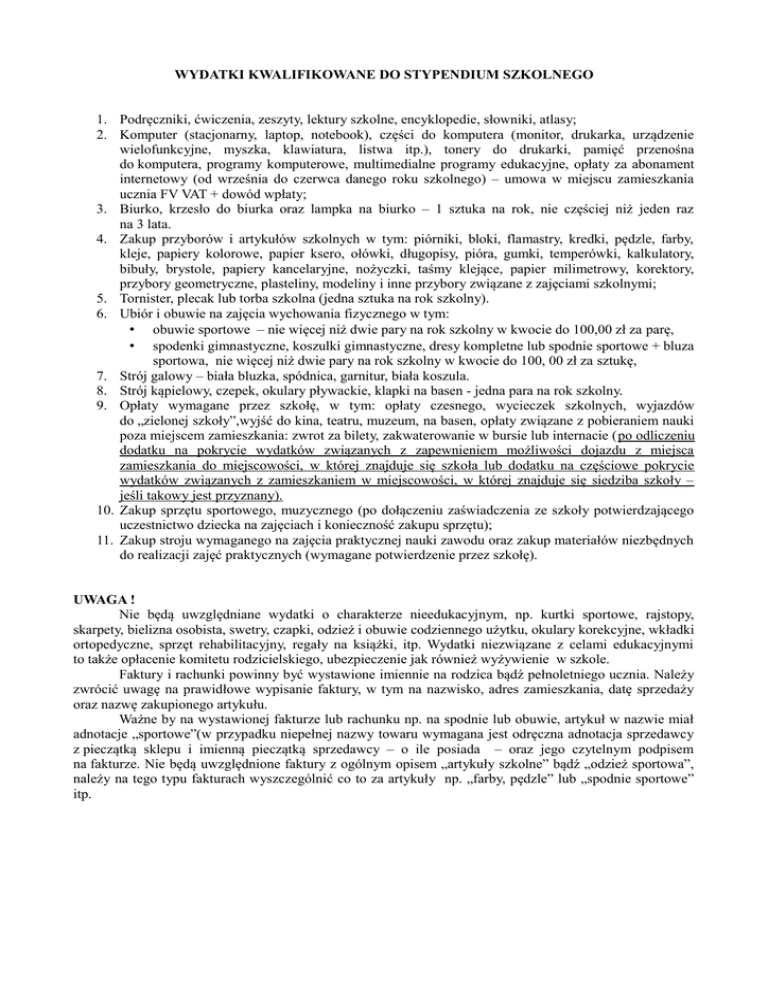 WYDATKI KWALIFIKOWANE DO STYPENDIUM SZKOLNEGO 1. Podręczniki, ćwiczenia, zeszyty, lektury szkolne, encyklopedie, słowniki, atlasy; 2. Komputer (stacjonarny, laptop, notebook), części do komputera (monitor, drukarka, urządzenie wielofunkcyjne, myszka, klawiatura, listwa itp.), tonery do drukarki, pamięć przenośna do komputera, programy komputerowe, multimedialne programy edukacyjne, opłaty za abonament internetowy (od września do czerwca danego roku szkolnego) – umowa w miejscu zamieszkania ucznia FV VAT + dowód wpłaty; 3. Biurko, krzesło do biurka oraz lampka na biurko – 1 sztuka na rok, nie częściej niż jeden raz na 3 lata. 4. Zakup przyborów i artykułów szkolnych w tym: piórniki, bloki, flamastry, kredki, pędzle, farby, kleje, papiery kolorowe, papier ksero, ołówki, długopisy, pióra, gumki, temperówki, kalkulatory, bibuły, brystole, papiery kancelaryjne, nożyczki, taśmy klejące, papier milimetrowy, korektory, przybory geometryczne, plasteliny, modeliny i inne przybory związane z zajęciami szkolnymi; 5. Tornister, plecak lub torba szkolna (jedna sztuka na rok szkolny). 6. Ubiór i obuwie na zajęcia wychowania fizycznego w tym: • obuwie sportowe – nie więcej niż dwie pary na rok szkolny w kwocie do 100,00 zł za parę, • spodenki gimnastyczne, koszulki gimnastyczne, dresy kompletne lub spodnie sportowe + bluza sportowa, nie więcej niż dwie pary na rok szkolny w kwocie do 100, 00 zł za sztukę, 7. Strój galowy – biała bluzka, spódnica, garnitur, biała koszula. 8. Strój kąpielowy, czepek, okulary pływackie, klapki na basen - jedna para na rok szkolny. 9. Opłaty wymagane przez szkołę, w tym: opłaty czesnego, wycieczek szkolnych, wyjazdów do „zielonej szkoły”,wyjść do kina, teatru, muzeum, na basen, opłaty związane z pobieraniem nauki poza miejscem zamieszkania: zwrot za bilety, zakwaterowanie w bursie lub internacie (po odliczeniu dodatku na pokrycie wydatków związanych z zapewnieniem możliwości dojazdu z miejsca zamieszkania do miejscowości, w której znajduje się szkoła lub dodatku na częściowe pokrycie wydatków związanych z zamieszkaniem w miejscowości, w której znajduje się siedziba szkoły – jeśli takowy jest przyznany). 10. Zakup sprzętu sportowego, muzycznego (po dołączeniu zaświadczenia ze szkoły potwierdzającego uczestnictwo dziecka na zajęciach i konieczność zakupu sprzętu); 11. Zakup stroju wymaganego na zajęcia praktycznej nauki zawodu oraz zakup materiałów niezbędnych do realizacji zajęć praktycznych (wymagane potwierdzenie przez szkołę). UWAGA ! Nie będą uwzględniane wydatki o charakterze nieedukacyjnym, np. kurtki sportowe, rajstopy, skarpety, bielizna osobista, swetry, czapki, odzież i obuwie codziennego użytku, okulary korekcyjne, wkładki ortopedyczne, sprzęt rehabilitacyjny, regały na książki, itp. Wydatki niezwiązane z celami edukacyjnymi to także opłacenie komitetu rodzicielskiego, ubezpieczenie jak również wyżywienie w szkole. Faktury i rachunki powinny być wystawione imiennie na rodzica bądź pełnoletniego ucznia. Należy zwrócić uwagę na prawidłowe wypisanie faktury, w tym na nazwisko, adres zamieszkania, datę sprzedaży oraz nazwę zakupionego artykułu. Ważne by na wystawionej fakturze lub rachunku np. na spodnie lub obuwie, artykuł w nazwie miał adnotacje „sportowe”(w przypadku niepełnej nazwy towaru wymagana jest odręczna adnotacja sprzedawcy z pieczątką sklepu i imienną pieczątką sprzedawcy – o ile posiada – oraz jego czytelnym podpisem na fakturze. Nie będą uwzględnione faktury z ogólnym opisem „artykuły szkolne” bądź „odzież sportowa”, należy na tego typu fakturach wyszczególnić co to za artykuły np. „farby, pędzle” lub „spodnie sportowe” itp.