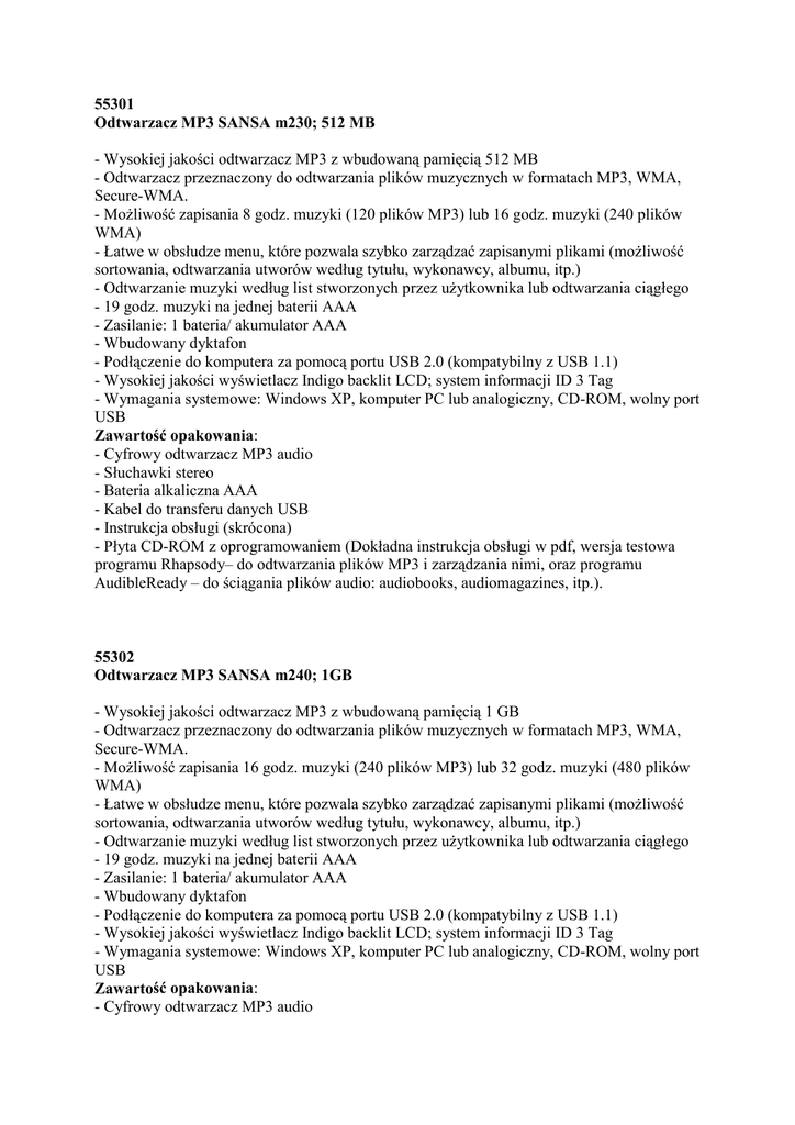 55301, 55302 odtwarzacze SANSA m230 512MB, 1GB